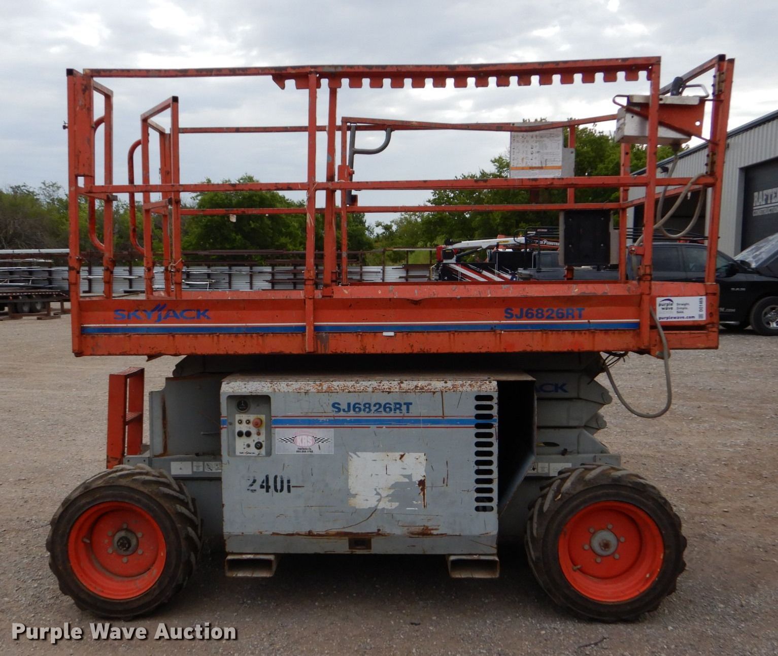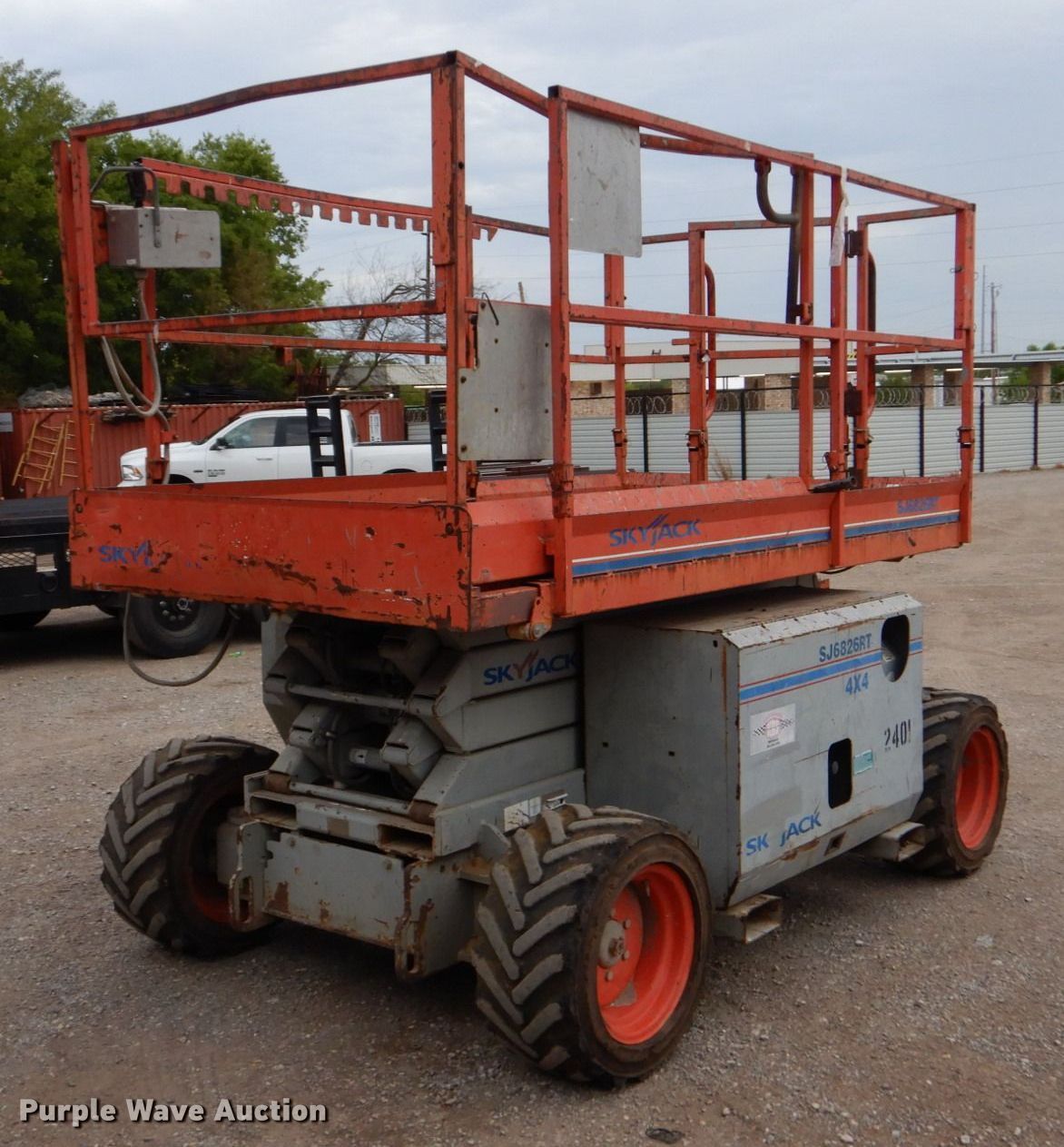 Purple Wave is selling a used Scissor or Vertical Lift in Texas. This item is a Skyjack SJ6826RT scissor lift with the following: Hours: 2,340 on meter, Serial: 370267