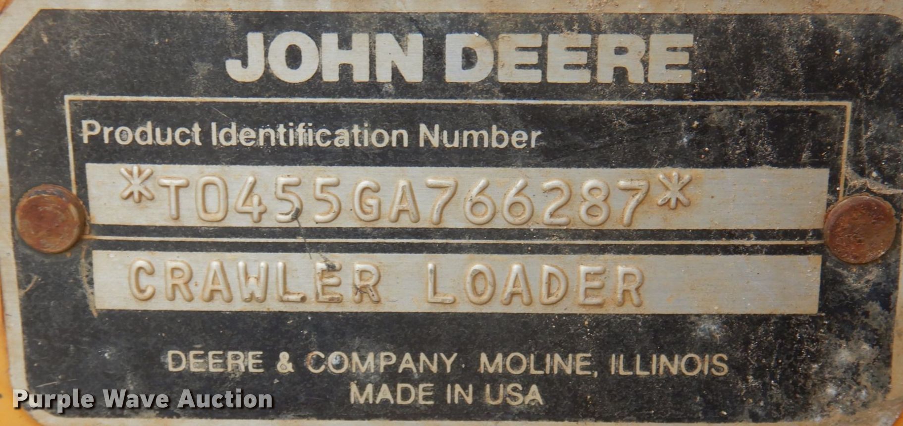 Purple Wave is selling a used Crawler Loader in Missouri. This item is a 1990 John Deere 455G track loader with the following: Hours: 9,885 on meter, Serial: T0455GA766287