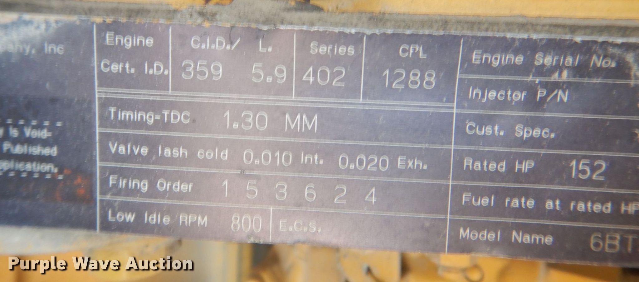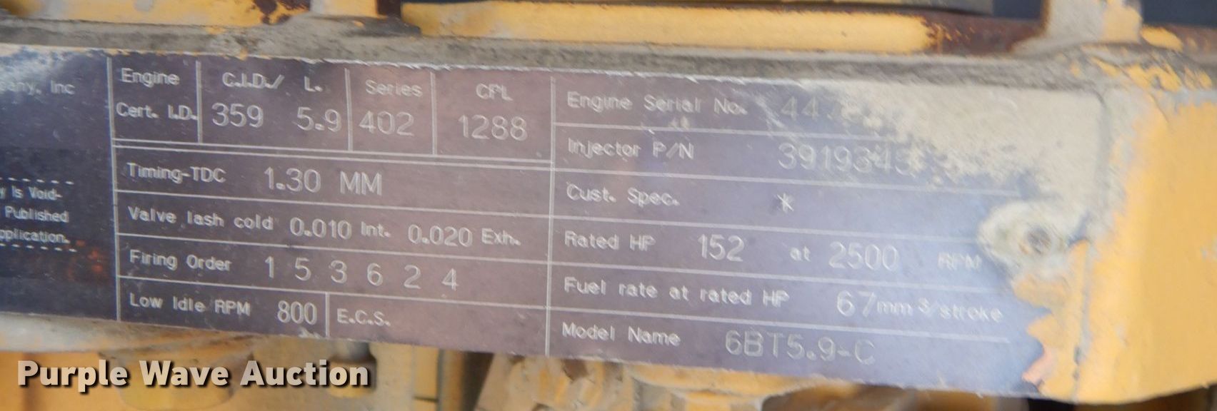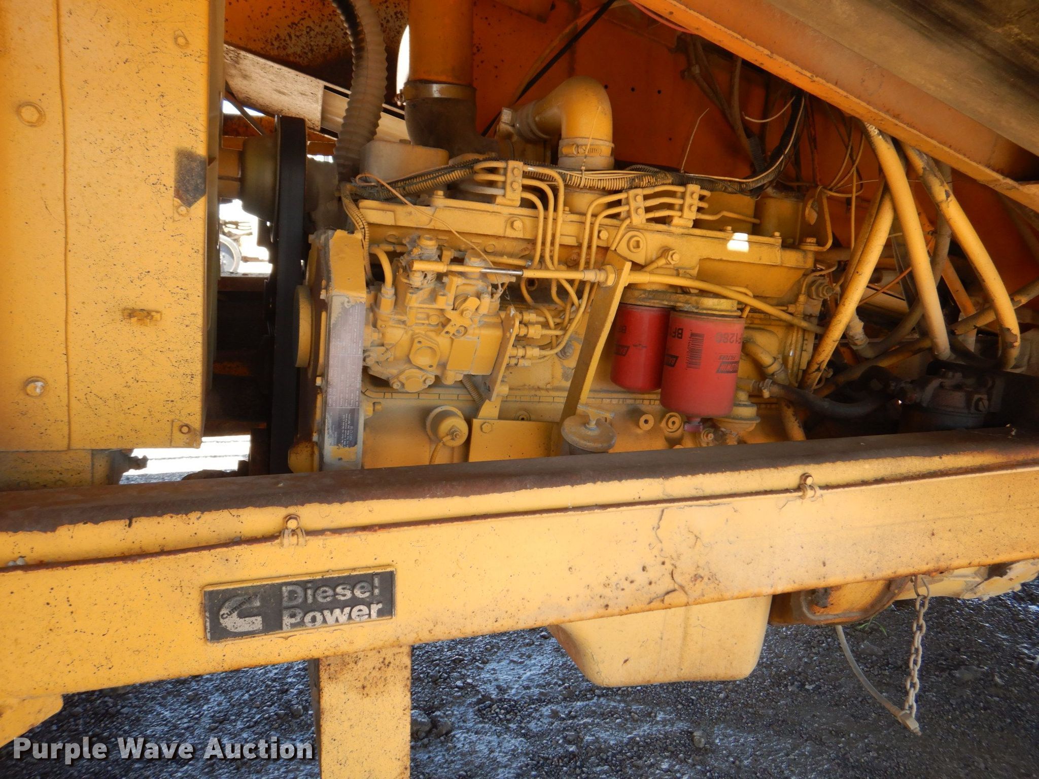 1991 Rosco Flaherty SPR-H chip spreader. Hours: 8,795 on meter, Serial: 32082. Engine Cummins 6BT, Displacement: 5.9L, Cylinders: 6, Fuel type: Diesel. Transmission Manual , Speeds: 5. Features Front spread hopper width: 13' Additional front spread hopper: 10' W, Material conveyors Width: 19", Rear hopper: 9' x 4'. Tires Size: 10.00R20. L.L. Pelling Company Inc.. 1425 W Penn St. North Liberty, IA 52317
