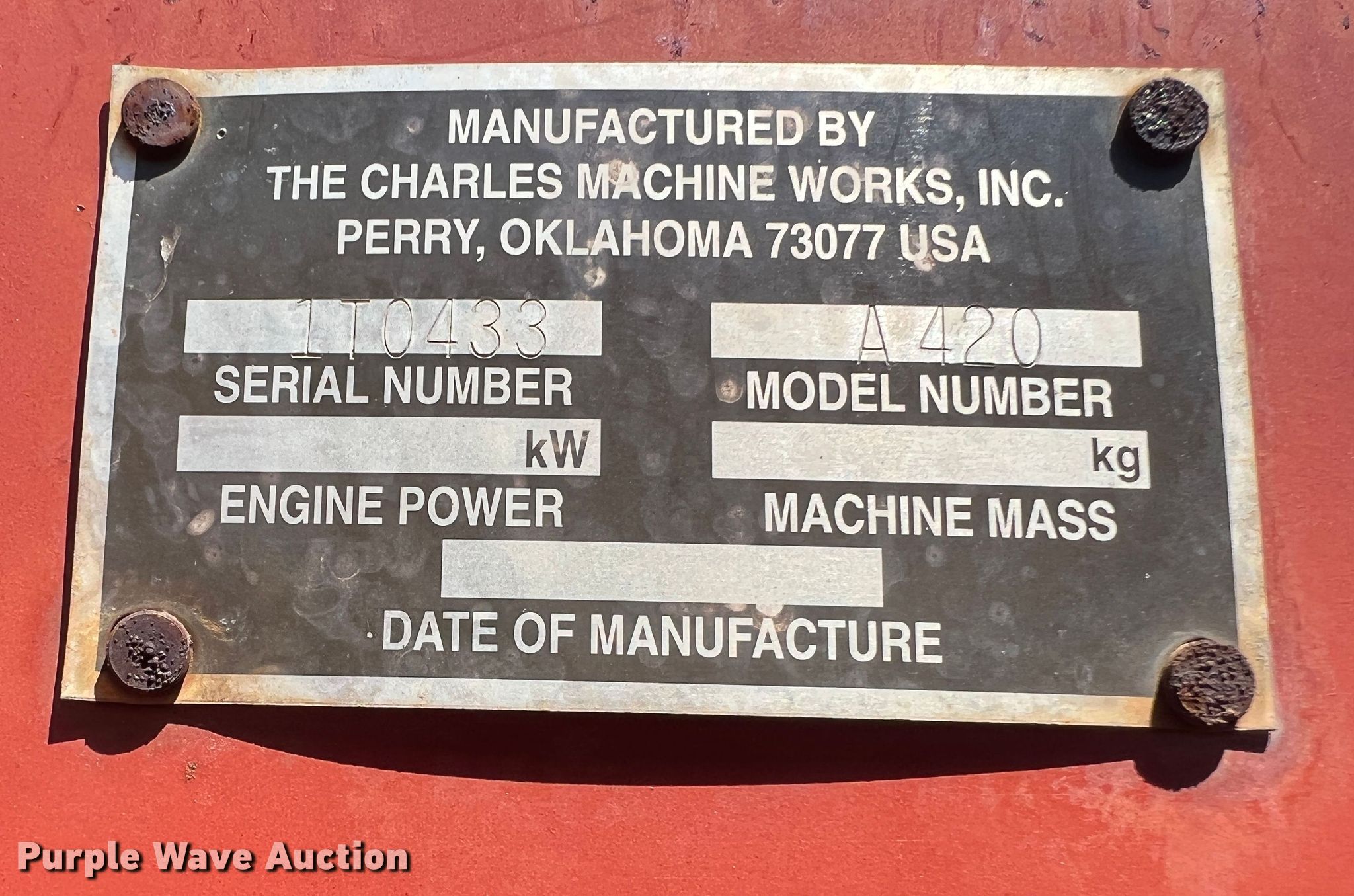 2000 Ditch Witch 5110 trencher. Hours: 1,030 on meter, Serial: 5T0001. Engine Cylinders: 3, Fuel type: Diesel. Transmission Two speed travel, Four wheel drive. Features Combination unit, Trencher Estimated dig depth: 84", Cutting width: 8", Teeth: Rock, Dirt, Vibratory plow Model: A450, Depth: 32", Backhoe Model: A420, Serial: 1T0433, Bucket width: 12", Backfill blade Width: 72". Tires Size: 31x15.50-15. Notes Non-operational unit. Dunlap Construction Co Inc.. 2227 W Mary. Garden City, KS 67846