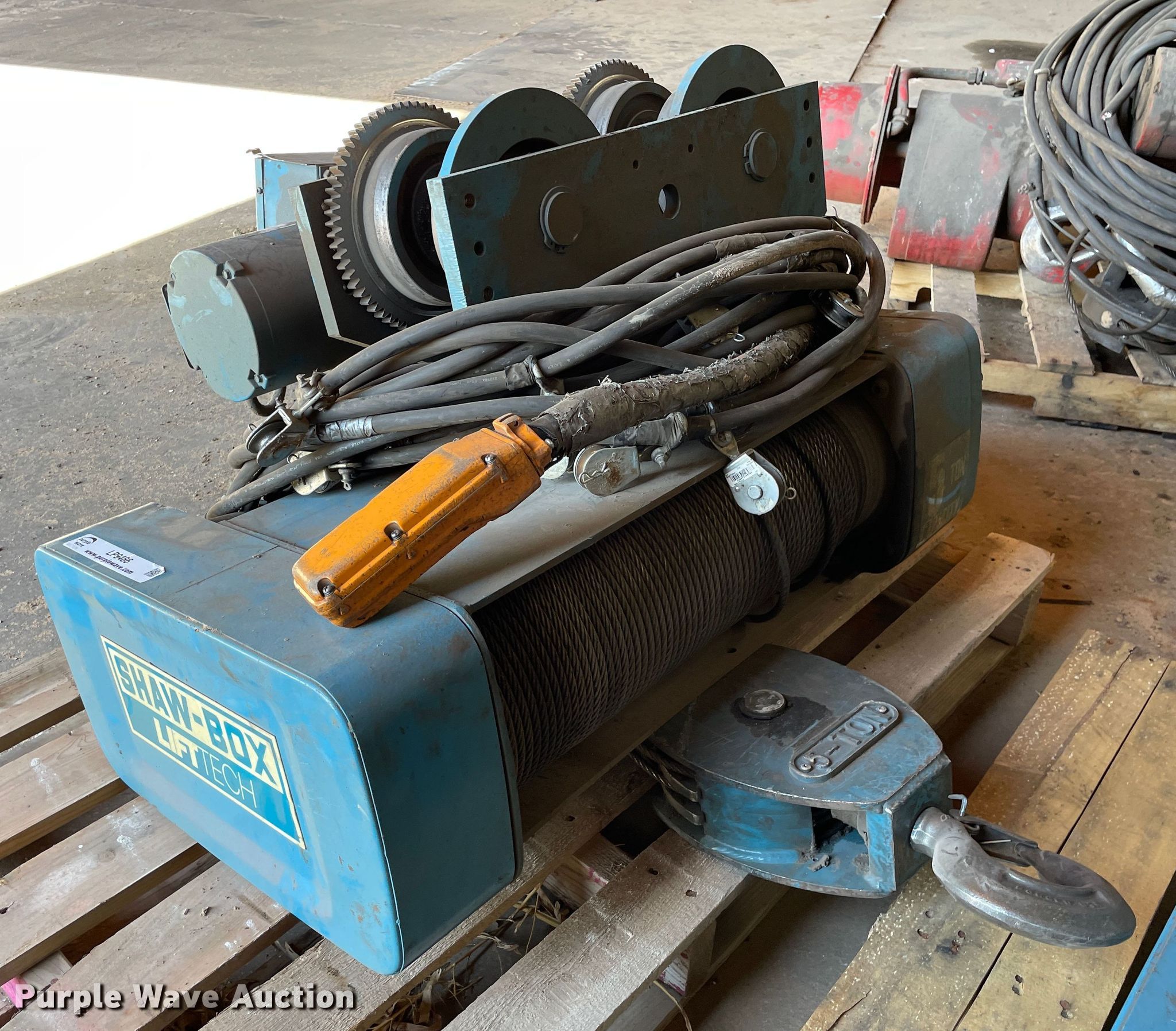 Purple Wave is selling a used Overhead or Straddle Crane in Kansas. This item is a 2012 Shaw-box LiftTech hoist with the following: Hoist, Model: 80L05020S10, Capacity: 10,000 lbs, Hoist speed: 10 FPM, Electric motor, Volts: 230, HP: 4,, Trolley, Model: MDT06, Capacity: 12,000 lbs, Trolley speed: 50 FPM, Electric motor, Volts: 230, HP: 1/4,