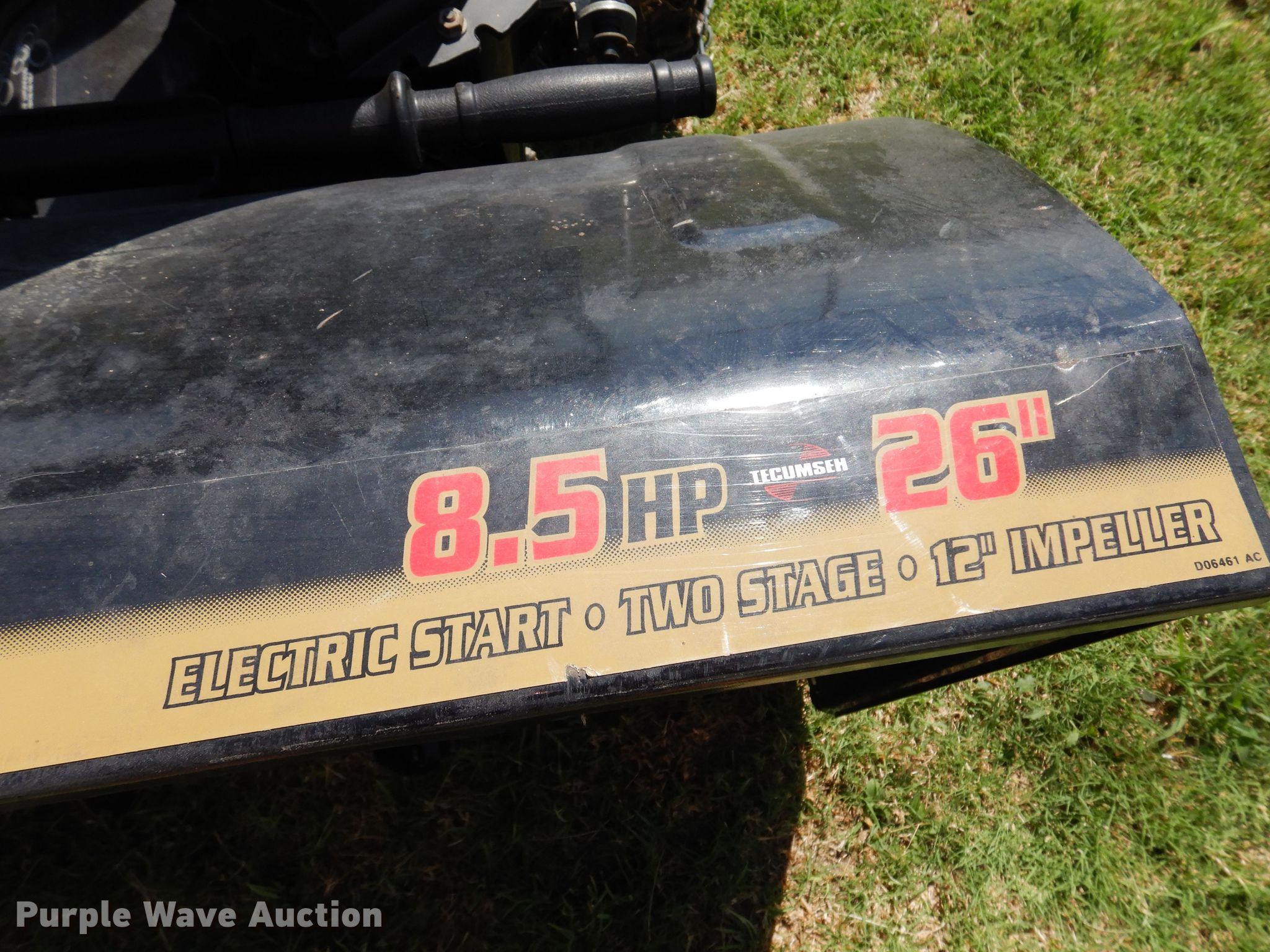 Purple Wave is selling a used Lawn and Garden in Kansas. This item is a MTD snow blower with the following: Tecumseh gas engine, 8.5 HP, 26" working width, 4.80-8 tires