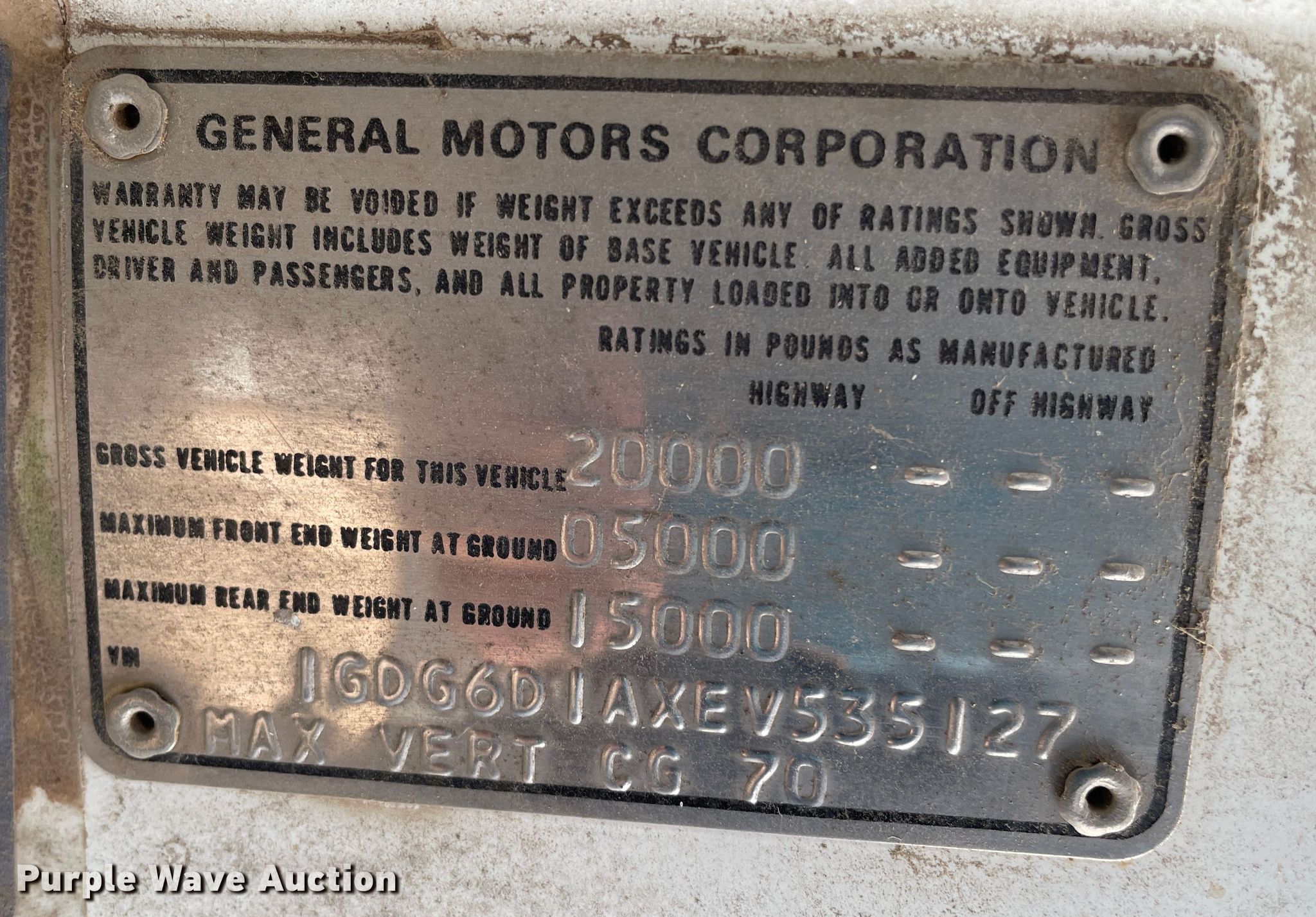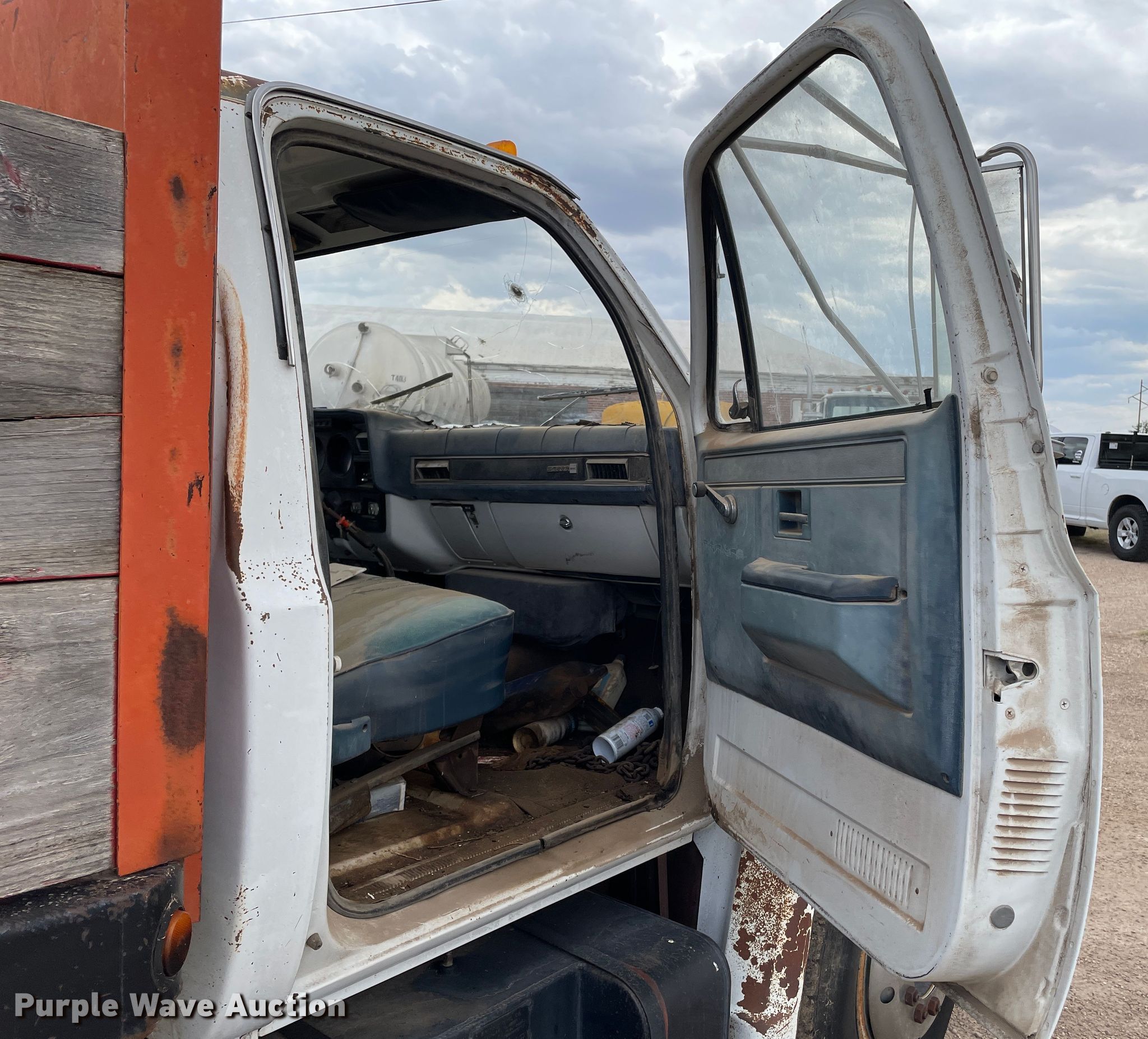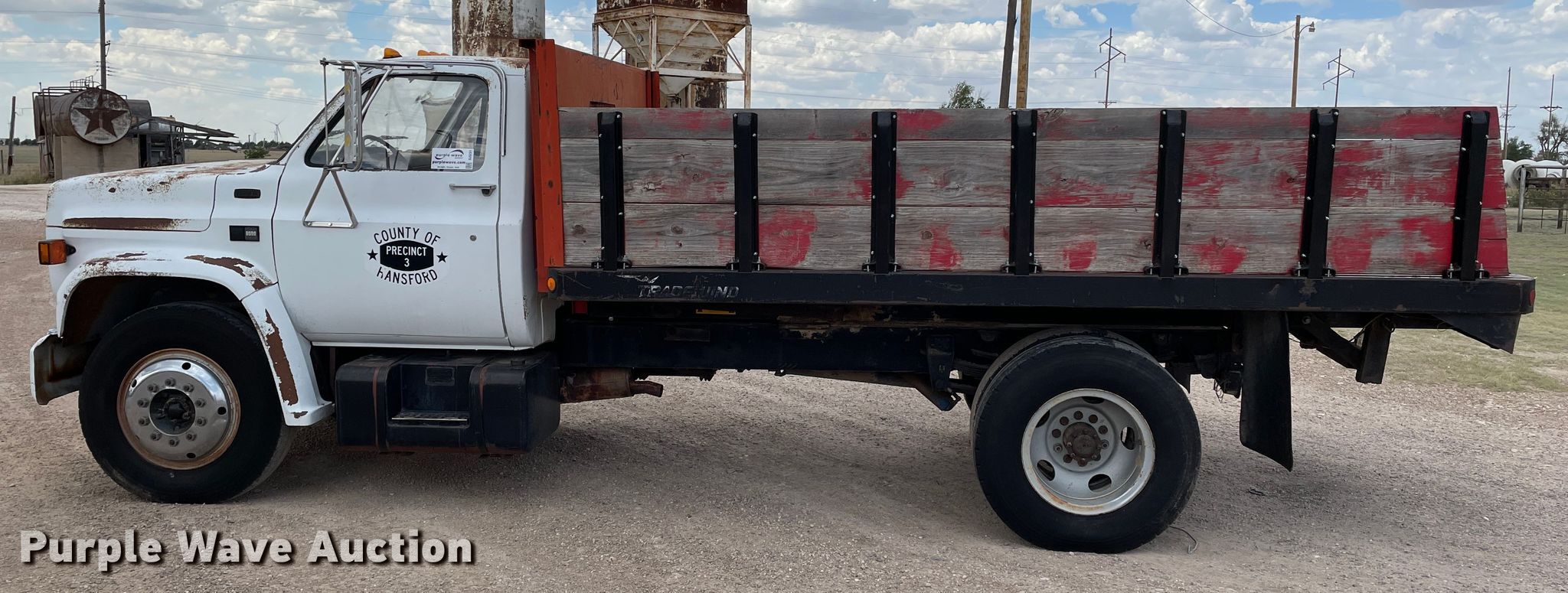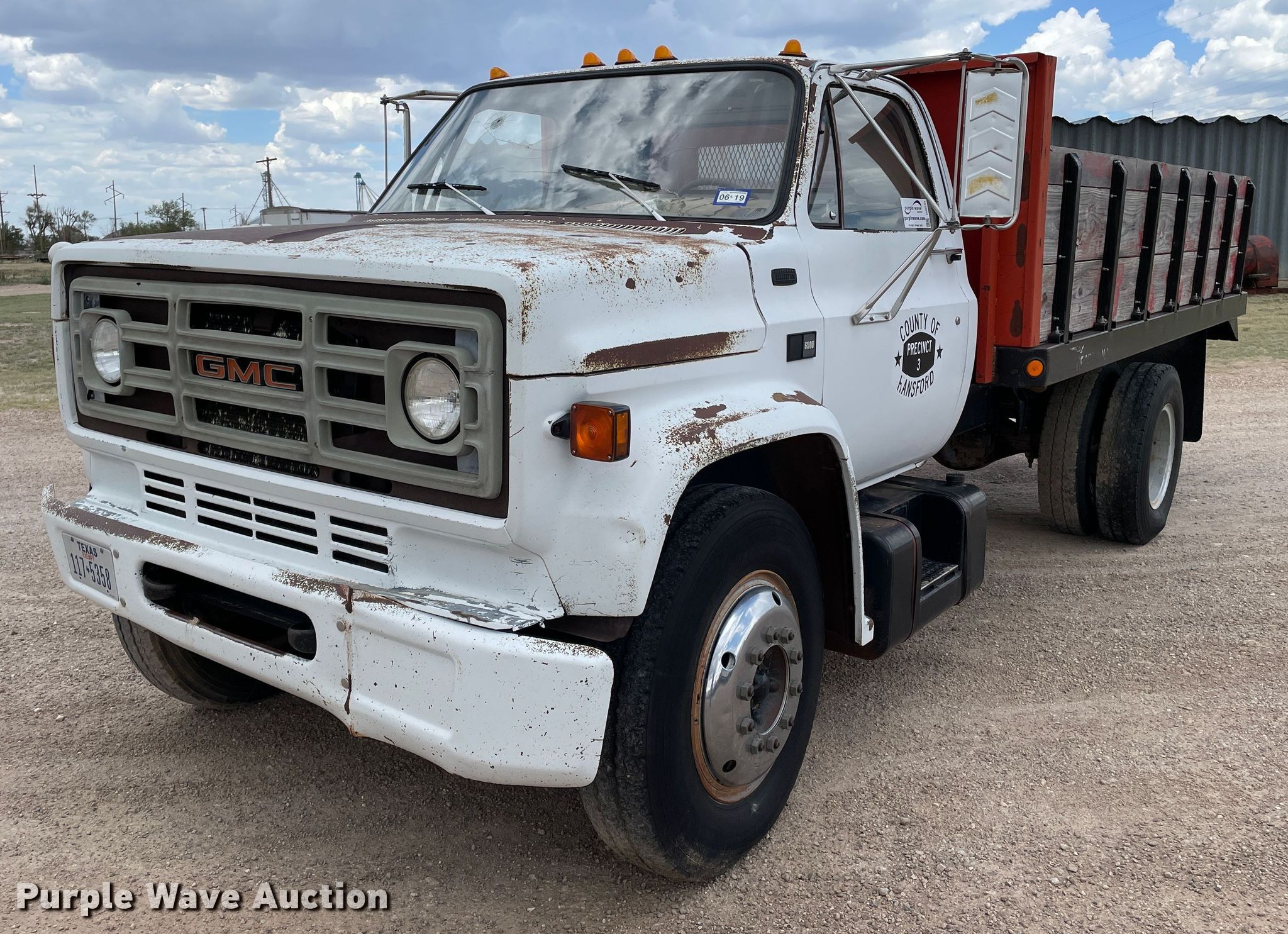 1984 GMC C6000 dump flatbed truck. Miles: 94,999 on odometer, VIN: 1GDG6D1AXEV535127. Engine Displacement: 5.7L, Cylinders: 8, Fuel type: Gas. Transmission Manual, Speed: 4, plus 2. Chassis Axles: Single, Suspension: Spring, Brakes: Hydraulic, PTO, GVWR: 20,000 lbs. Interior AC, Heat. Features Dump flatbed Tradewind, 14' L x 95" W, Removable sides, Ram: Double. Tires Size: 9.00R20. Notes Windshield chipped or cracked. Texas title. Title distribution may be delayed up to 30 days from verification of funds. Hansford County, TX. 702 Front Street. Gruver, TX 79040
