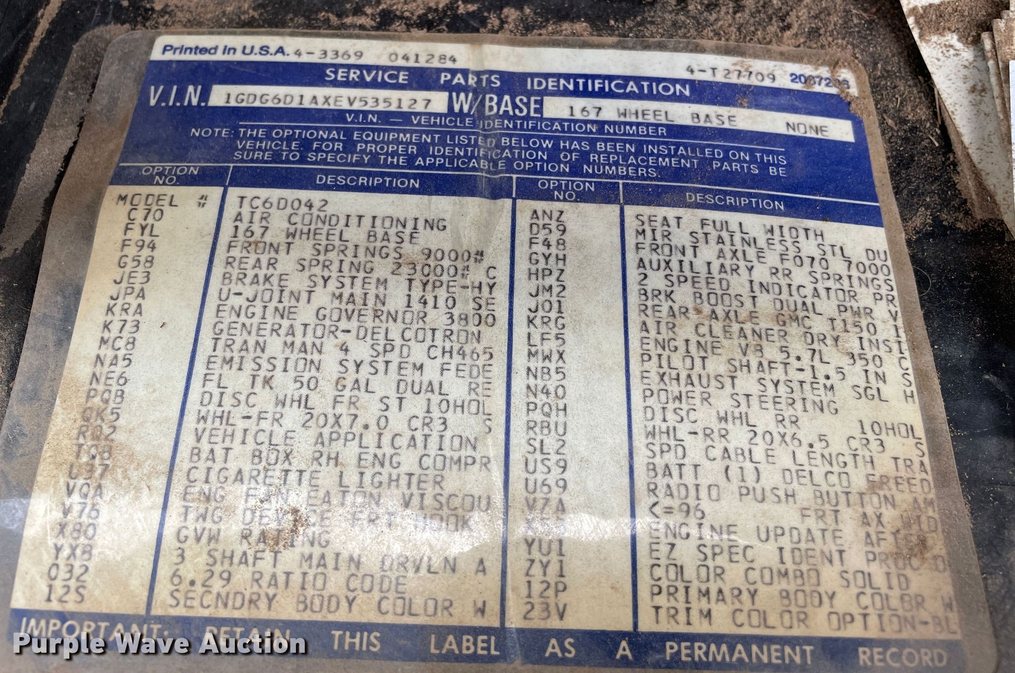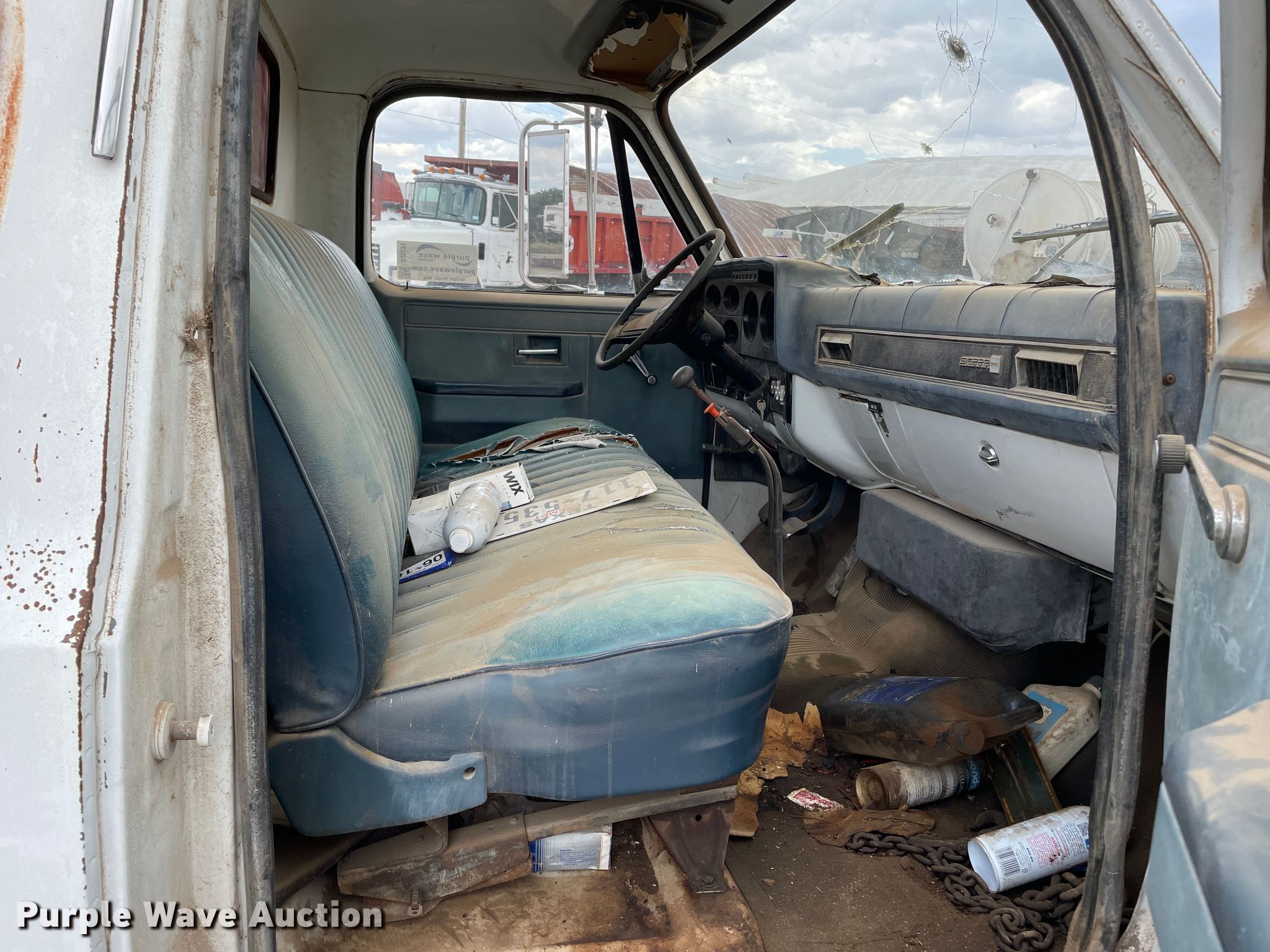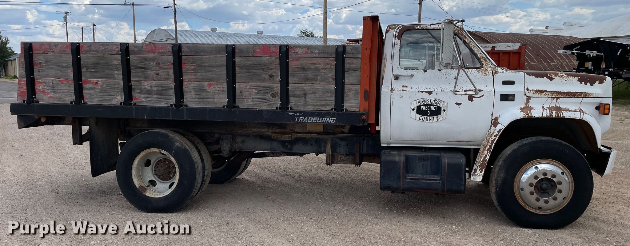 1984 GMC C6000 dump flatbed truck. Miles: 94,999 on odometer, VIN: 1GDG6D1AXEV535127. Engine Displacement: 5.7L, Cylinders: 8, Fuel type: Gas. Transmission Manual, Speed: 4, plus 2. Chassis Axles: Single, Suspension: Spring, Brakes: Hydraulic, PTO, GVWR: 20,000 lbs. Interior AC, Heat. Features Dump flatbed Tradewind, 14' L x 95" W, Removable sides, Ram: Double. Tires Size: 9.00R20. Notes Windshield chipped or cracked. Texas title. Title distribution may be delayed up to 30 days from verification of funds. Hansford County, TX. 702 Front Street. Gruver, TX 79040