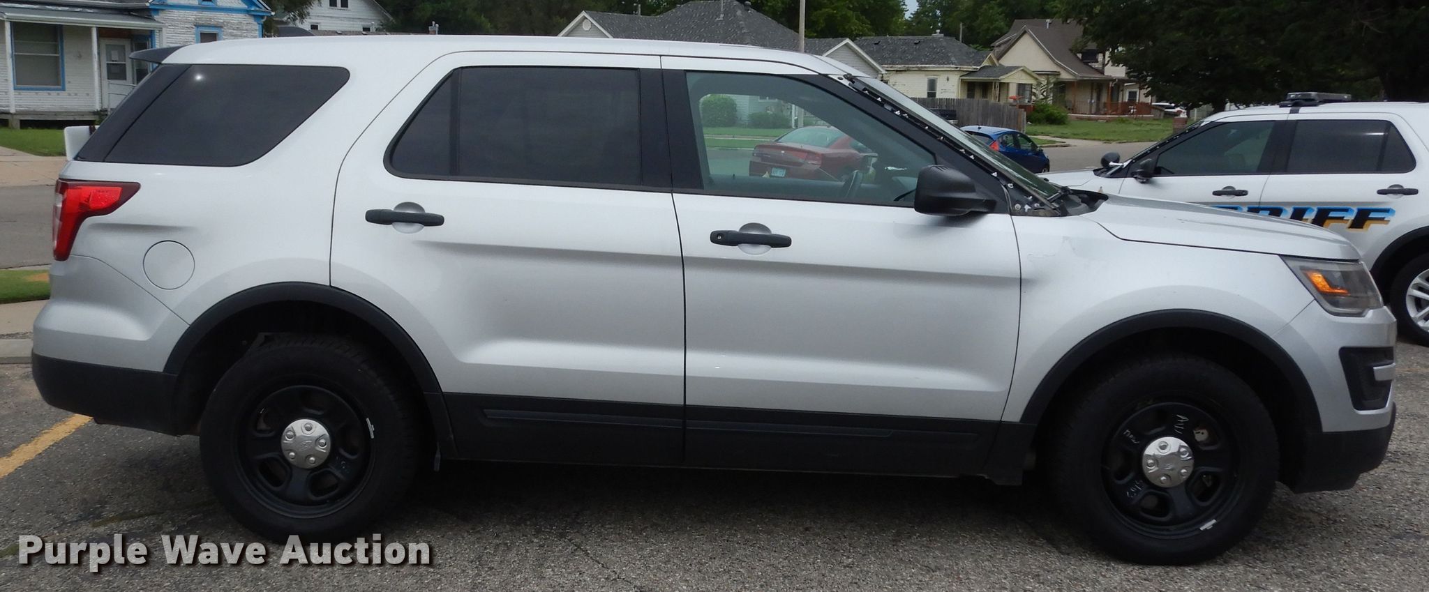 2017 Ford Explorer Police Interceptor SUV. Miles: 234,223 on odometer, VIN: 1FM5K8AR7HGC90649. Engine Displacement: 3.7L V6 DOHC, Cylinders: 6, Fuel type: Gas. Transmission Automatic, All wheel drive. Interior AC, Heat, Seat: Power driver, Heated mirrors, Power windows, Power locks, Cruise control. Tires Size: 245/55R18. Notes Rear seats and door panels removed but included. Kansas title. Saline County Sheriff Department. 251 N 10th St. Salina, KS 67401