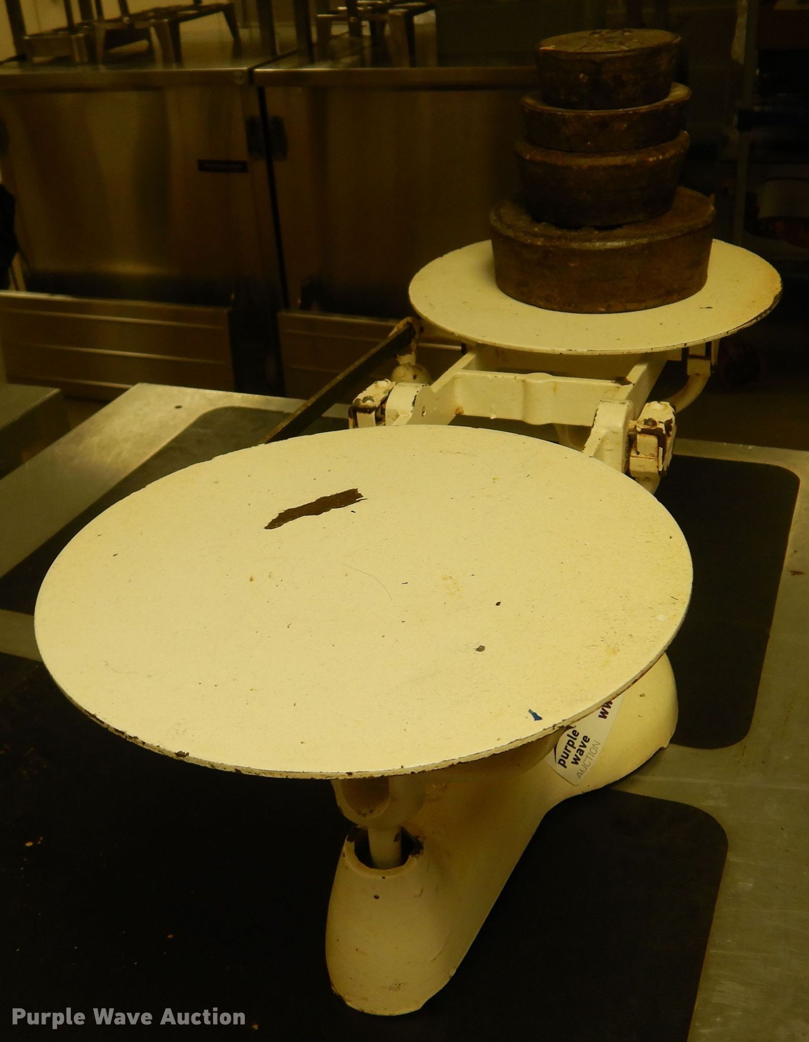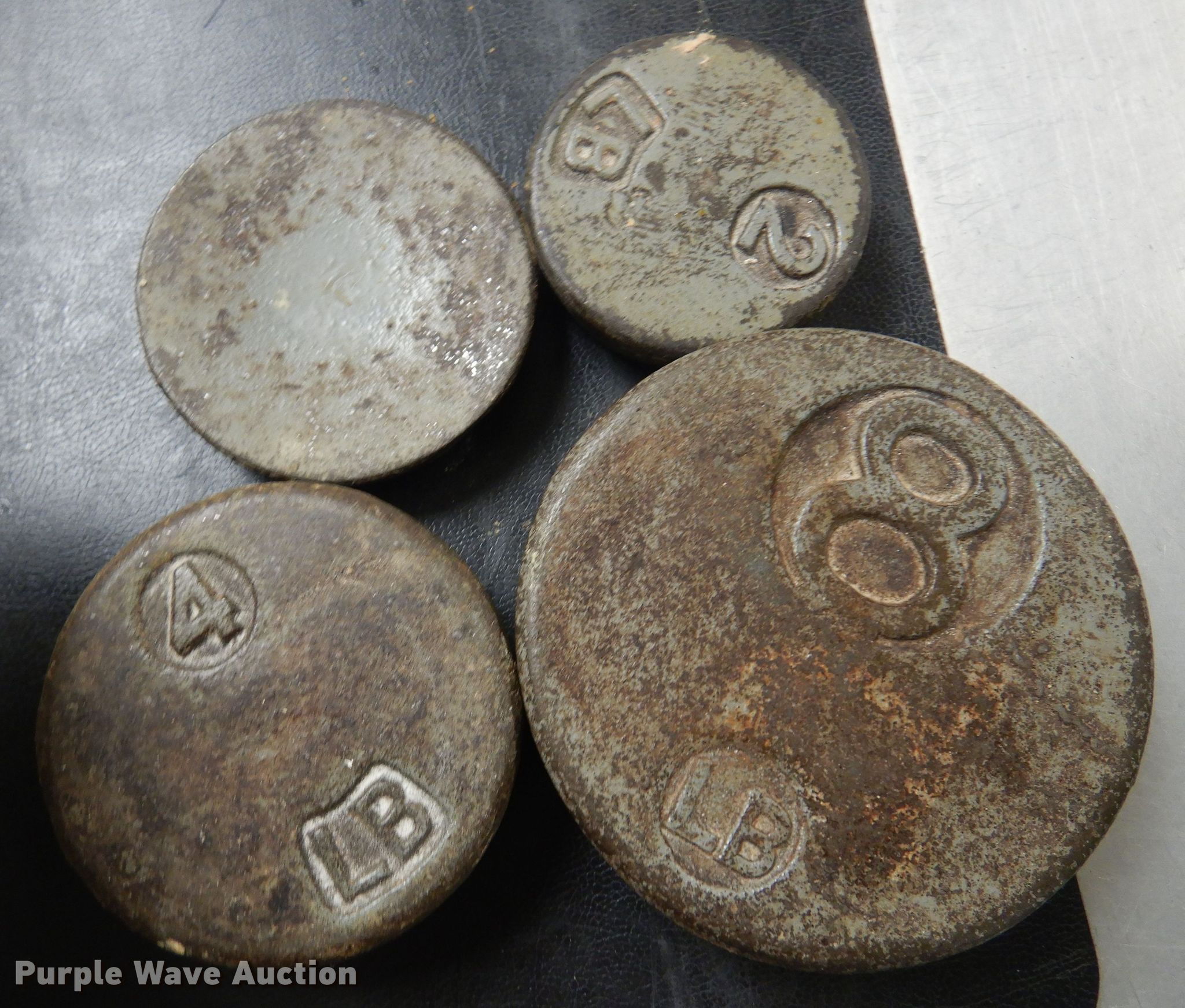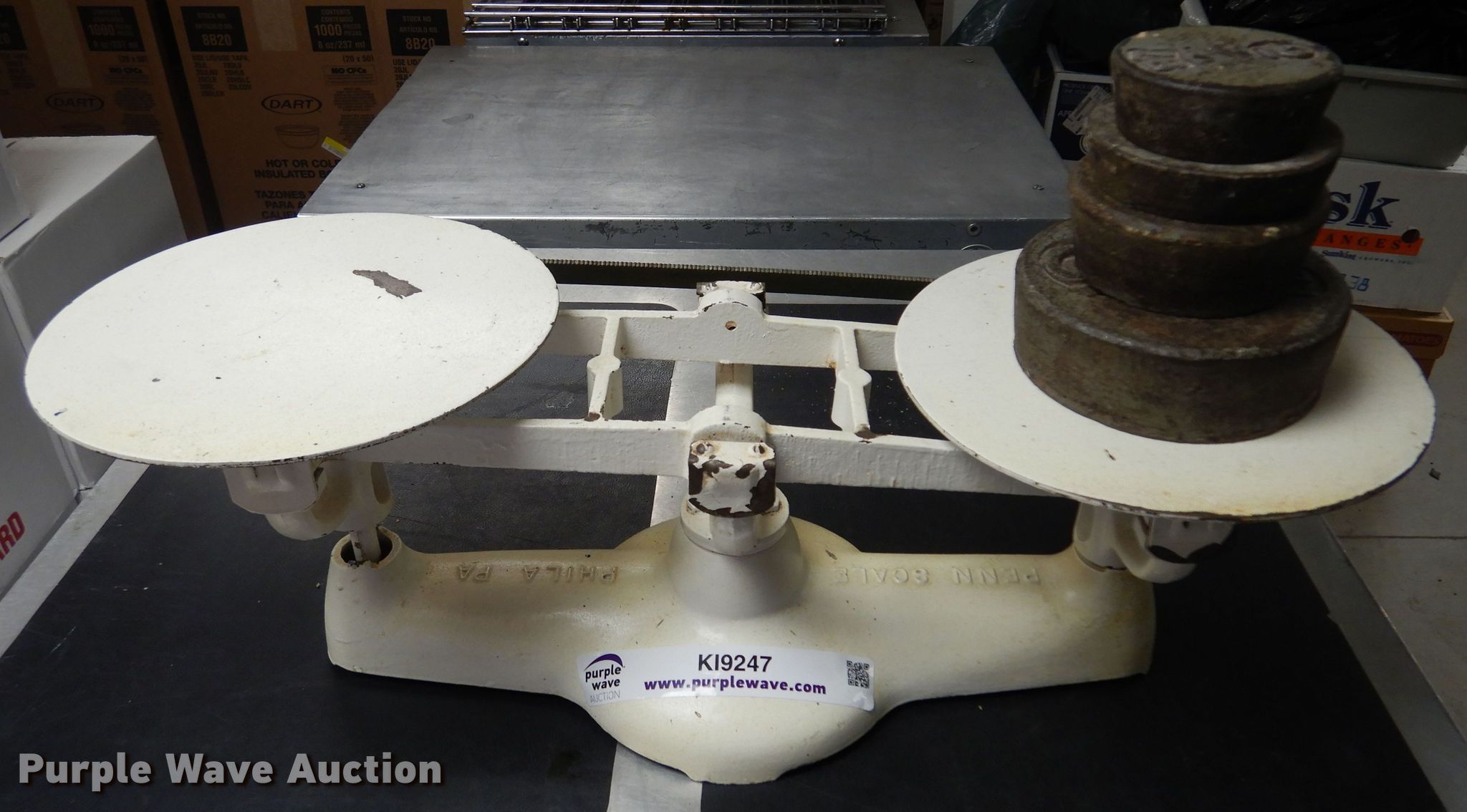 Purple Wave is selling a used Restaurant Equip. in Kansas. This item is a Penn weight scale with the following: Cast iron weights