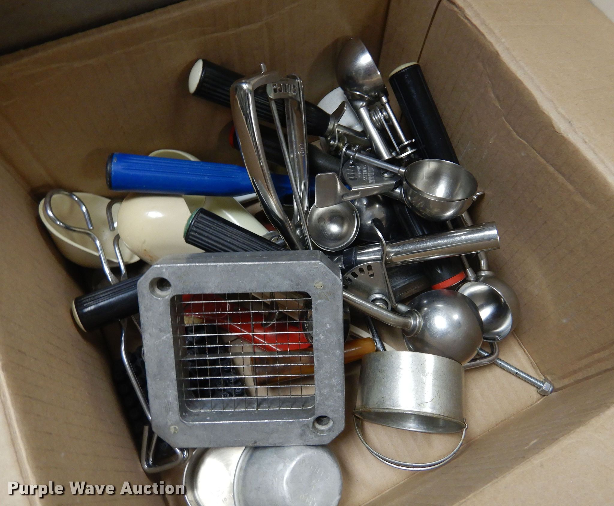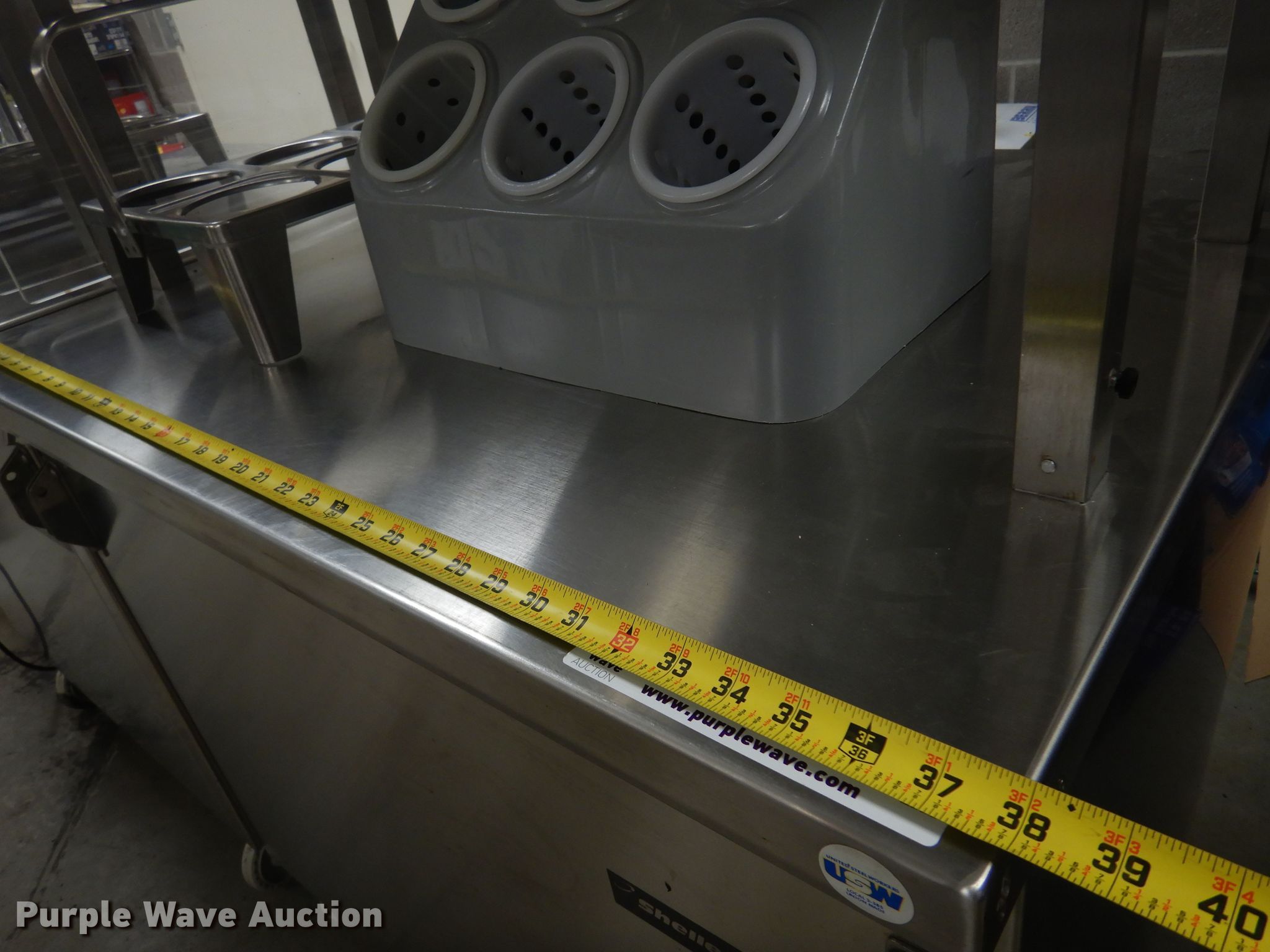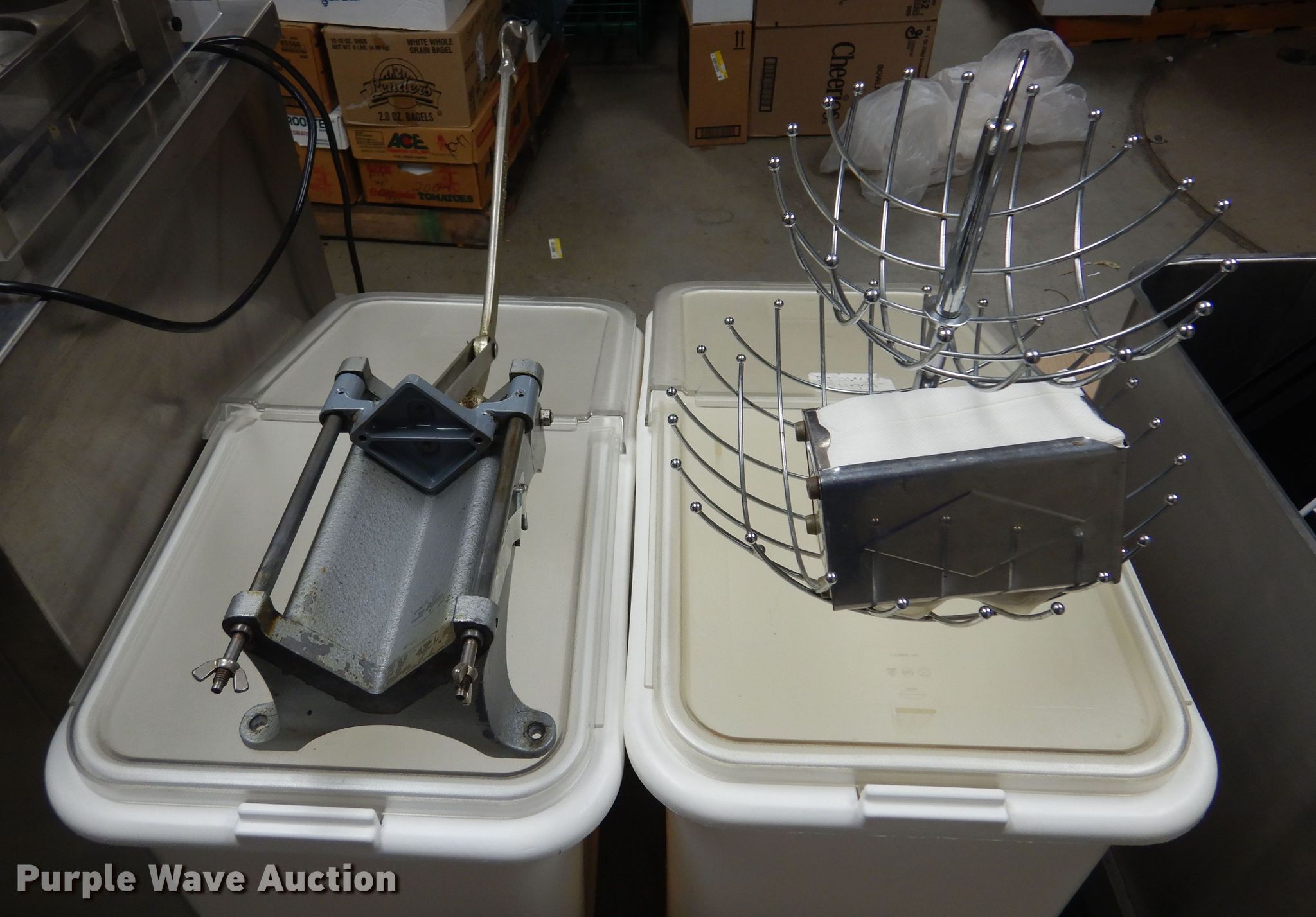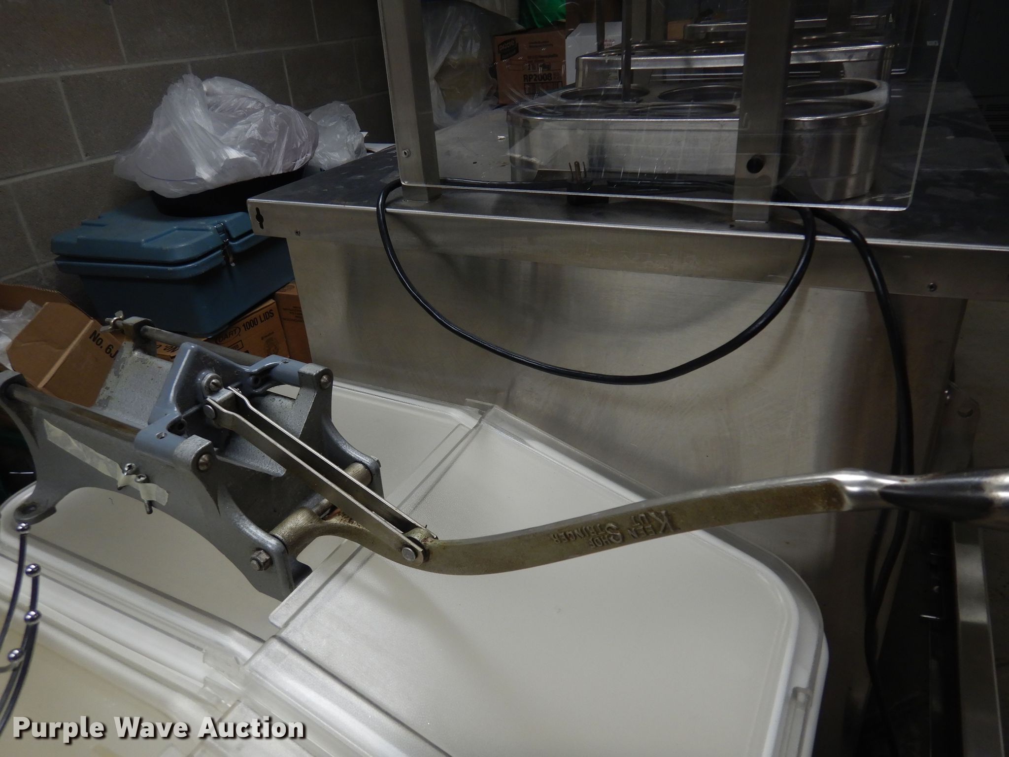 Purple Wave is selling a used Restaurant Equip. in Kansas. This item is a Restaurant equipment with the following: (2) Shelley stainless steel serving carts, (4) silverware organizers, (2) Rubbermaid organizers, Keen Kut shoe stringer fry cutter, Utensils