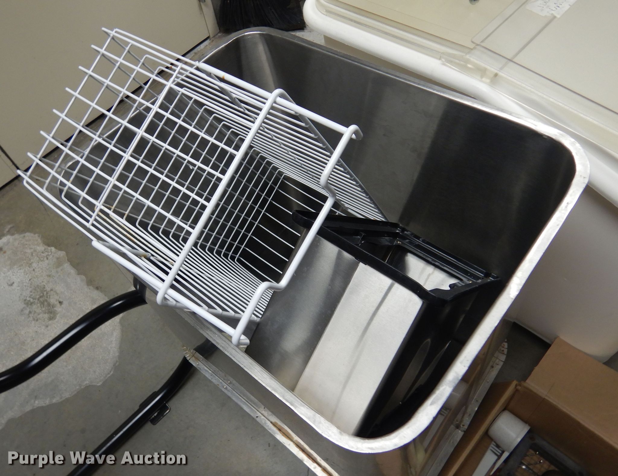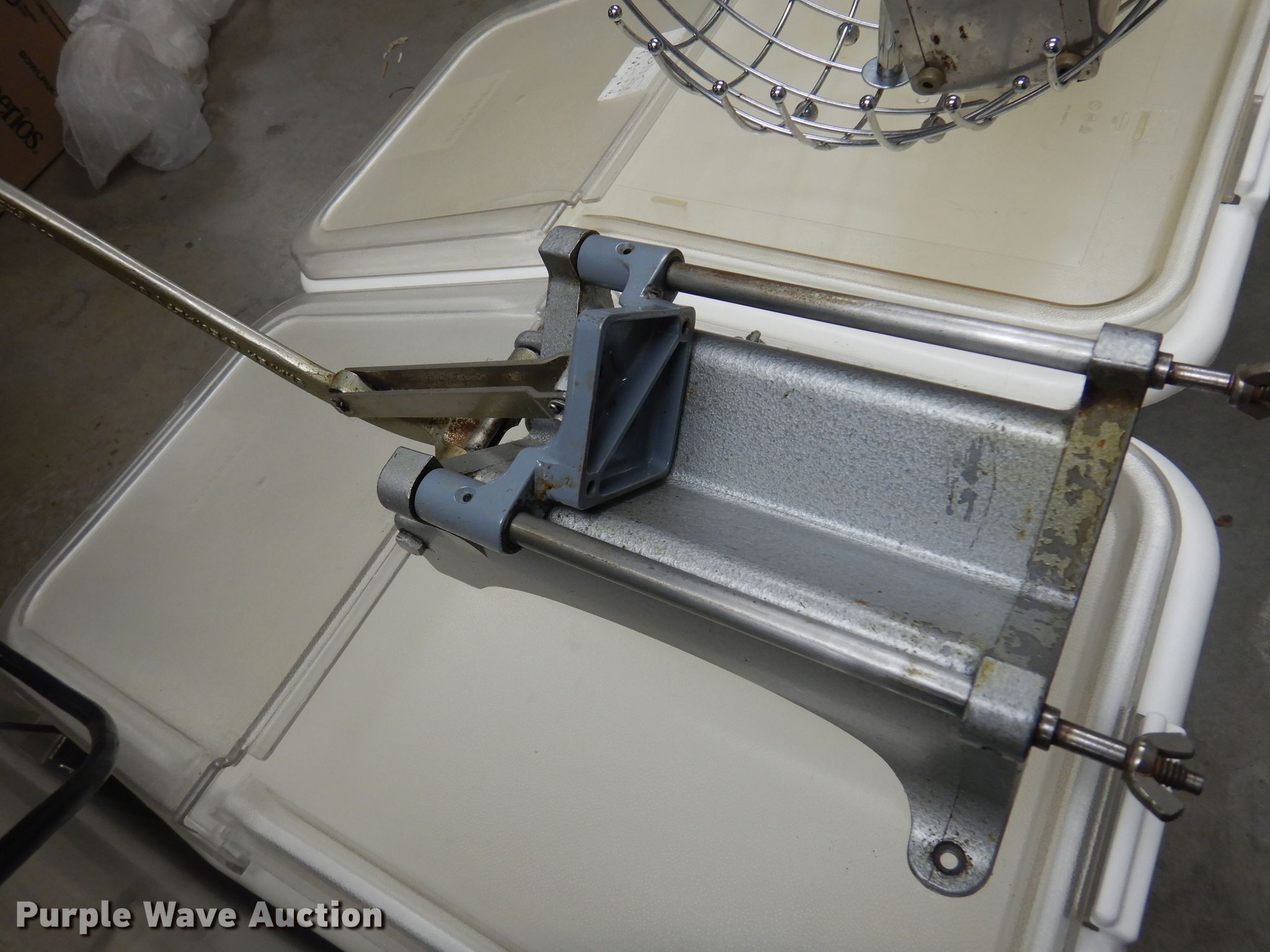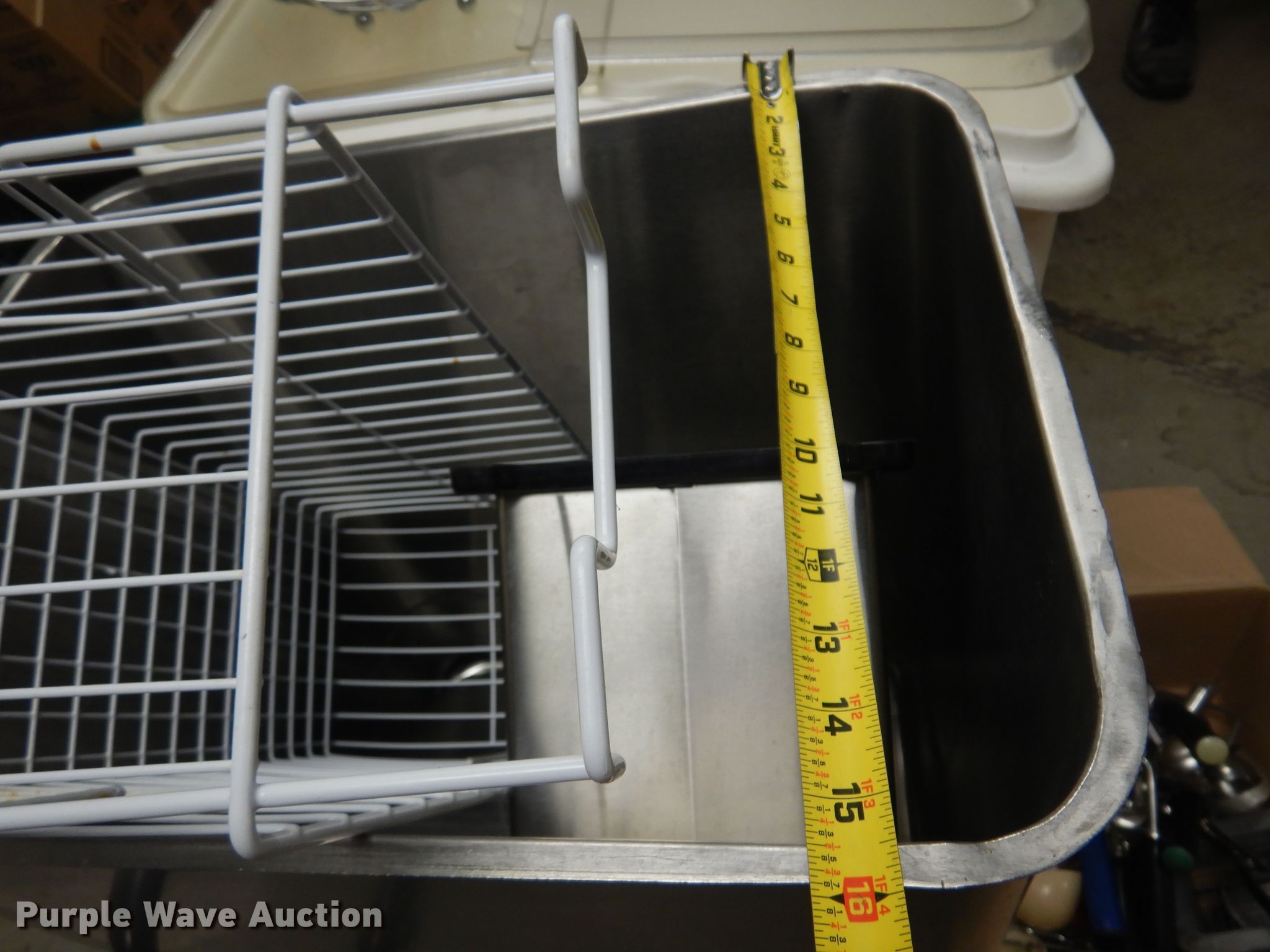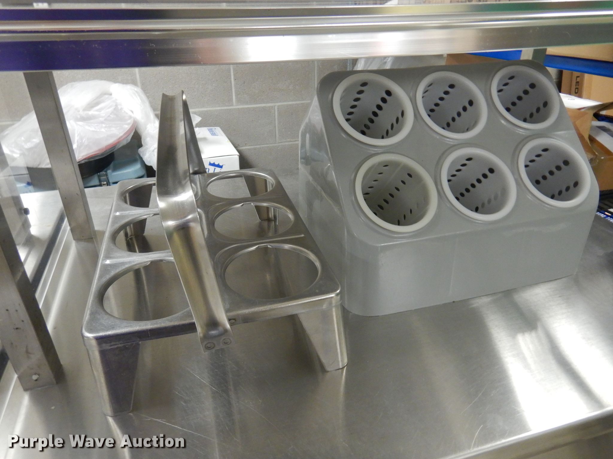 Purple Wave is selling a used Restaurant Equip. in Kansas. This item is a Restaurant equipment with the following: (2) Shelley stainless steel serving carts, (4) silverware organizers, (2) Rubbermaid organizers, Keen Kut shoe stringer fry cutter, Utensils