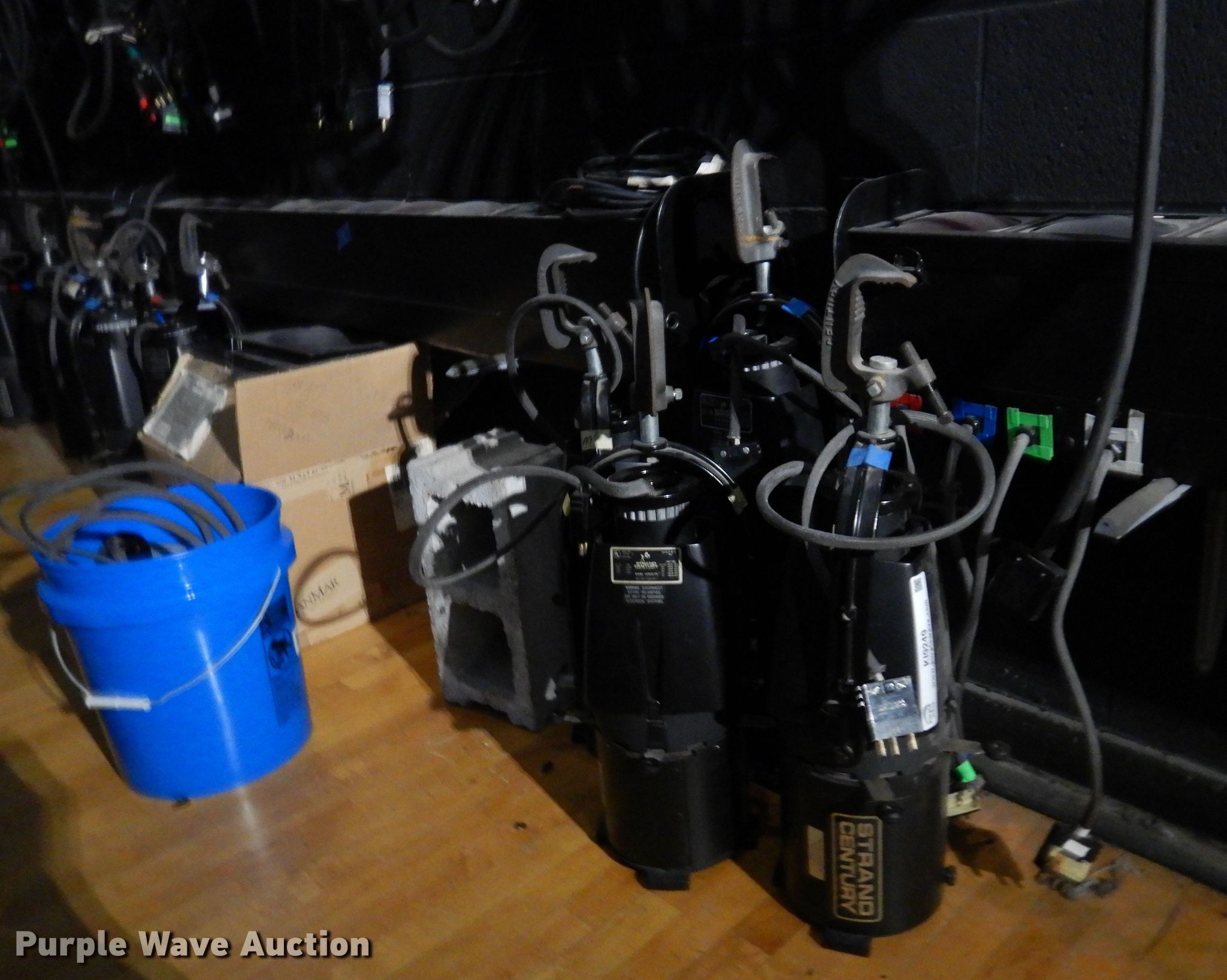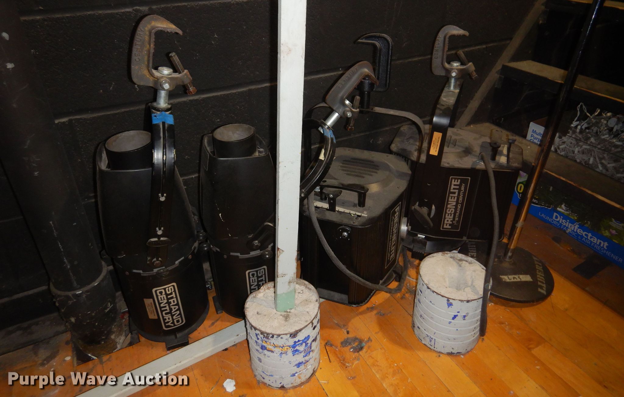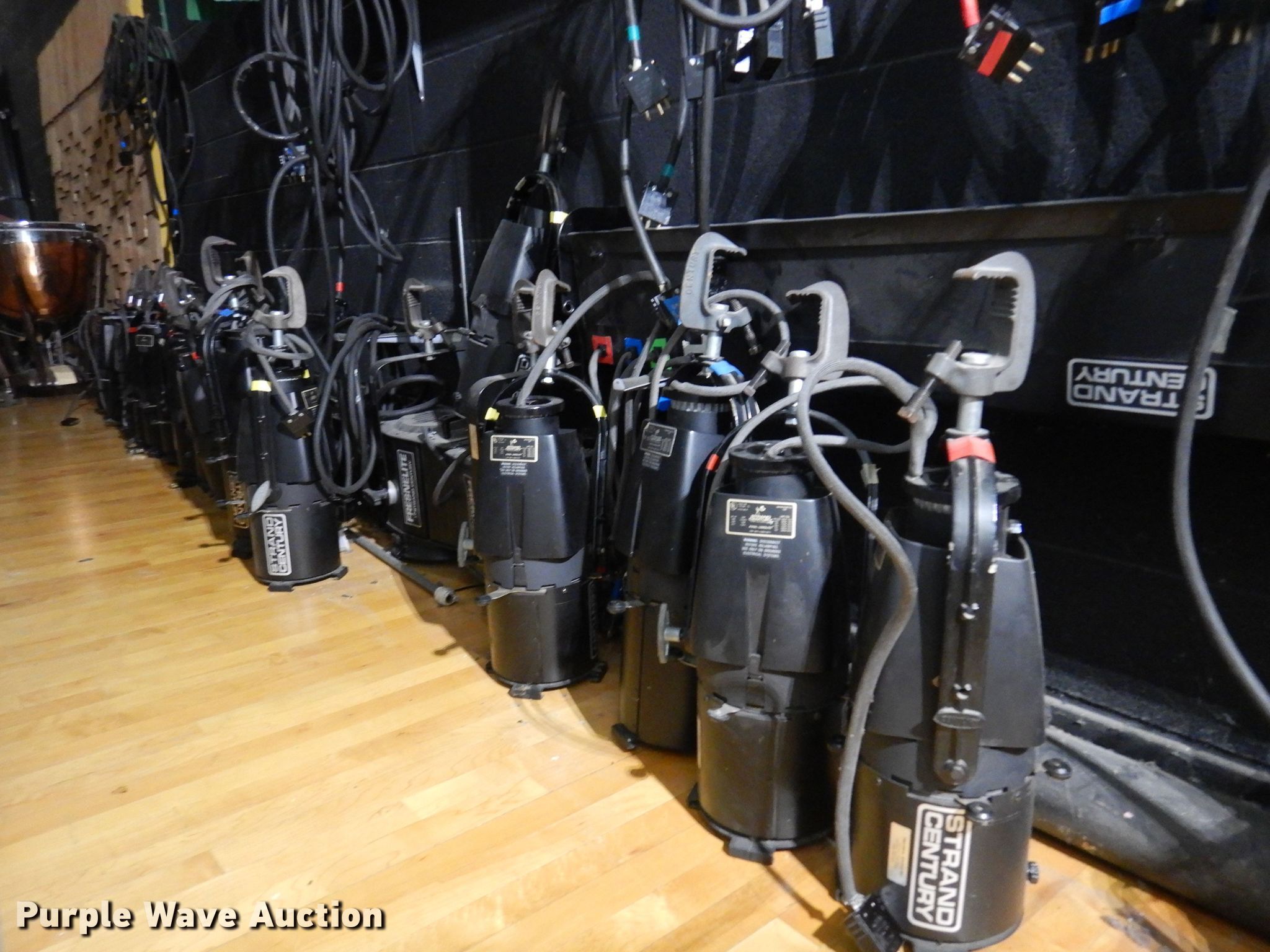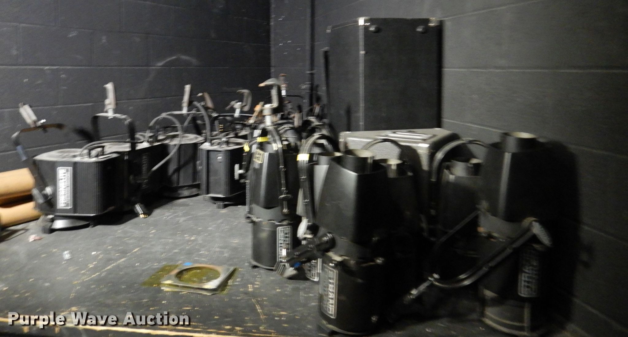 Purple Wave is selling a used Office Supplies and Equip. in Kansas. This item is a Stage lighting with the following: Approx. 11 Fresnelite 2KW 8" lights, Approx. 16 Strand Century 3342 lights, Approx. 40 Strand Century axial lekolights, (27) colored, (13) empty