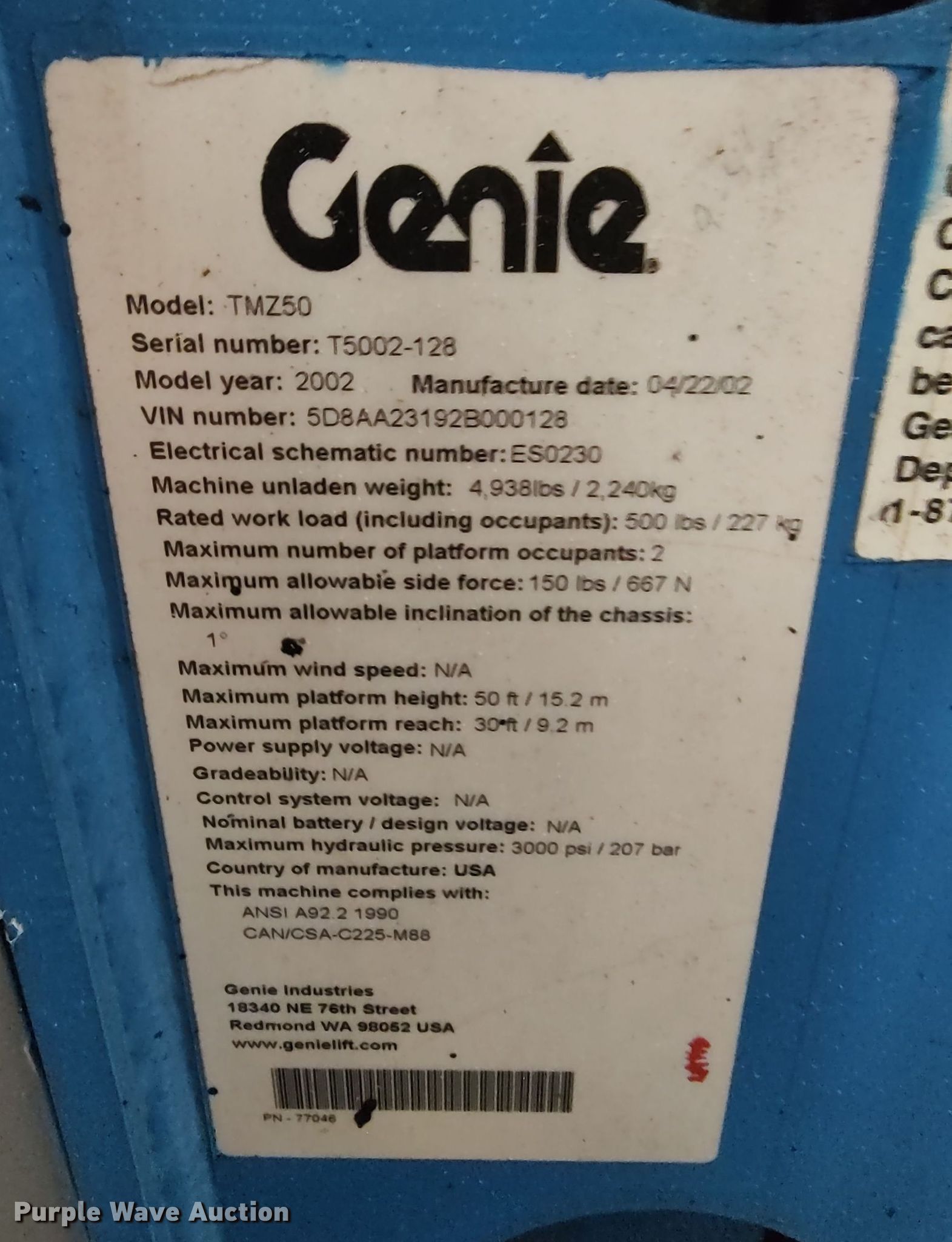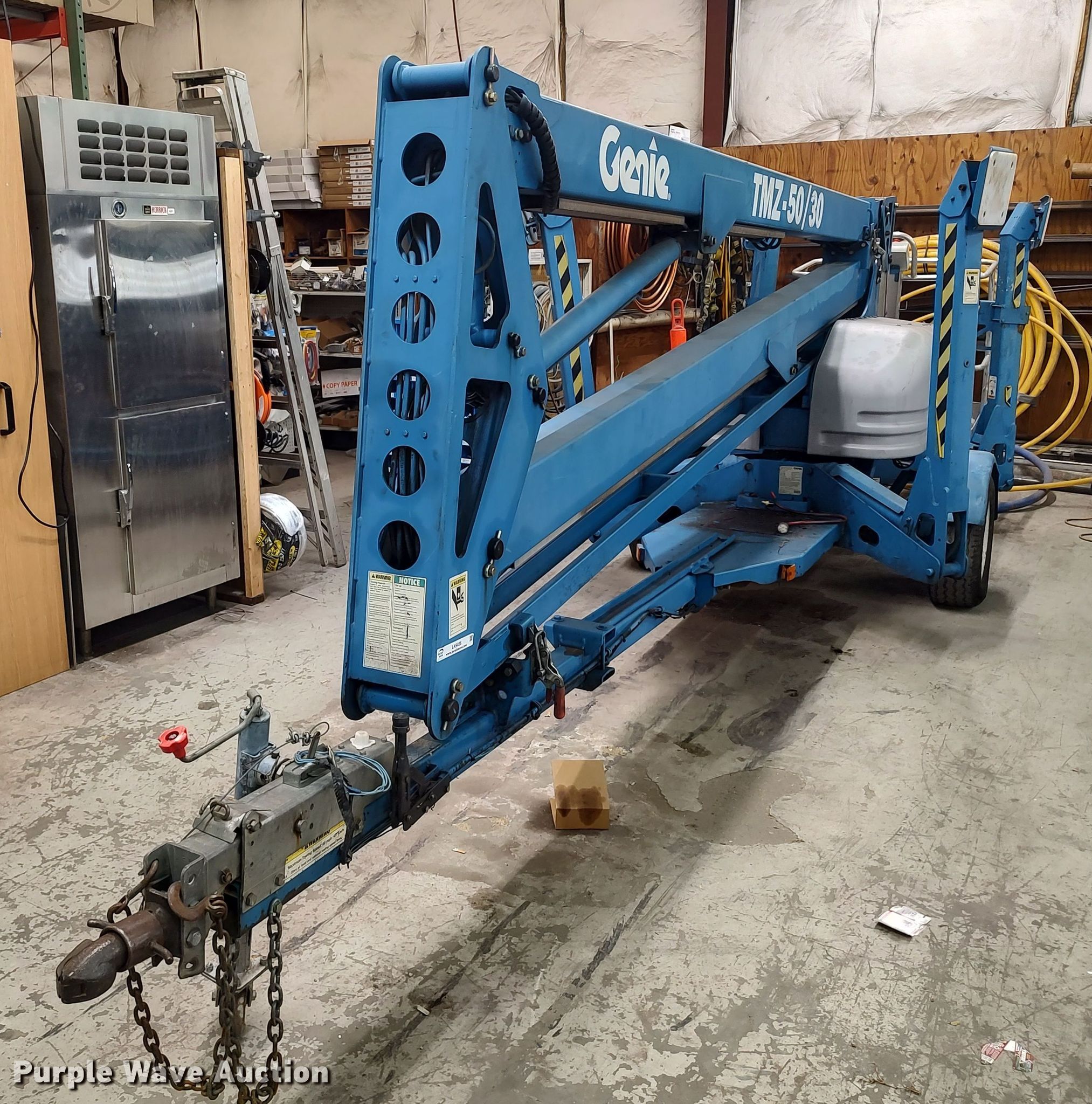 Purple Wave is selling a used Boom Lift in Oklahoma. This item is a 2002 Genie TMZ50 boom lift with the following: Hours: Unknown, VIN: 5D8AA23192B000128, Serial: T5002-128