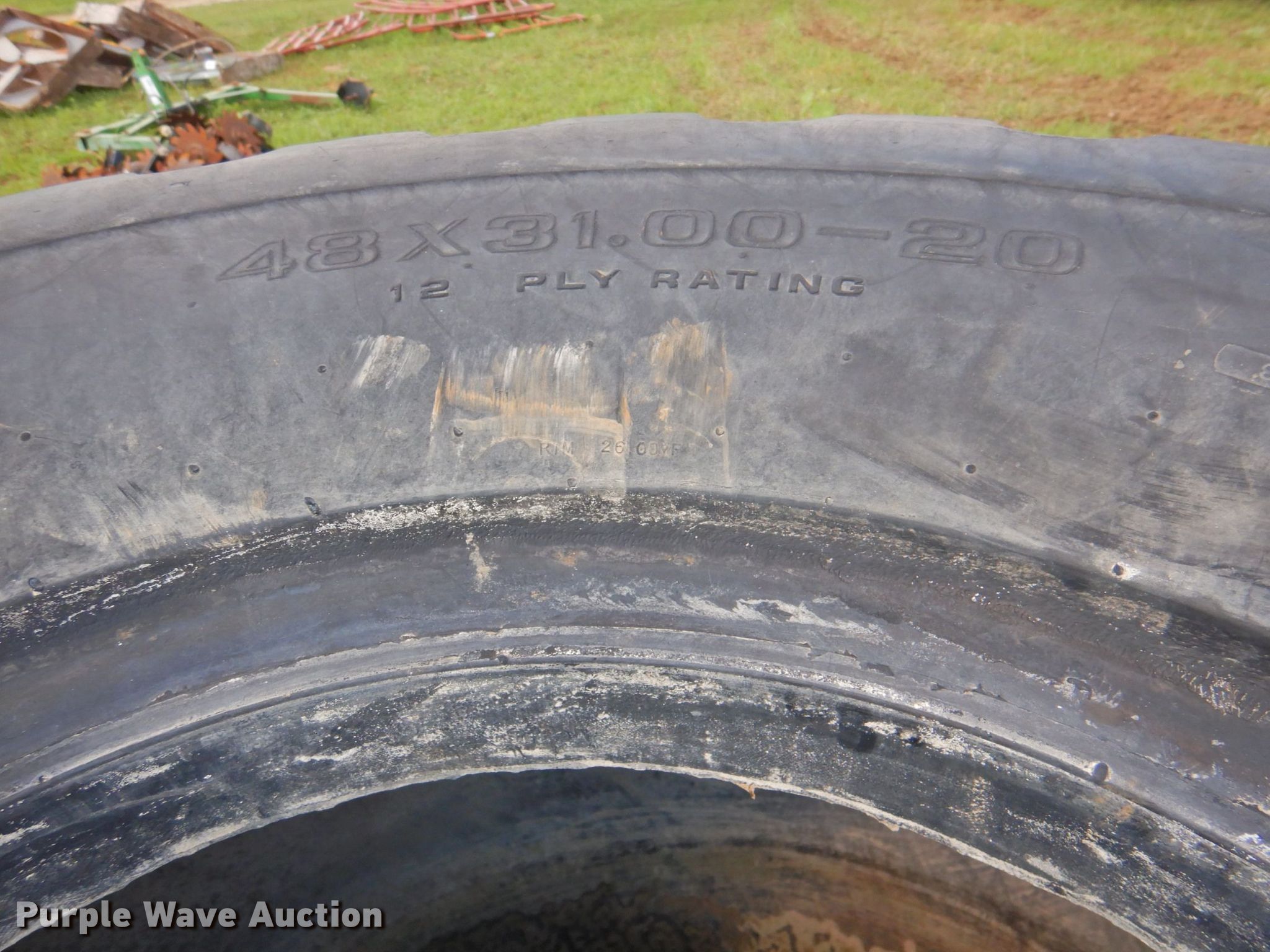 Purple Wave is selling a used Industrial Tires or Tracks in Kansas. This item is a Flotation tires and wheel with the following: 48x31-20 tire, 48x25-20 tire, 10 bolt wheel, 20" diameter