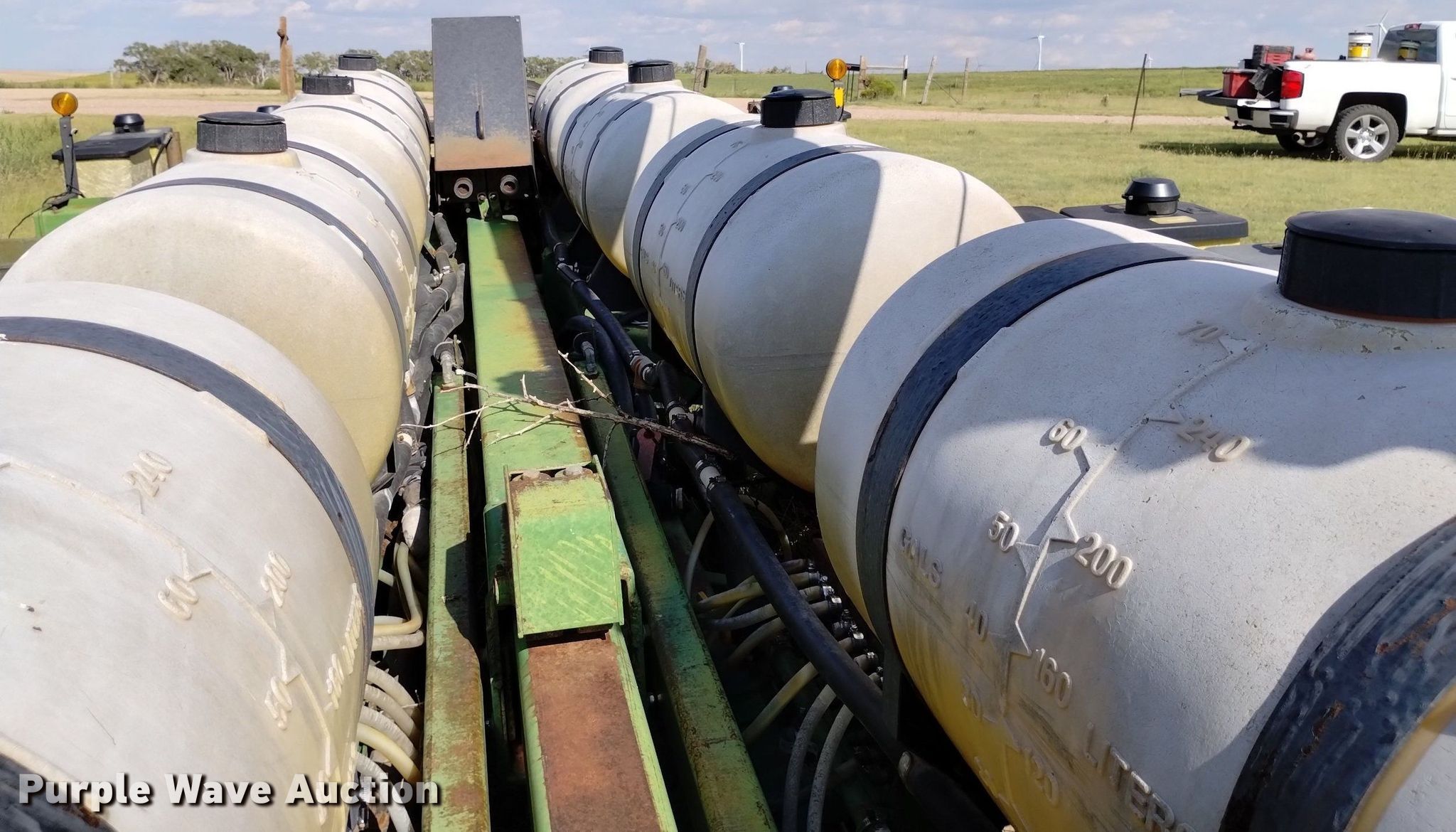 John Deere 7000 no-till planter. Width: 35', Row units: 16, Row spacing: 30", Serial: 10704. Features Frame Hitch: Two point, Front fold, Seed delivery Individual seed hoppers, Row units Meter drive: Ground, Down pressure: Spring, No-till coulters, Disk openers: Double, Gauge wheels: Double, Closing system: Double Type: Rubber, Fertilizer/ insecticide Fertilizer Liquid capacity: 560 gallons, Application method: Coulter, Pump: Squeeze John Blue, Insecticide boxes. Tires Transport tire size: 7.50-20 Quantity: 4, Drive/ outside tire size: 7.50-20 Quantity: 4. Notes Flat tires. 55137 County Rd 33. Genoa, CO 80818