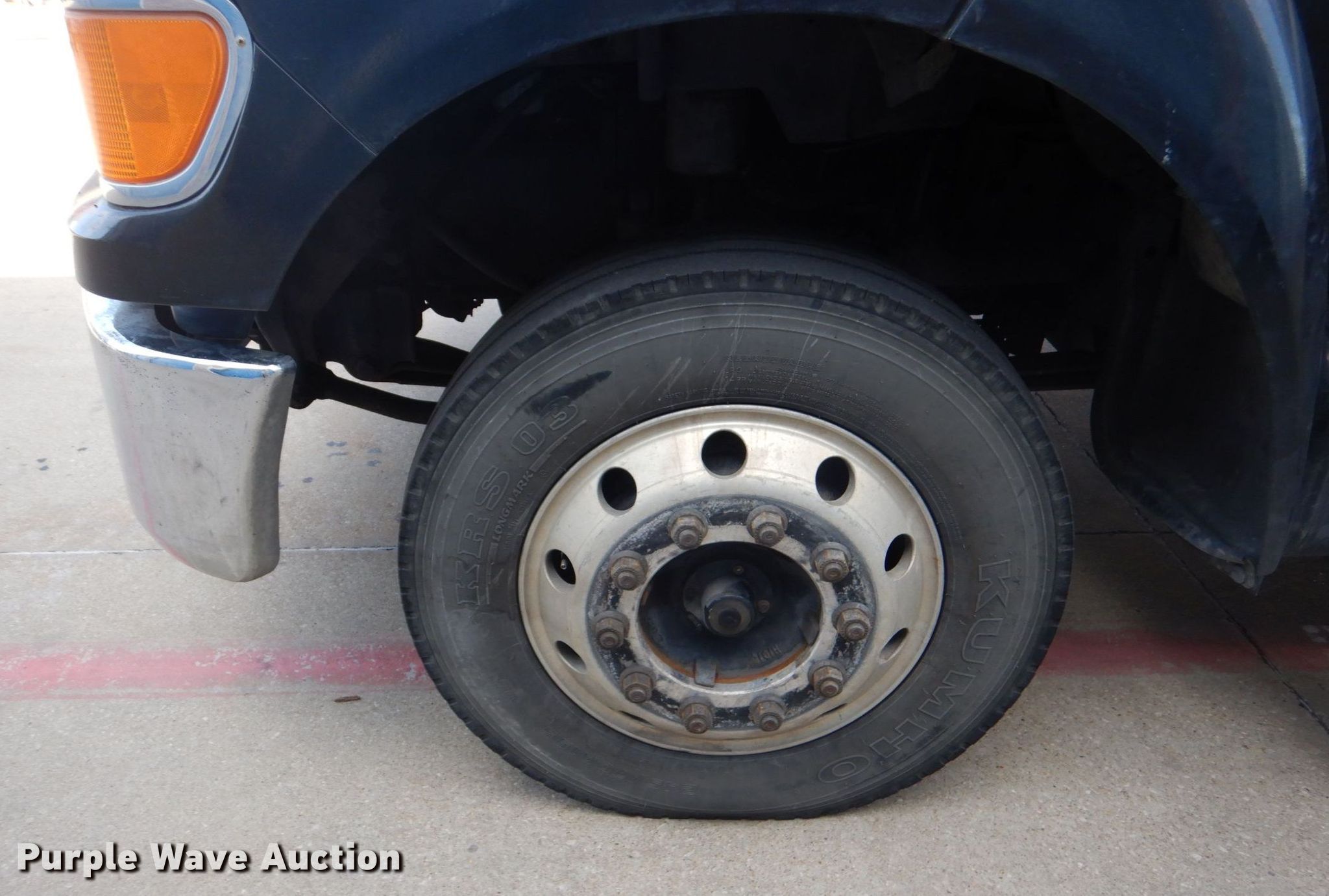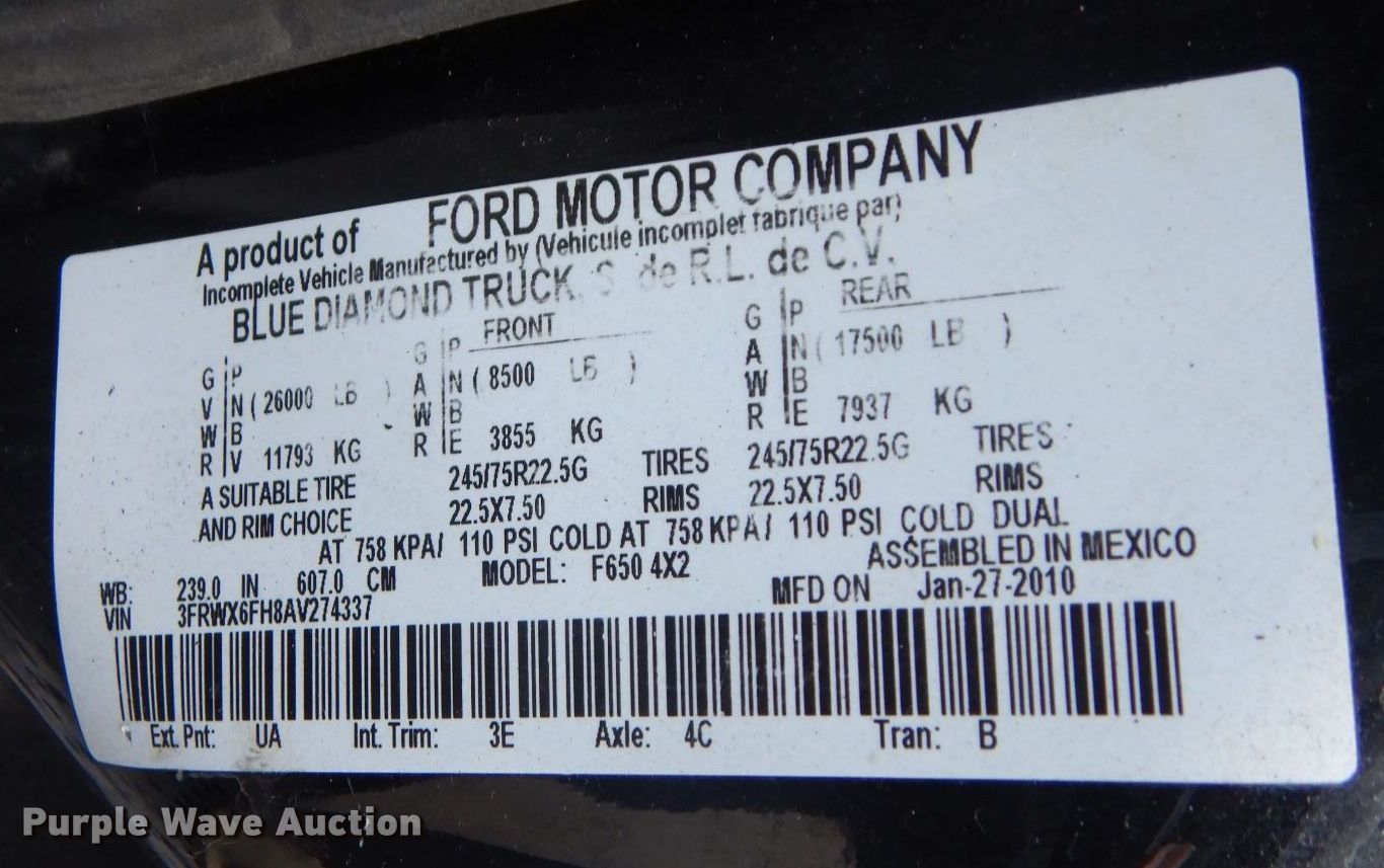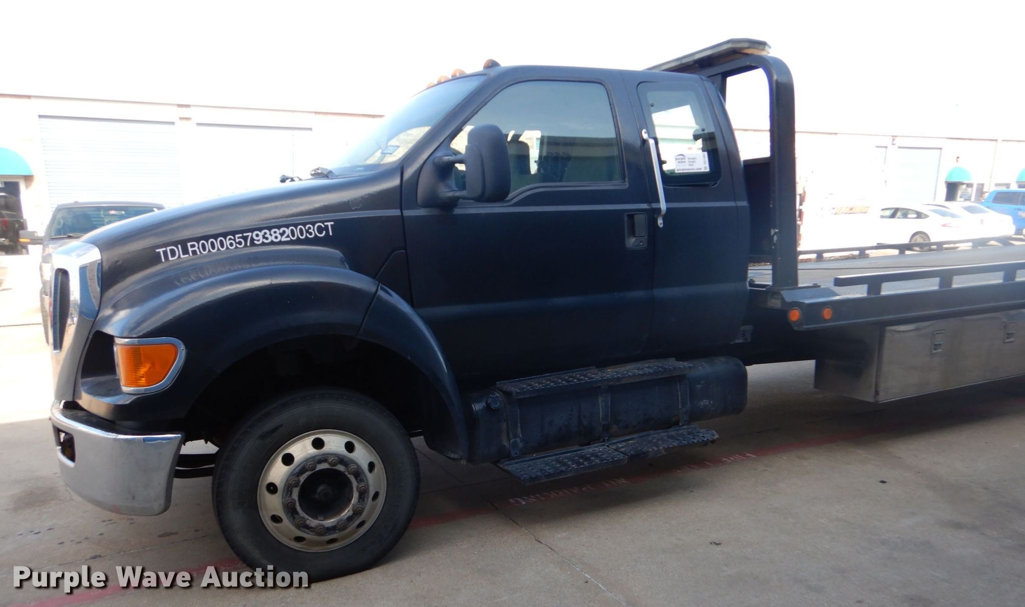 2010 Ford F650 Super Duty SuperCab rollback truck. Miles: 269,139 on odometer, Miles or hours may vary, unit still in use, VIN: 3FRWX6FH8AV274337. Engine Cummins CM2150D, Serial: 118052, Displacement: 6.7L, Cylinders: 6, Fuel type: Diesel. Transmission Automatic. Chassis Axles: Single, Suspension: Air, Brakes: Air, GVWR: 26,000 lbs. Interior AC, Heat, Power windows, Power locks, Cruise control, Brake controller. Features Rollback bed Chevron, 21' 7" L x 8' 6" W, Removable sides, Ram: Double, Wrecker boom: Hydraulic, Winch Capacity: 12,000 lbs, Underlift Hydraulic fold, Capacity: 4,000 lbs. Tires Size: 245/70R19.5. Notes Dash warning indicator: Check engine, ABS, Stop engine, Windshield chipped or cracked. Texas title. 800 Fulgham Road. Plano, TX 75093