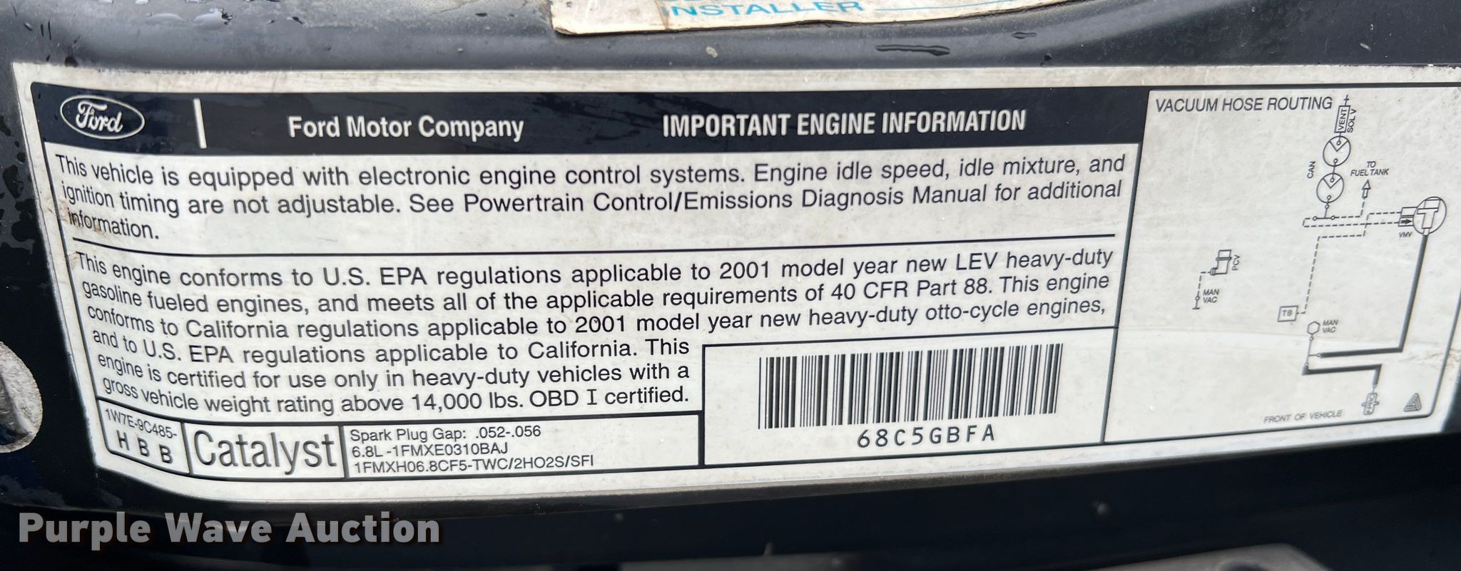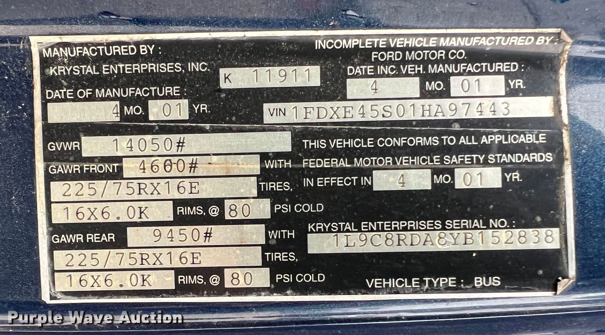 2001 Ford E450 Super Duty party bus. Miles: 133,001 on odometer, Hours: 8,949 on meter, VIN: 1FDXE45S01HA97443. Engine Displacement: 6.8L, Cylinders: 10, Fuel type: Gas. Transmission Automatic. Chassis Axles: Single, Suspension: Spring, Brakes: Hydraulic, GVWR: 14,050 lbs. Interior AC, Heat, Cruise control, Electric passenger sliding door. Tires Size: LT225/75R16. Missouri title. Sellenriek Construction Inc.. Jonesburg, MO 63351