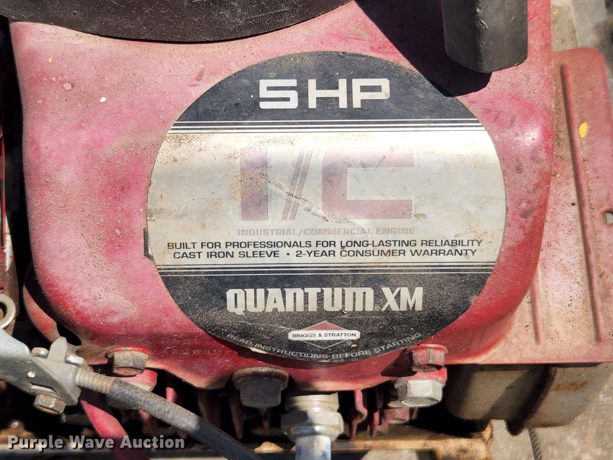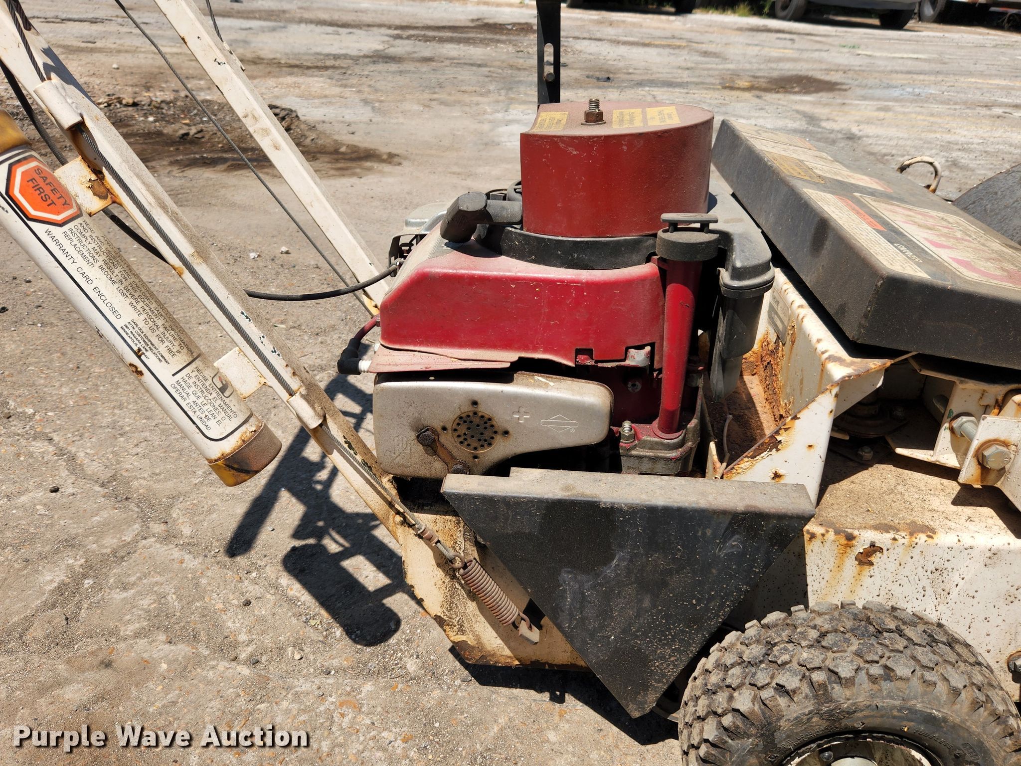 Cimline sweeper. 36" W, Serial: 11671. Engine Briggs & Stratton, Cylinders: 1, HP: 5, Fuel type: Gas. Tires Size: 4.10/3.50-4. Topps Paving & Sealing, LLC. 11502 Dorsett Rd. Maryland Heights, MO 63043