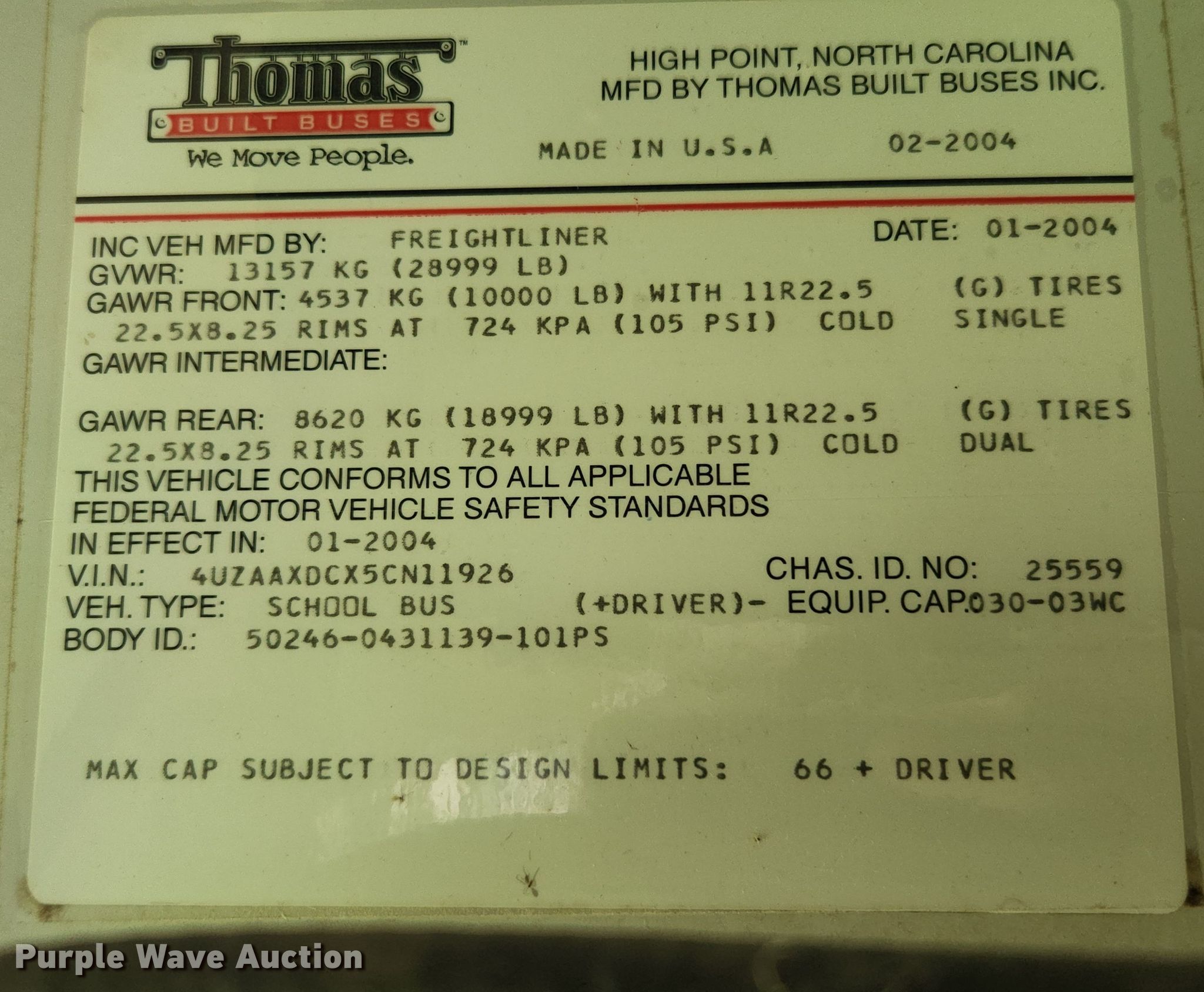 2005 Freightliner FS65 school bus. Miles: 270,326 on odometer, VIN: 4UZAAXDCX5CN11926. Engine Caterpillar C7 ACERT, Displacement: 7.2L, Cylinders: 6, Fuel type: Diesel. Transmission Automatic. Chassis Axles: Single, Suspension: Spring, Brakes: Air, GVWR: 28,999 lbs. Interior AC, Heat, Electric passenger sliding door, Passengers: 12, Child safety seats: 6, Adult seats: 1. Tires Size: 11R22.5. Notes Non-operational AC. Missouri title. Vanduser Gin Co.. 802 Hamilton. Vanduser, MO 63784