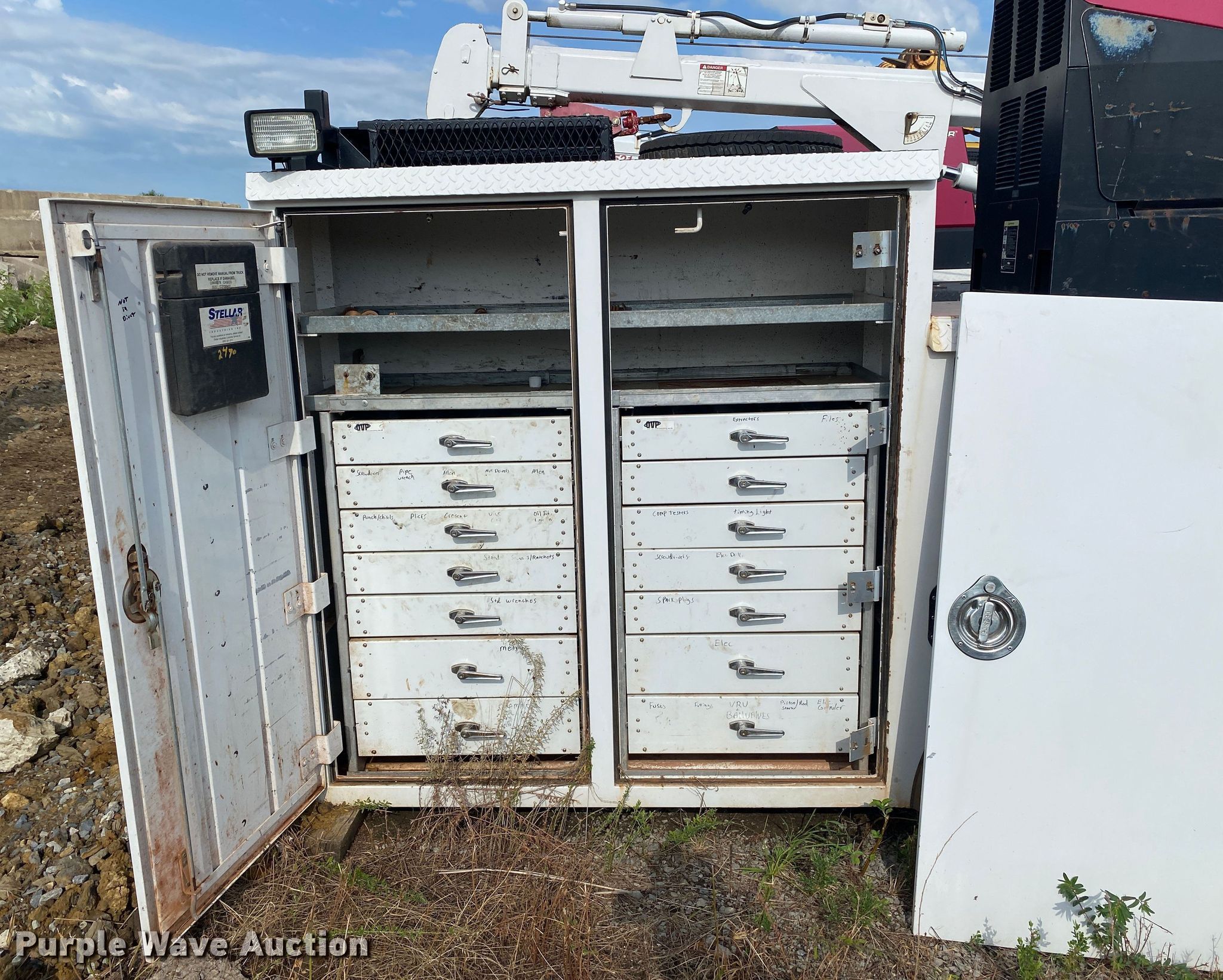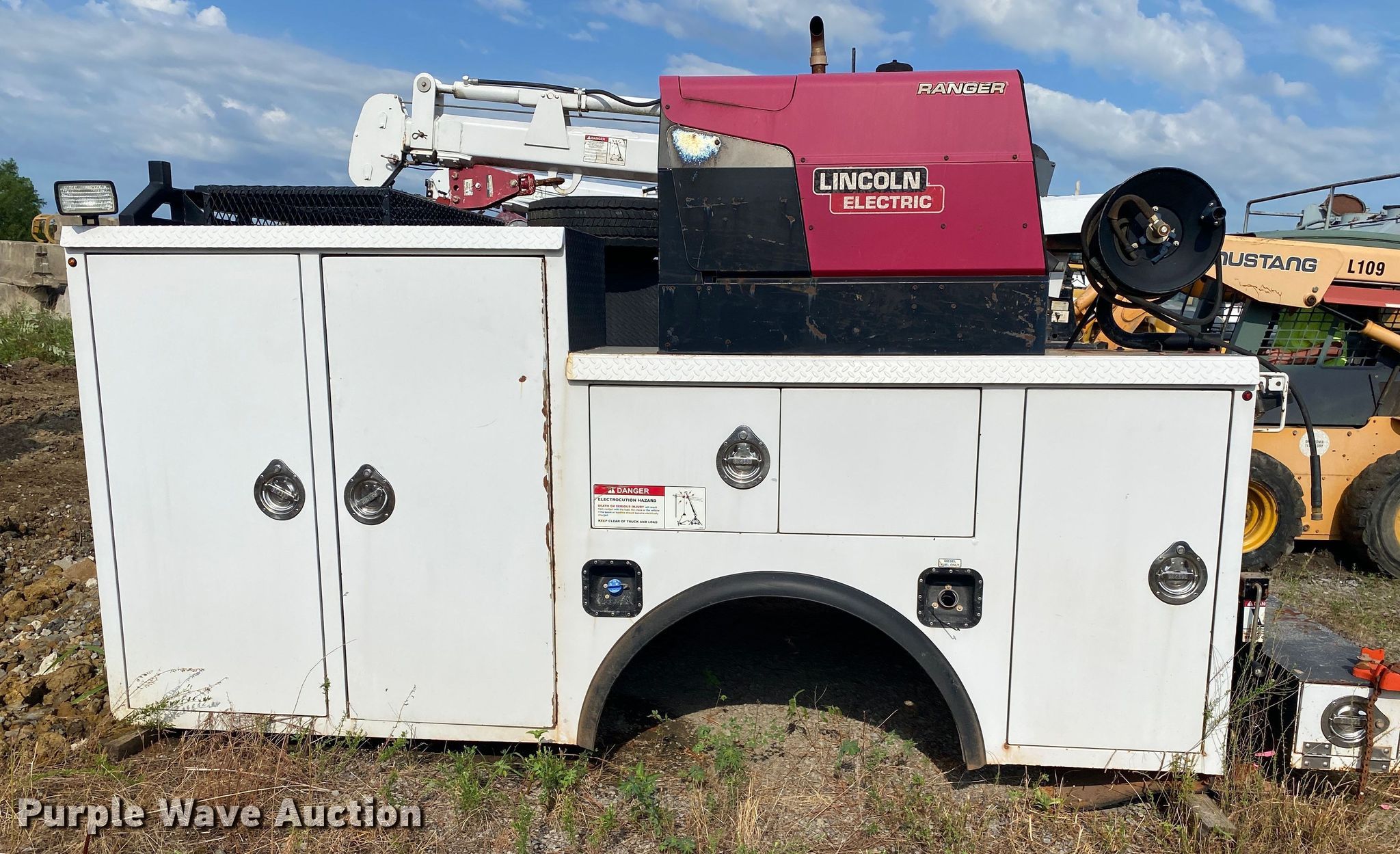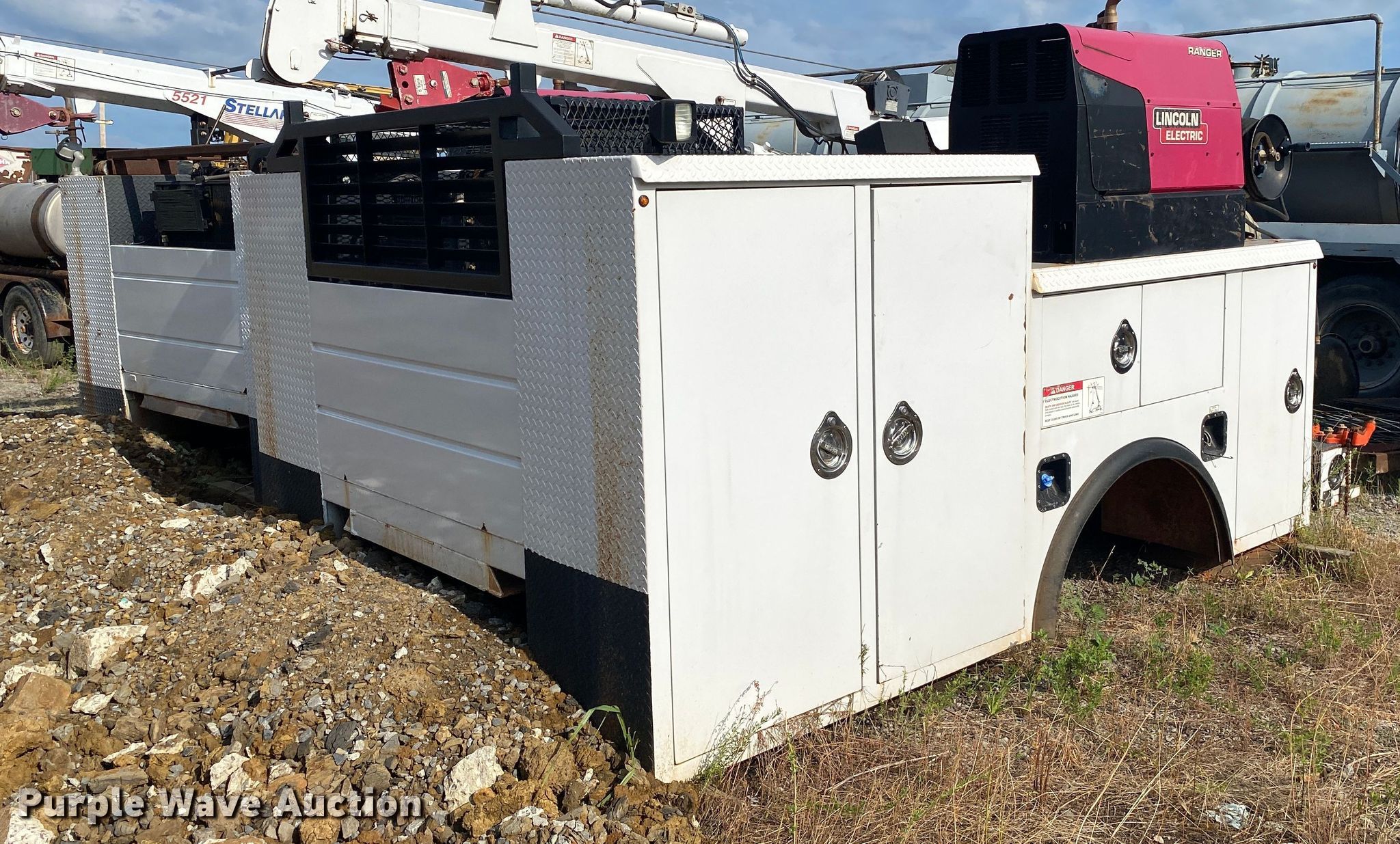 Purple Wave is selling a used Truck Part and Attach. in Oklahoma. This item is a Caseco MM225 utility bed with the following: 11' L x 96" W, Welder/generator, Lincoln Electric 305G Ranger, Fuel type: Diesel, 240V outlets: 1, 120V outlets: 4, Welder type: MIG, Stick (AC/DC), Air compressor, Kohler Command Pro 15, Crane, Stellar 5520, Boom length: 20', Maximum lift capacity: 2,500 lbs