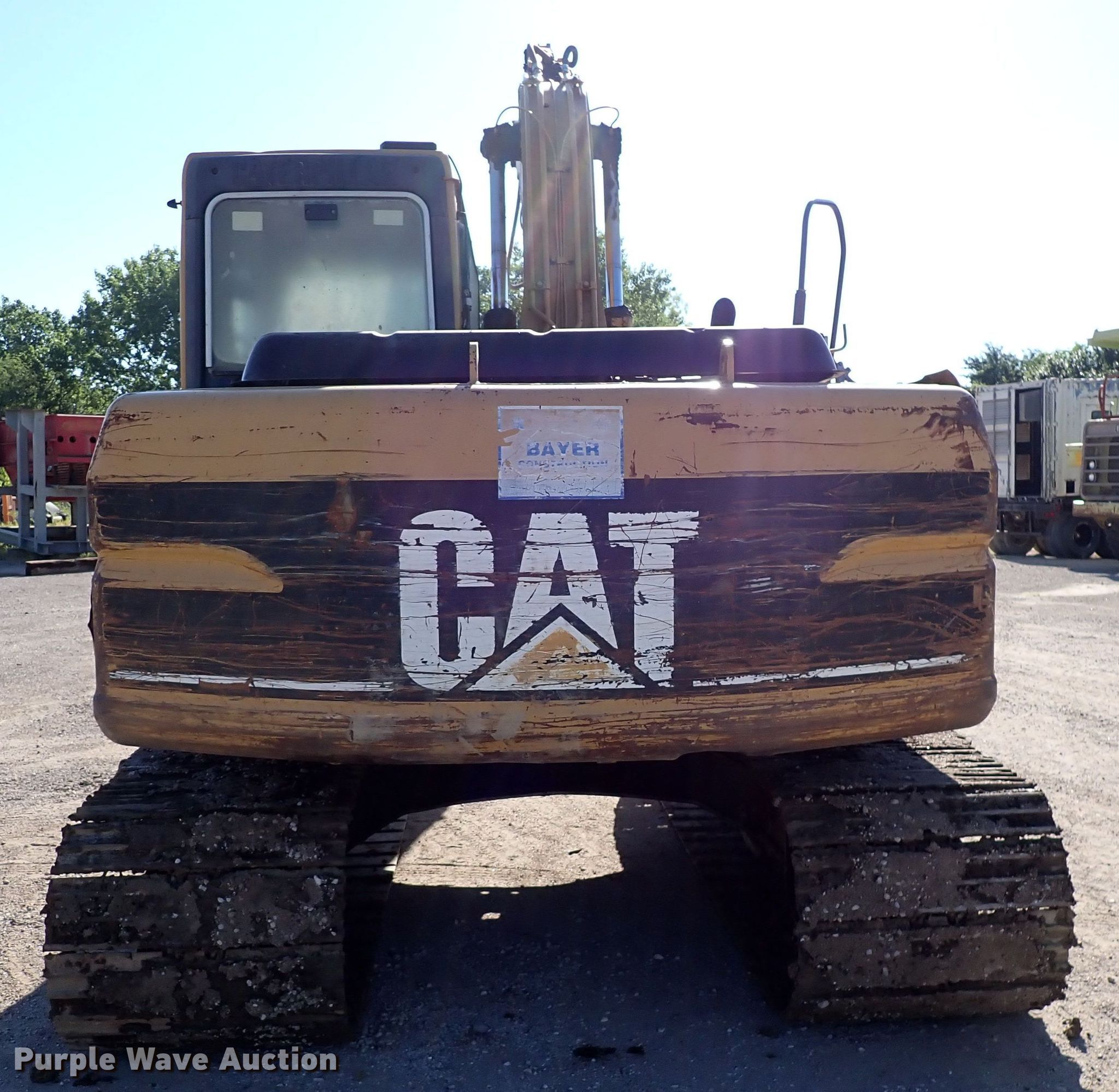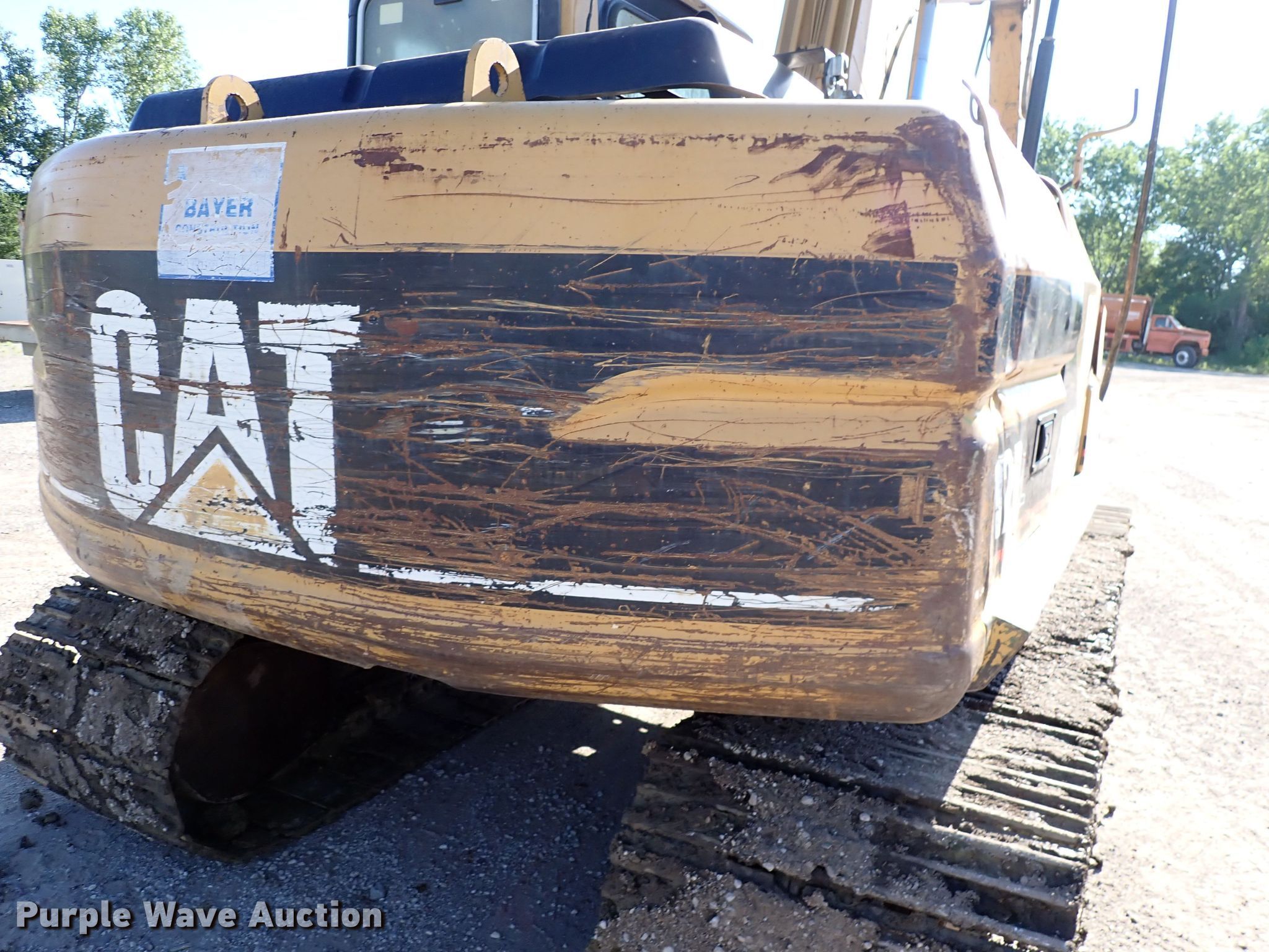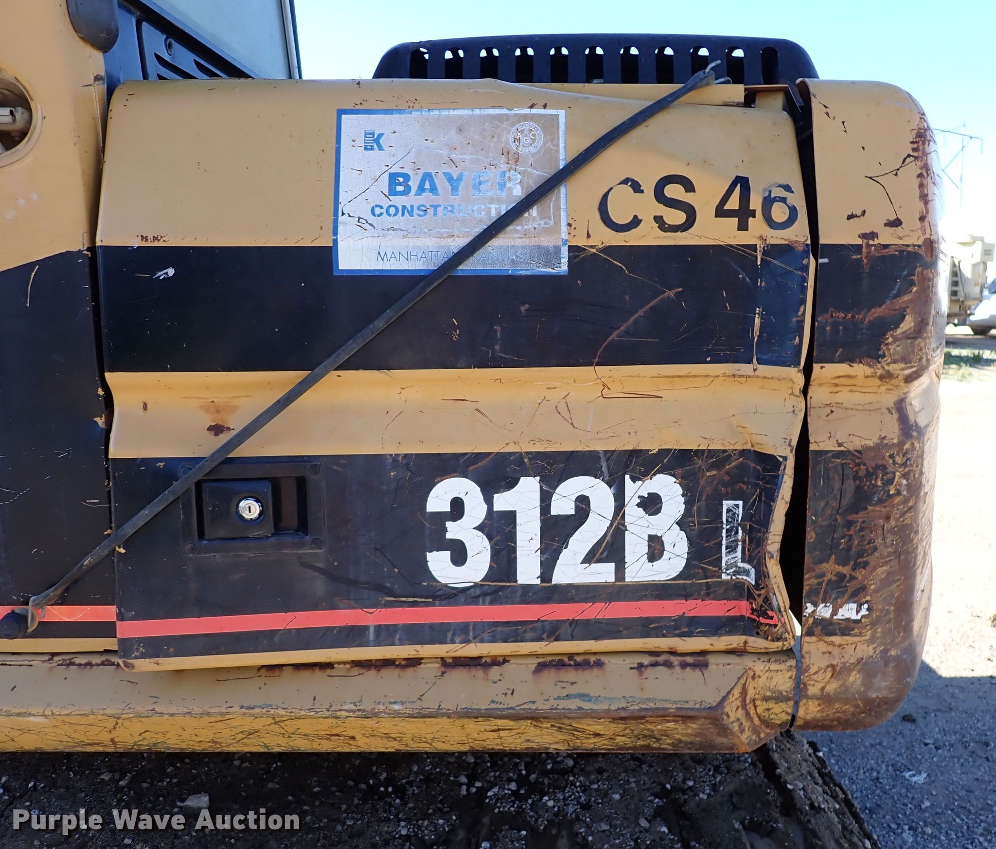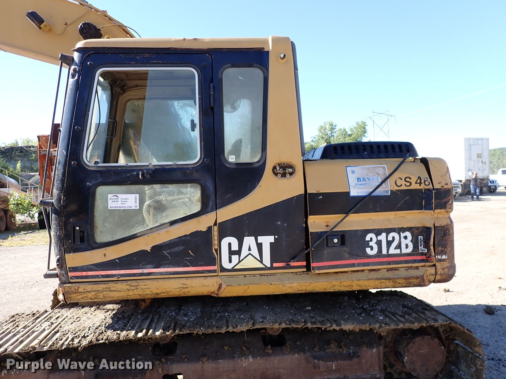 1998 Caterpillar 312BL excavator. Hours: 12,691 on meter, Serial: 8JR01118, Unit #: CS46. Engine Cylinders: 4, Fuel type: Diesel. Transmission Hydrostatic. Operators station Enclosed cab, AC, Heat. Features Standard, Boom Standard, Stick Stick length: 10', Thumb: Manual, Bucket Caterpillar, Width: 40". Tracks Width: 30", Steel, Grouser pads: Triple. Notes Engine oil leaks, Hydraulic leaks, Damaged roller, Damaged grouser pads, Unknown operating condition of AC. Bayer Construction Company. 120 Deep Creek Road. Manhattan, KS 66502