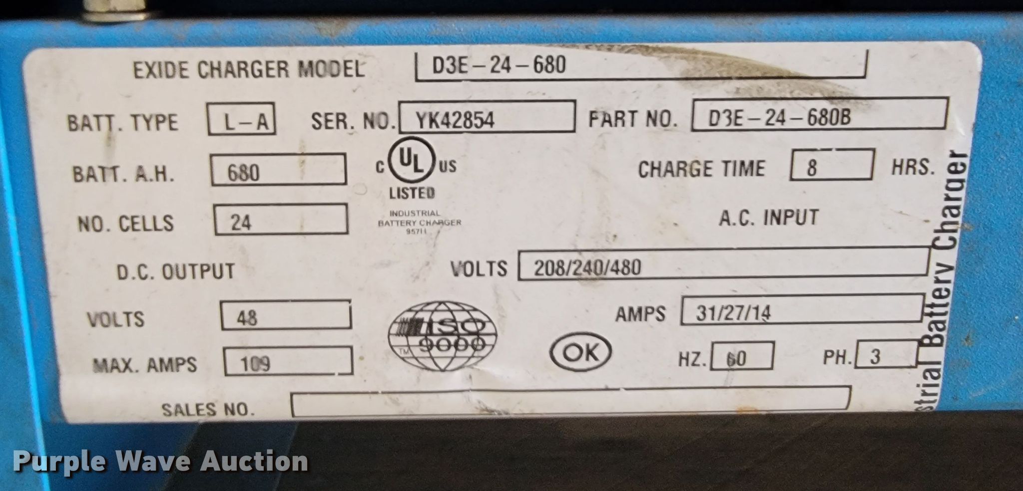 Toyota 5FBE18 forklift. Hours: 18,708 on meter, Serial: 32055. Electric Motor Volts: 48, Phase: Three, Charger: Three phase. Transmission Powershift. Operators station OROPS. Features Maximum lift capacity: 3,230 lbs, Maximum lift height: 189", Mast stages: 3, Side shift, Mast tilt, Fork length: 48". Tires Size: 18x7x12, Solid. Notes (2) chargers, Dead battery, Non-operational unit. Milliken Electric. 7th Street East. Mobridge, SD 57601