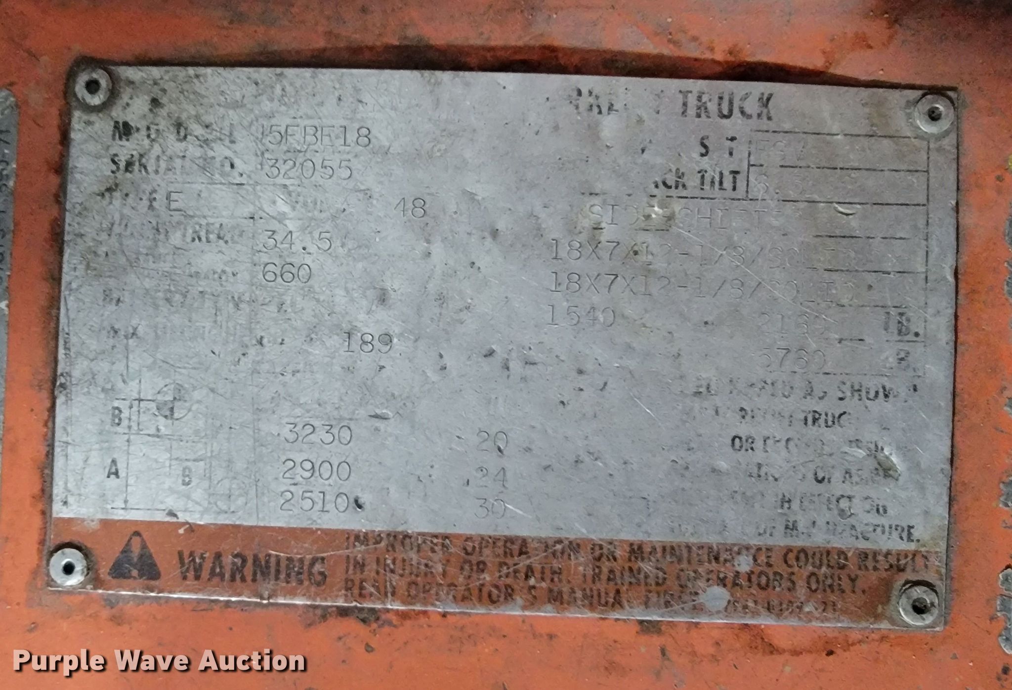 Purple Wave is selling a used Warehouse Forklift in South Dakota. This item is a Toyota 5FBE18 forklift with the following: Hours: 18,708 on meter, Serial: 32055
