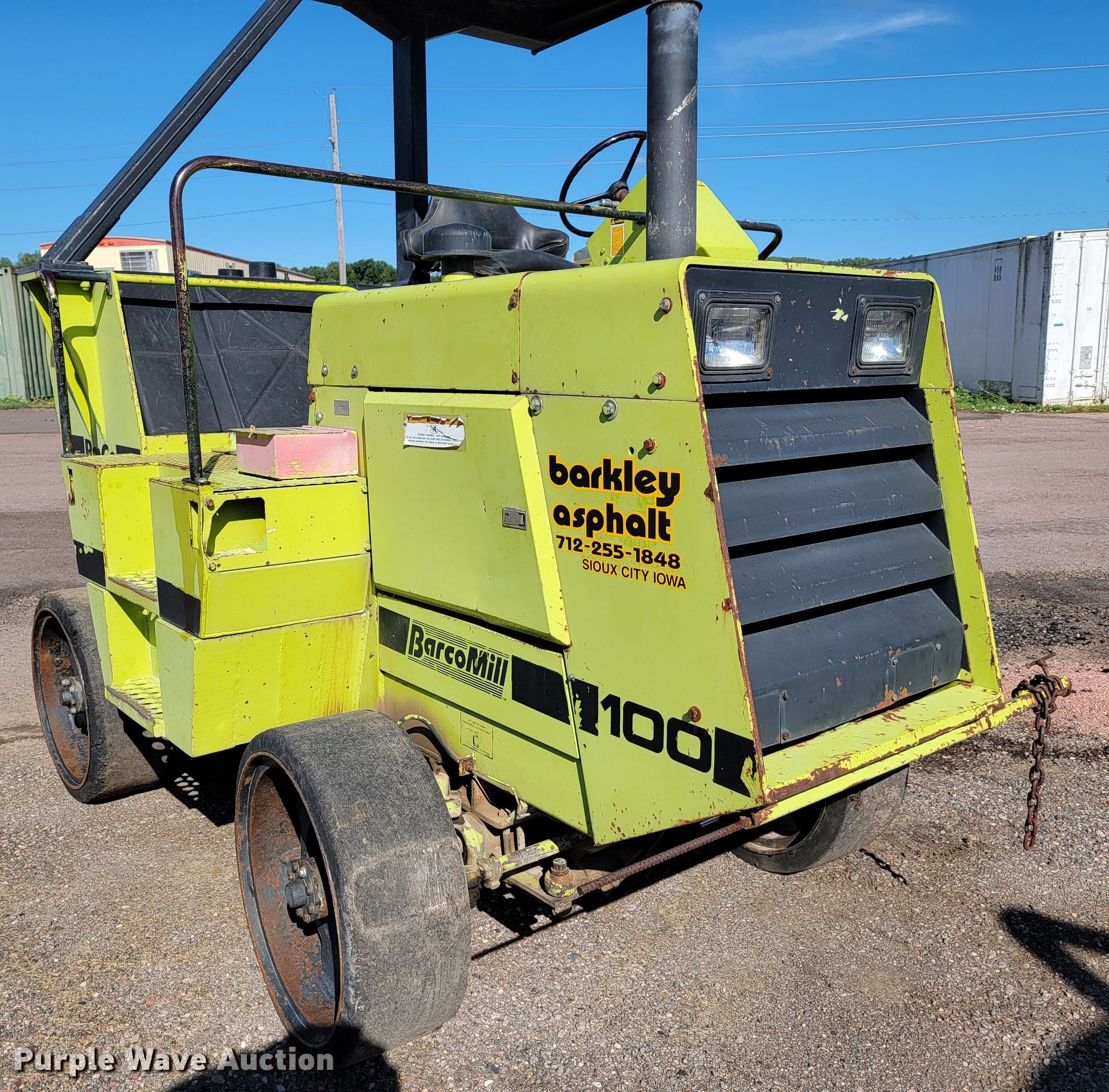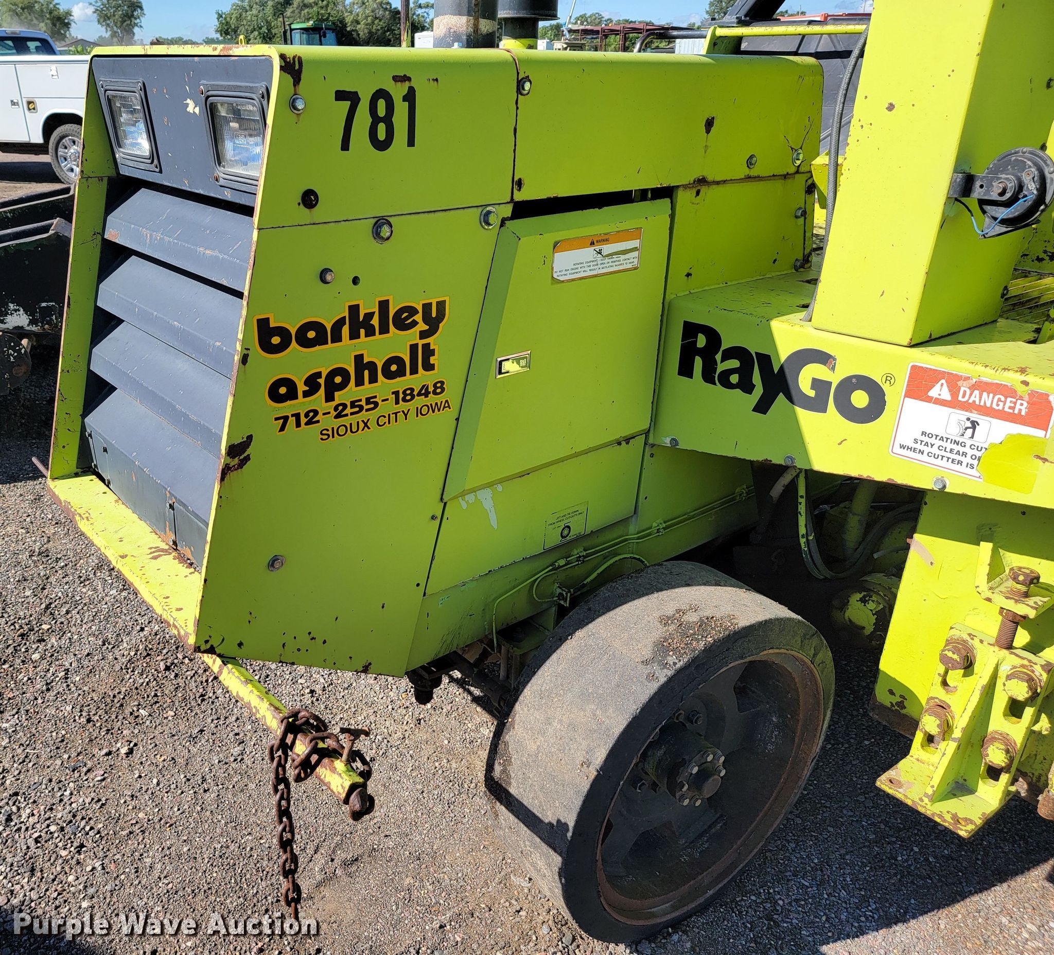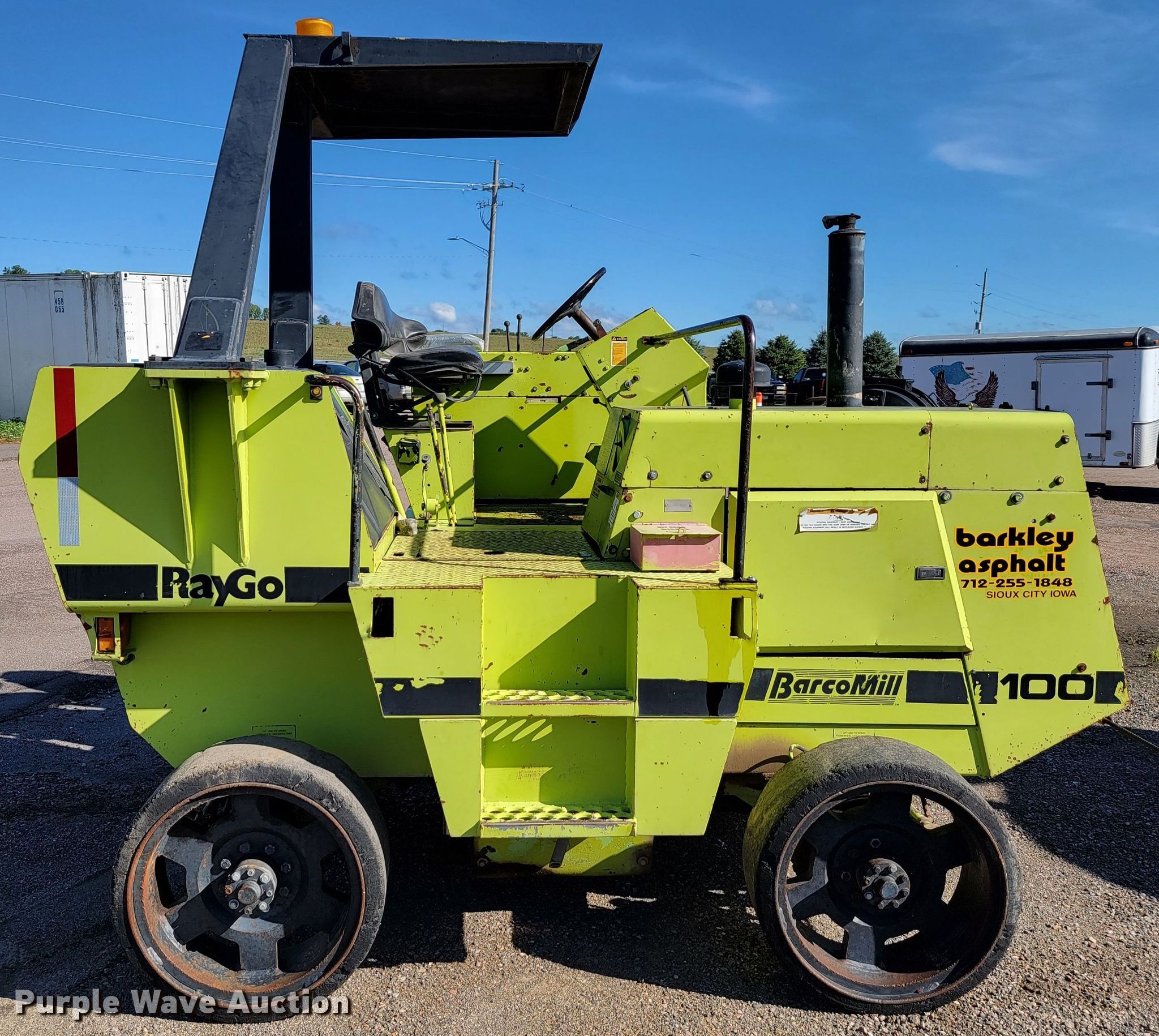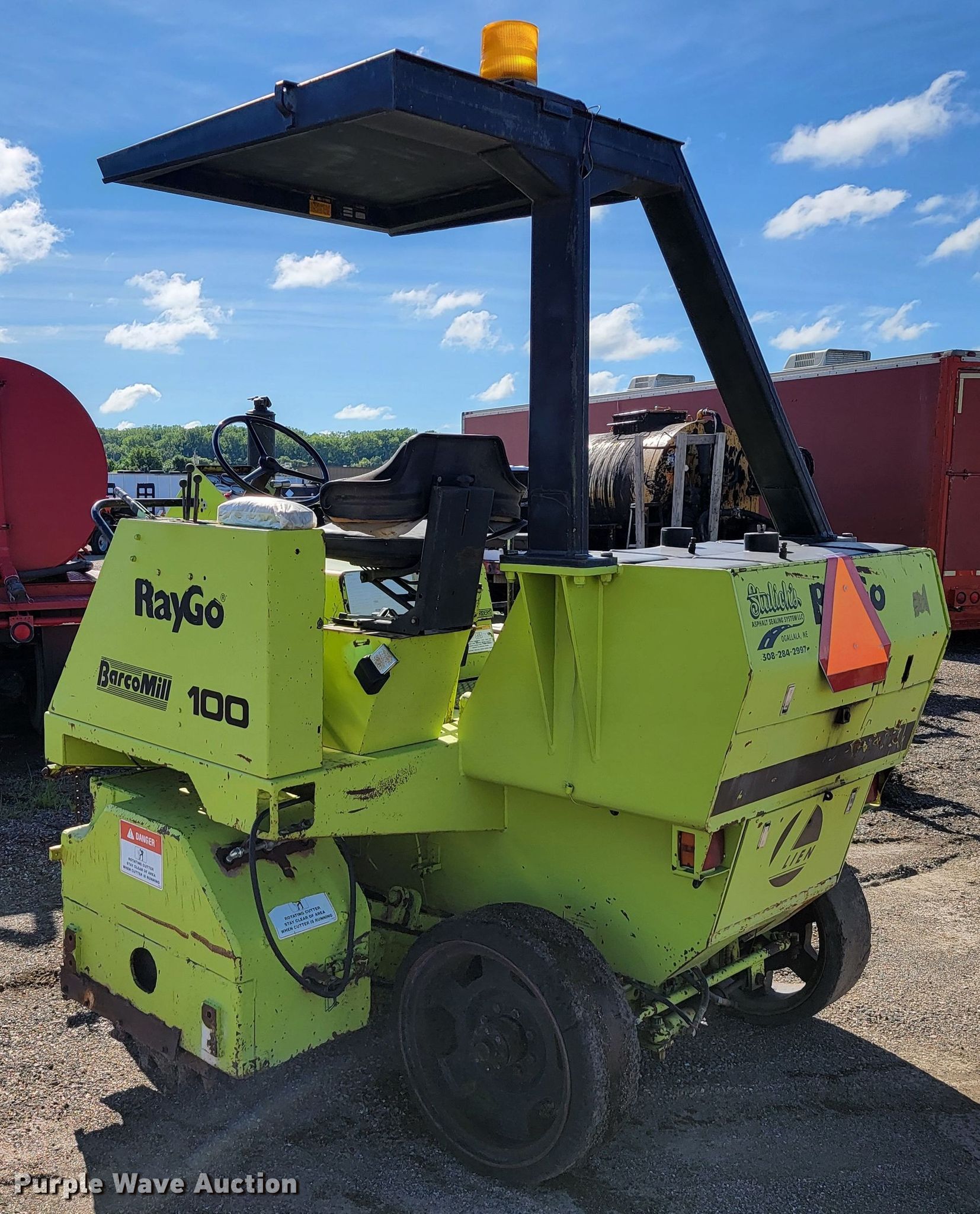 Raygo Barco Mill 100 milling machine. Hours: 3,766 on meter, Serial: U010930781. Engine Cylinders: 4, Fuel type: Diesel. Transmission Hydrostatic. Operators station OROPS. Features Cutting head Width: 12", Diameter: 29", Teeth, Water/emulsion application system, Crab steering. Tires Size: 28x10x22, Solid. Barkley Asphalt Inc.. 3320 Rustin St. Sioux City, IA 51105
