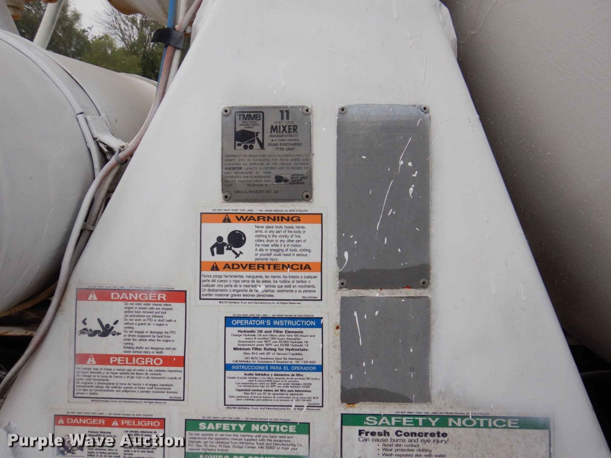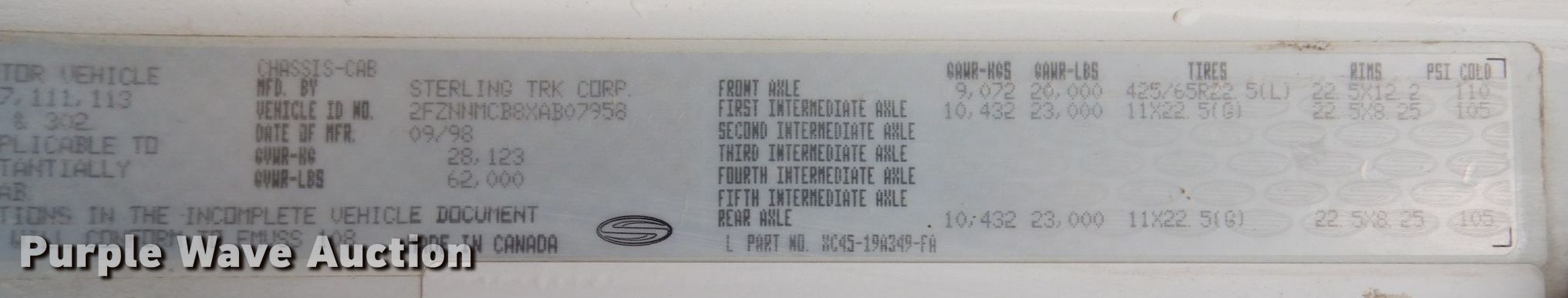 1999 Sterling LT9511 ready mix truck. Miles: 189,788 on odometer, Hours: 22,293 on meter, VIN: 2FZNNMCB8XAB07958. Engine Cummins ISM, Displacement: 10.8L, Cylinders: 6, Fuel type: Diesel. Transmission Eaton Fuller Roadranger RTO -9 MLL, Manual, Speed: 11. Chassis Axles: Triple, Tag axle, Differential lock: Full, Suspension: Walking beam, Brakes: Air, PTO, GVWR: 62,000 lbs FAWR: 20,000 lbs, IAWR: 23,000 lbs, RAWR: 23,000 lbs. Interior Heat, Heated mirrors, Cruise control, Auxiliary controls. Features Mixer Mcneilus, Capacity: 11 cu.yd., Discharge: Rear, In-cab controls, Rear drum controls, Water tank capacity: 150 gallons, Chute Extensions: 3, Chute type: Steel.. Tires Front: 425/65R22.5, Rear: 11R22.5, Lift axle: 255/70R22.5. Notes Previously JI9349, Dash warning indicator: Engine warning, Windshield chipped or cracked. Illinois title. All American Ready Mix. 2510 Richards Ln. Springfield, IL 62702