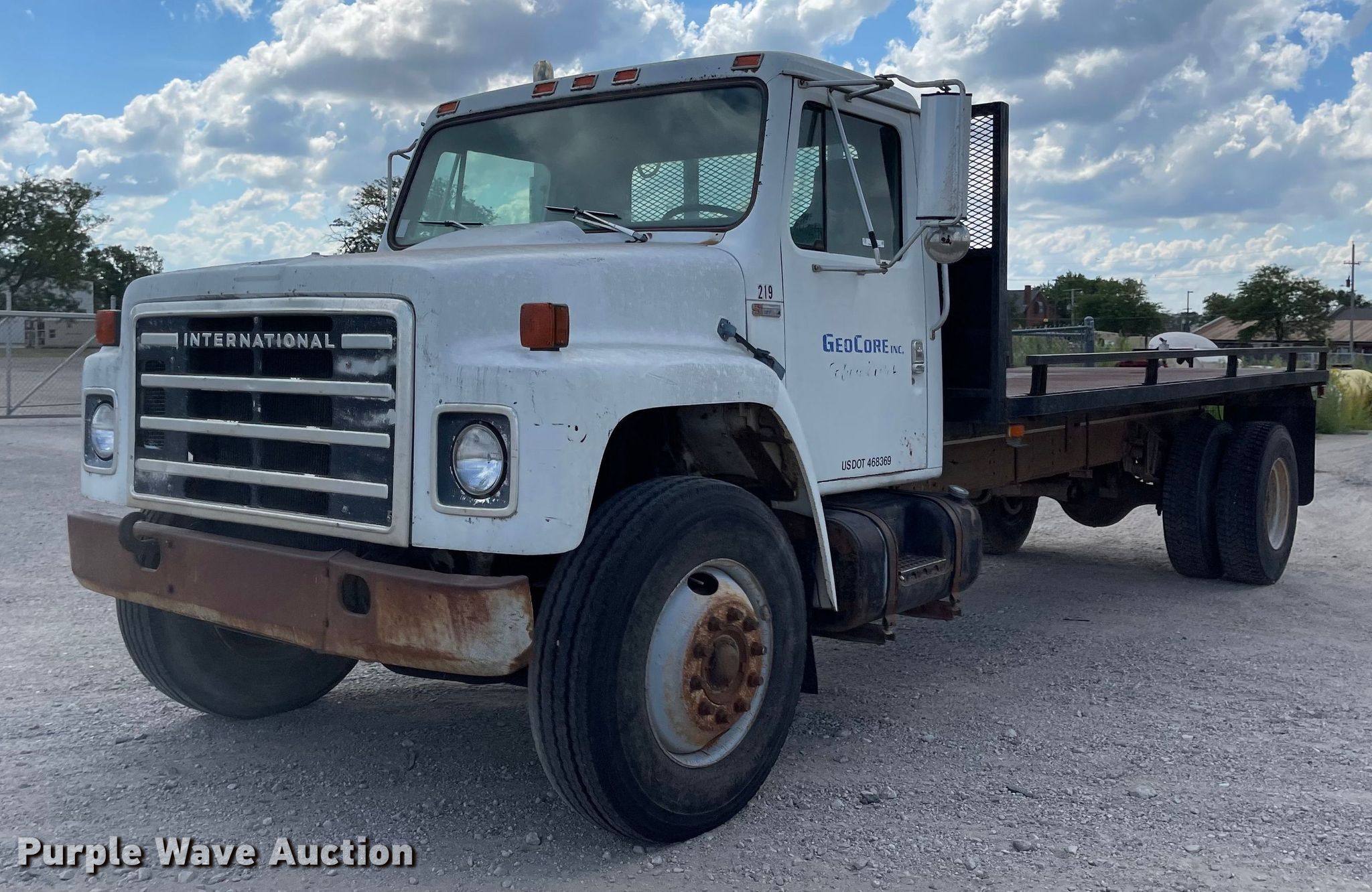 1983 International S1954 flatbed truck. Miles: 227,257 on odometer, VIN: 2HTAA19EXDCA15499. Engine International DT466, Displacement: 7.6L, Cylinders: 6, Fuel type: Diesel. Transmission Manual, Speed: 5, plus 2. Chassis Axles: Single, Suspension: Spring, Brakes: Hydraulic. Interior Heat, Brake controller. Features Flatbed 18' L x 92" W. Tires Size: 11R22.5. Notes Batteries not included, Non-operational brakes, Non-operational power steering. Kansas title. GeoCore, Inc.. Salina, KS 67401