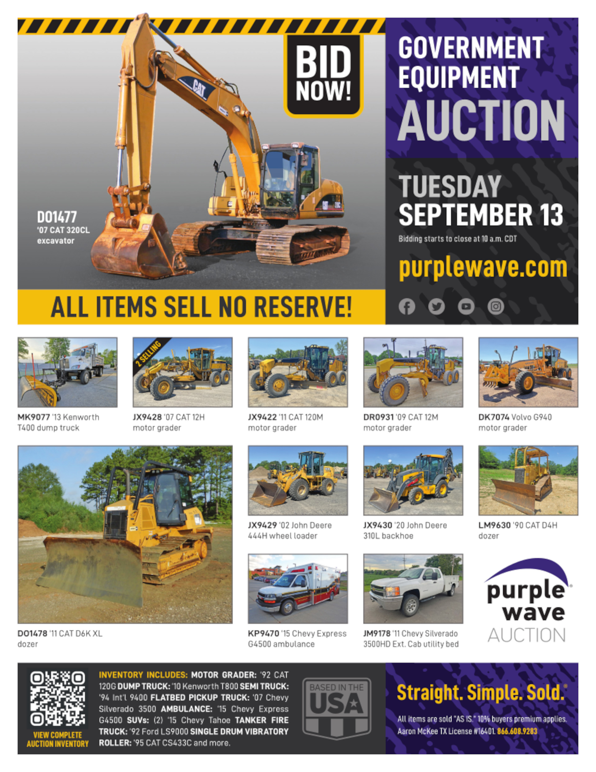 This auction is conducted by Purple Wave, Inc., whose home office is 825 Levee Drive, Manhattan, Kansas. Aaron McKee, Texas auctioneer license # 16401, operates Purple Wave, Inc. Complaints against us may be directed to the Texas Department of Licensing and Regulation, P.O. Box 12157, Austin, Texas 78711, (512) 463-6599. For additional required information, see the attached document.