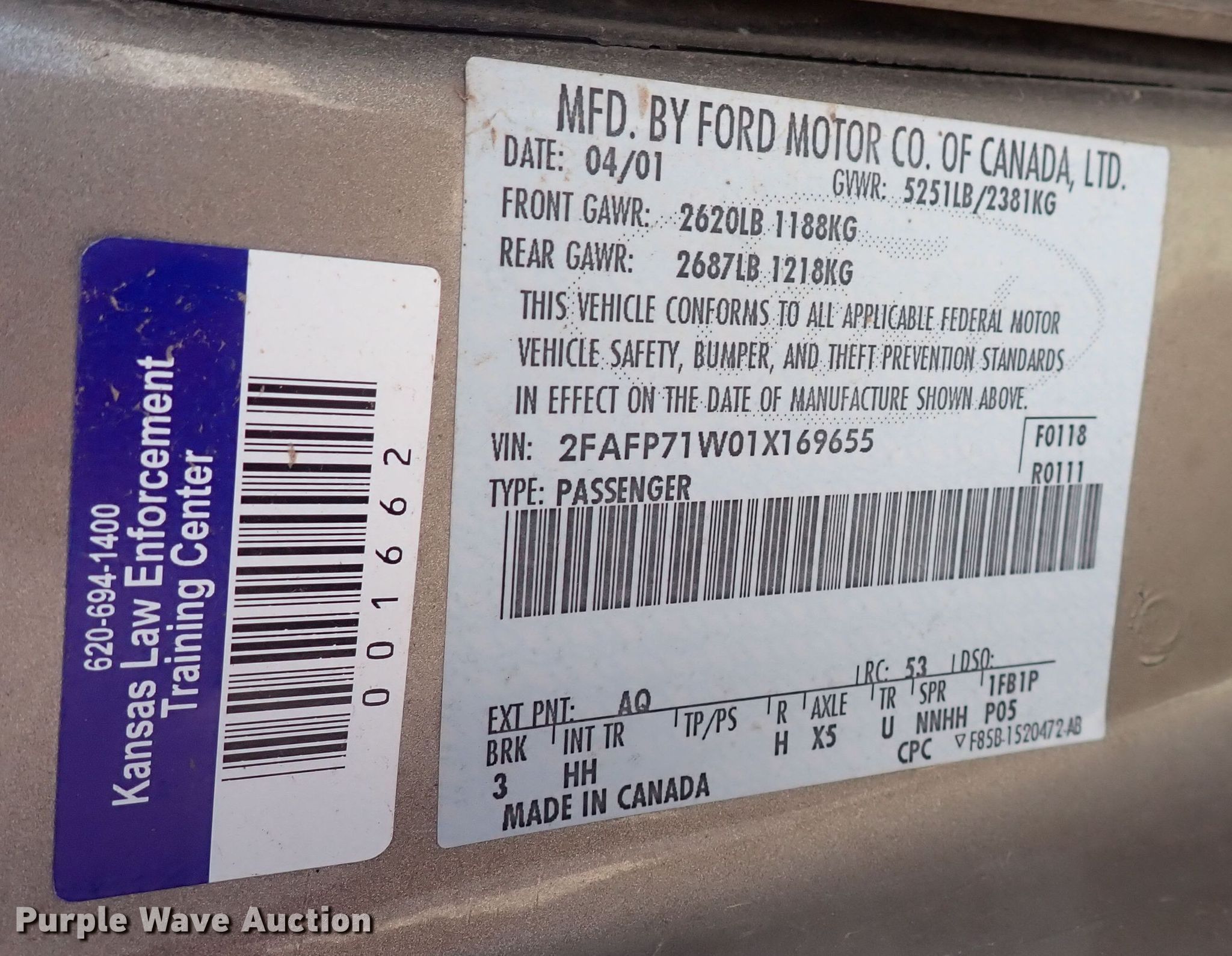2001 Ford Crown Victoria Police Interceptor. Miles: 38,594 on odometer, VIN: 2FAFP71W01X169655. Engine Displacement: 4.6L V8 SOHC, Cylinders: 8, Fuel type: Gas. Transmission Automatic. Interior AC, Heat, Seat: Power driver, Power windows, Power locks, Cruise control. Tires Size: 225/60R16. Notes Windshield chipped or cracked, Non-operational unit. Kansas title. Seller is a government entity who will be assigning and distributing the title. Please contact the seller for distribution questions. Kansas Law Enforcement Training Center. 11009 S Hornet Rd. Hutchinson, KS 67501