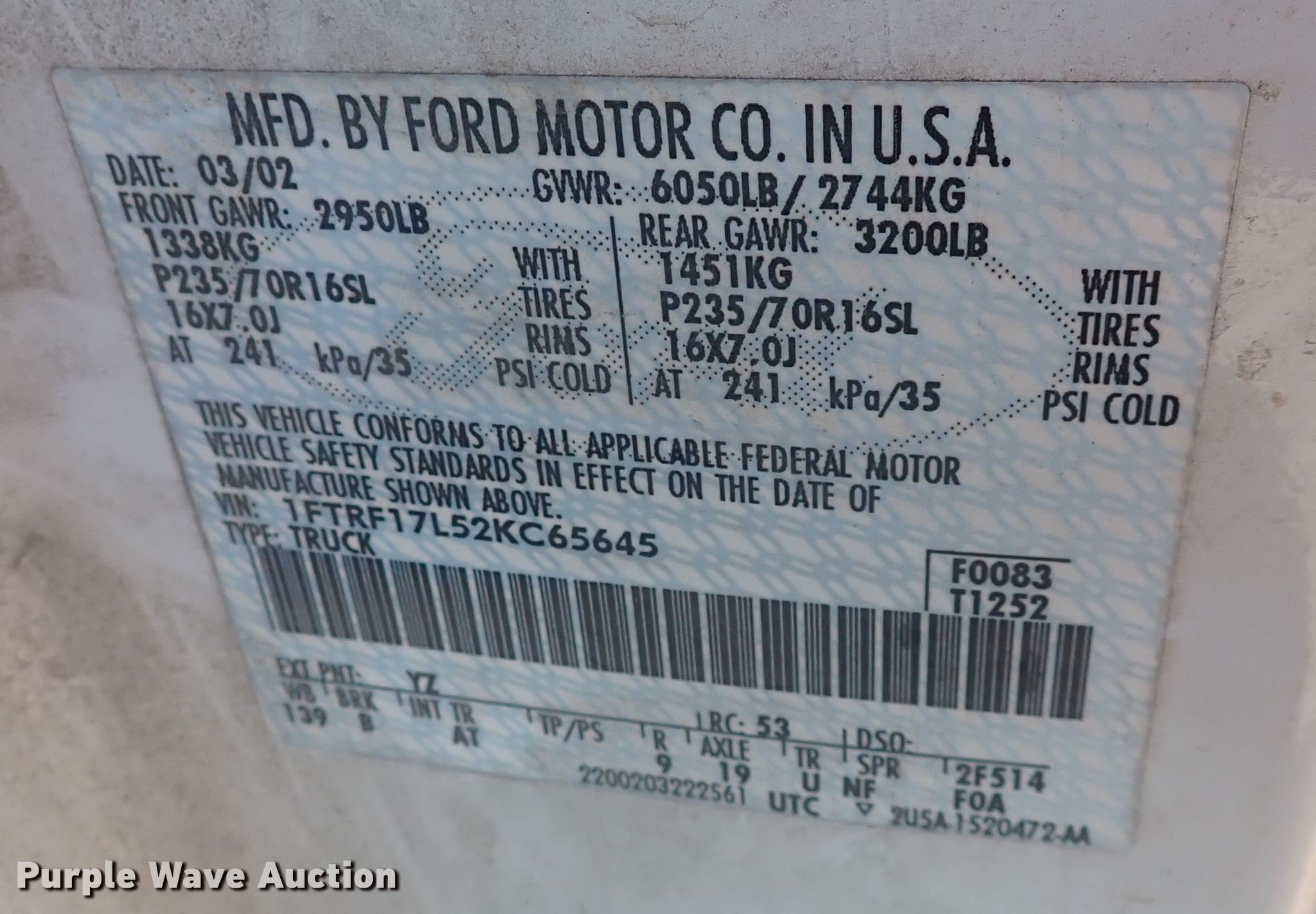 Purple Wave is selling a used 1/2 Ton Pickup or Van in Kansas. This item is a 2002 Ford F150 pickup truck with the following: Miles: 73,233 on odometer, VIN: 1FTRF17L52KC65645