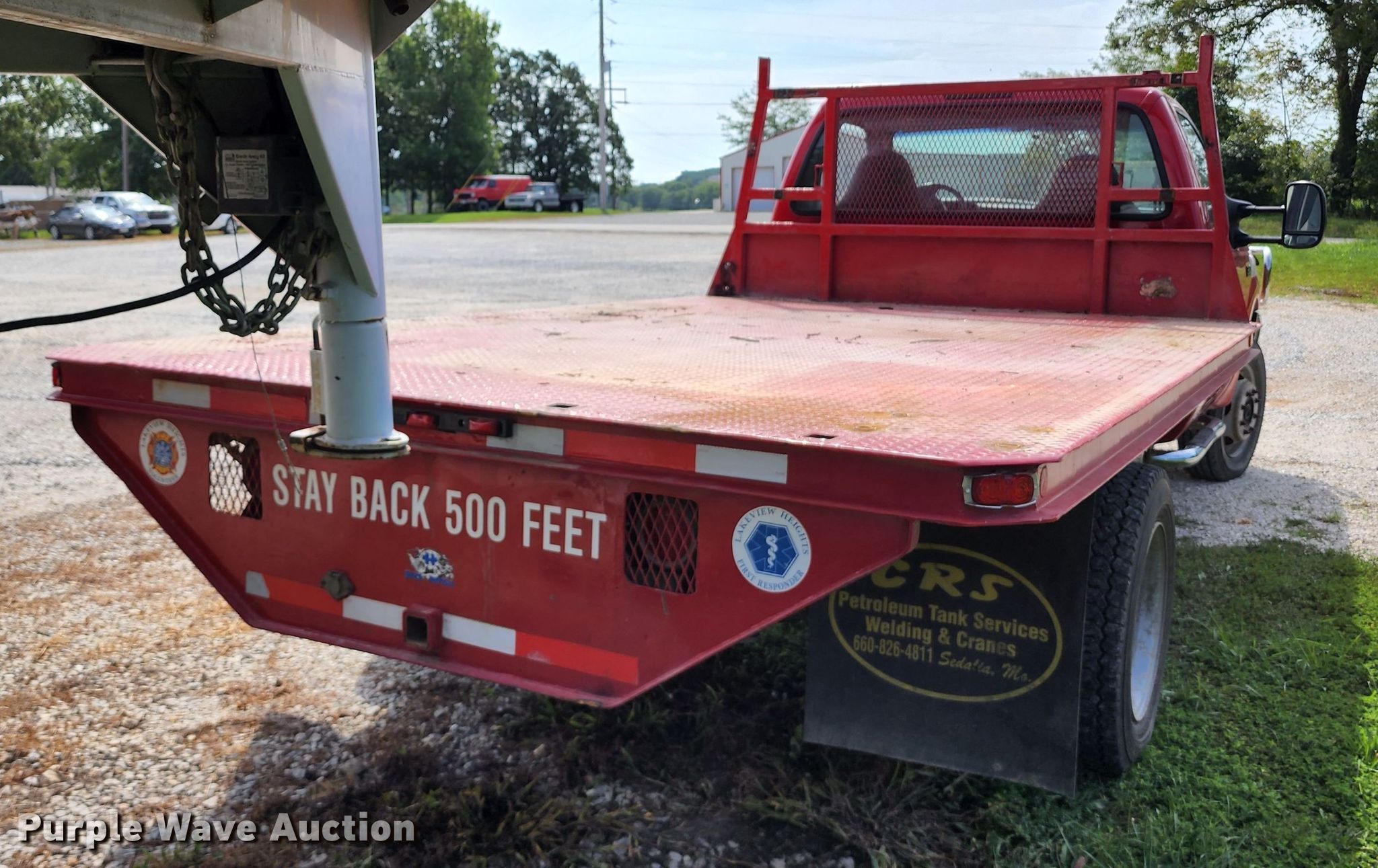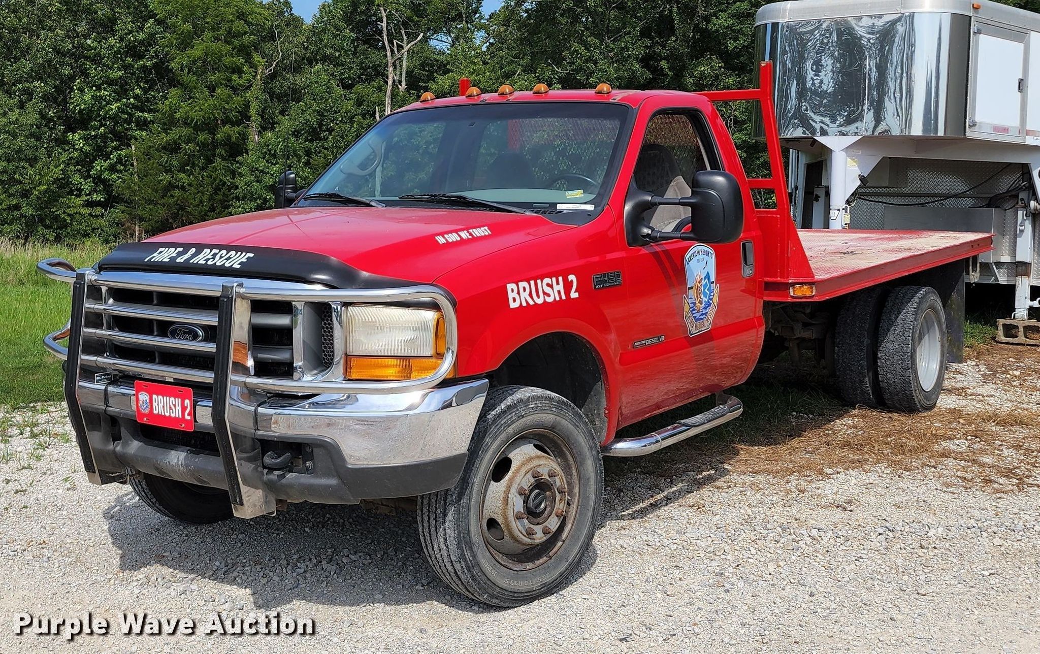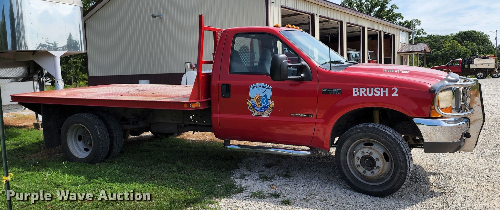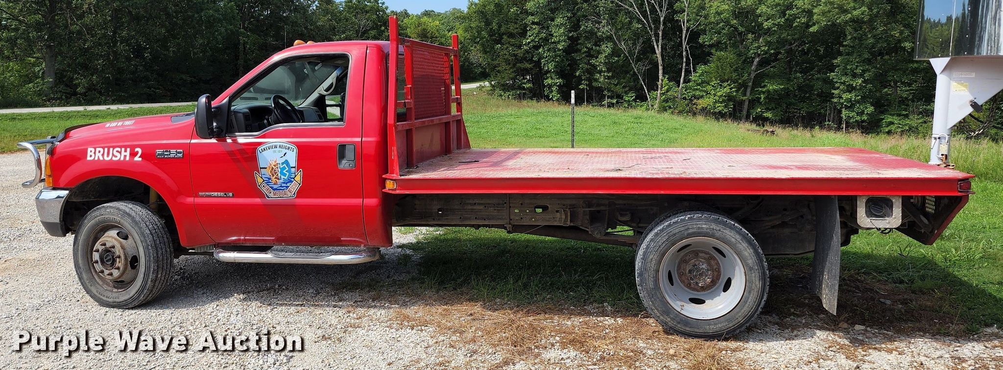 2000 Ford F450 Super Duty flatbed truck. Miles: 221,386 on odometer, VIN: 1FDXF47F4YEB02622. Engine Displacement: 7.3L, Cylinders: 8, Fuel type: Diesel. Transmission Manual, Speed: 6. Chassis Four wheel drive, Axles: Single, Suspension: Spring, Brakes: Hydraulic. Interior AC, Heat, Power windows, Power locks, Cruise control. Features Flatbed 12' L x 96" W. Tires Size: 225/70R19.5. Missouri title. Lakeview Heights Fire Protection District. 23103 Highway West. Cole Camp, MO 65325