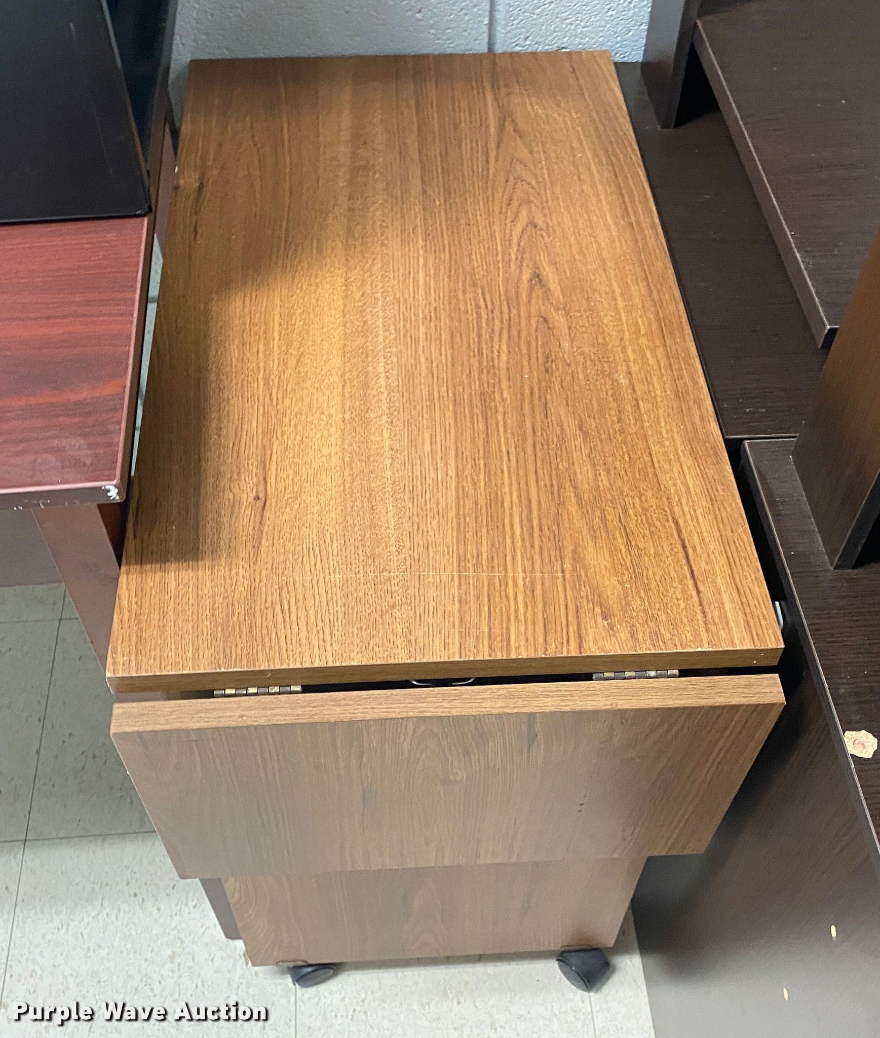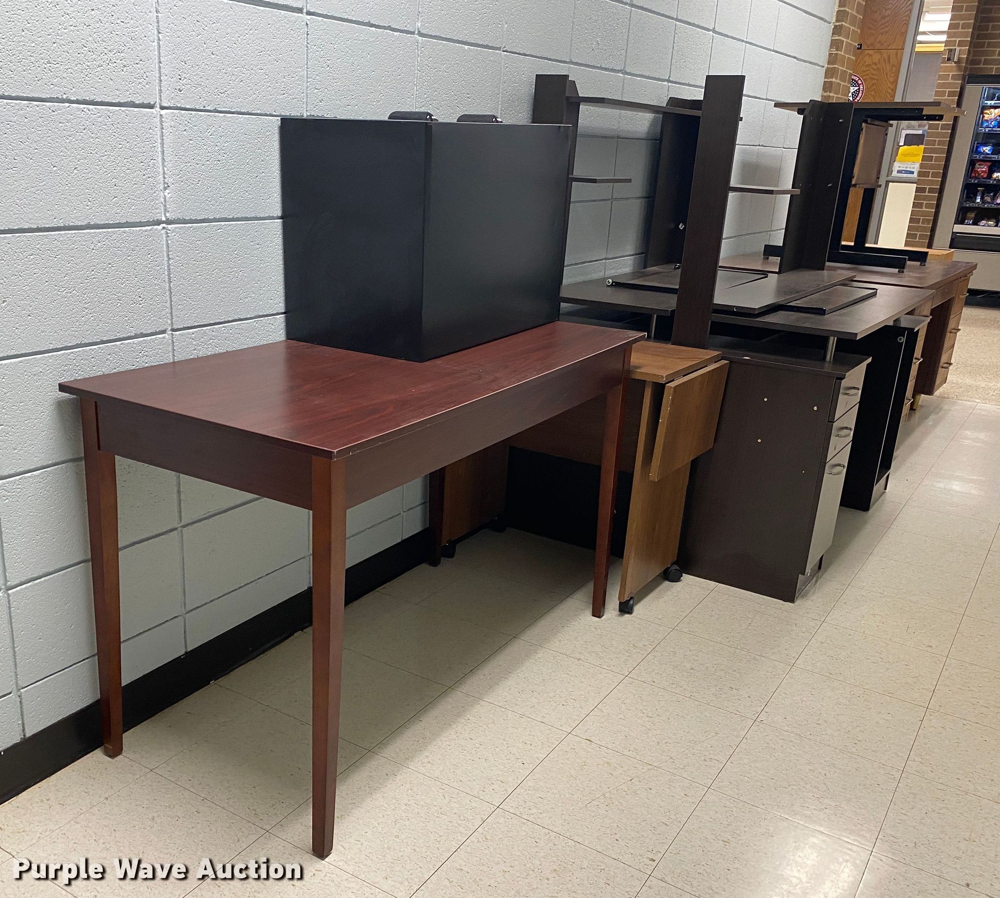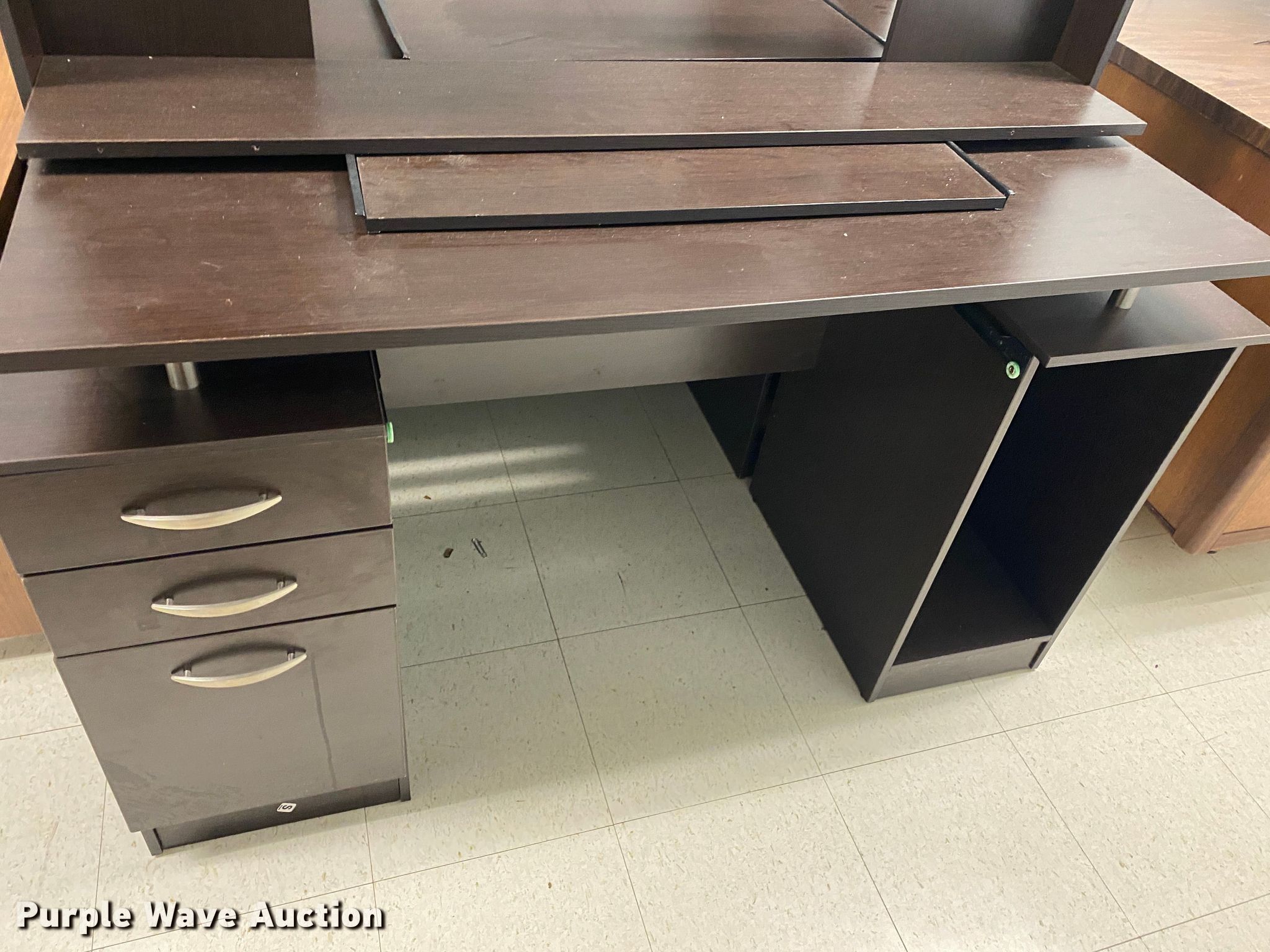 Purple Wave is selling a used Furniture in Oklahoma. This item is a Furniture with the following: Bookcase, 28" x 12", Desk, 5' x 3', (2) computer desks, 4' x 19", Two drawer file cabinet, Typewriter desk, Printer table, 26" x 26", (3) chairs