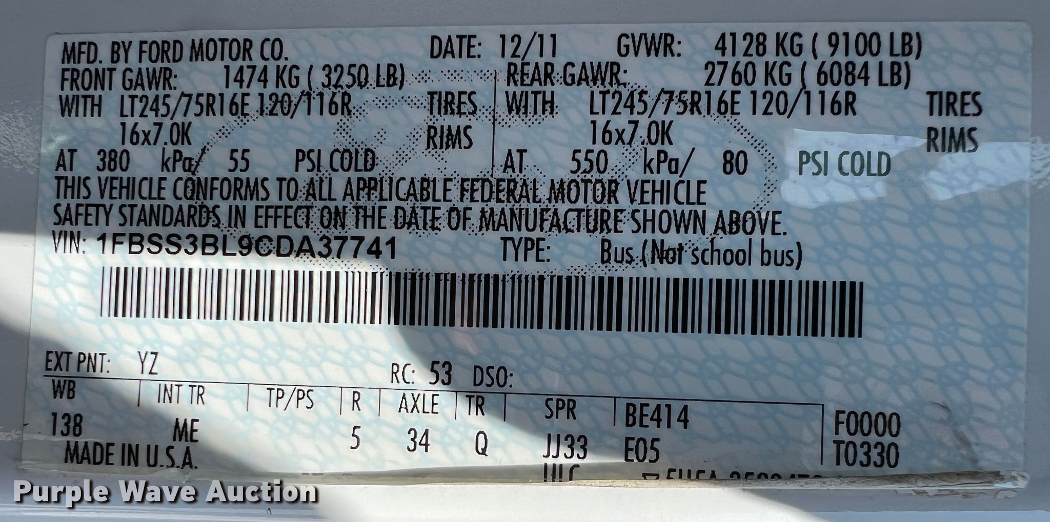 Purple Wave is selling a used Passenger Vehicle in Kansas. This item is a 2012 Ford E350 Super Duty XLT van with the following: Miles: 75,978 on odometer, VIN: 1FBSS3BL9CDA37741
