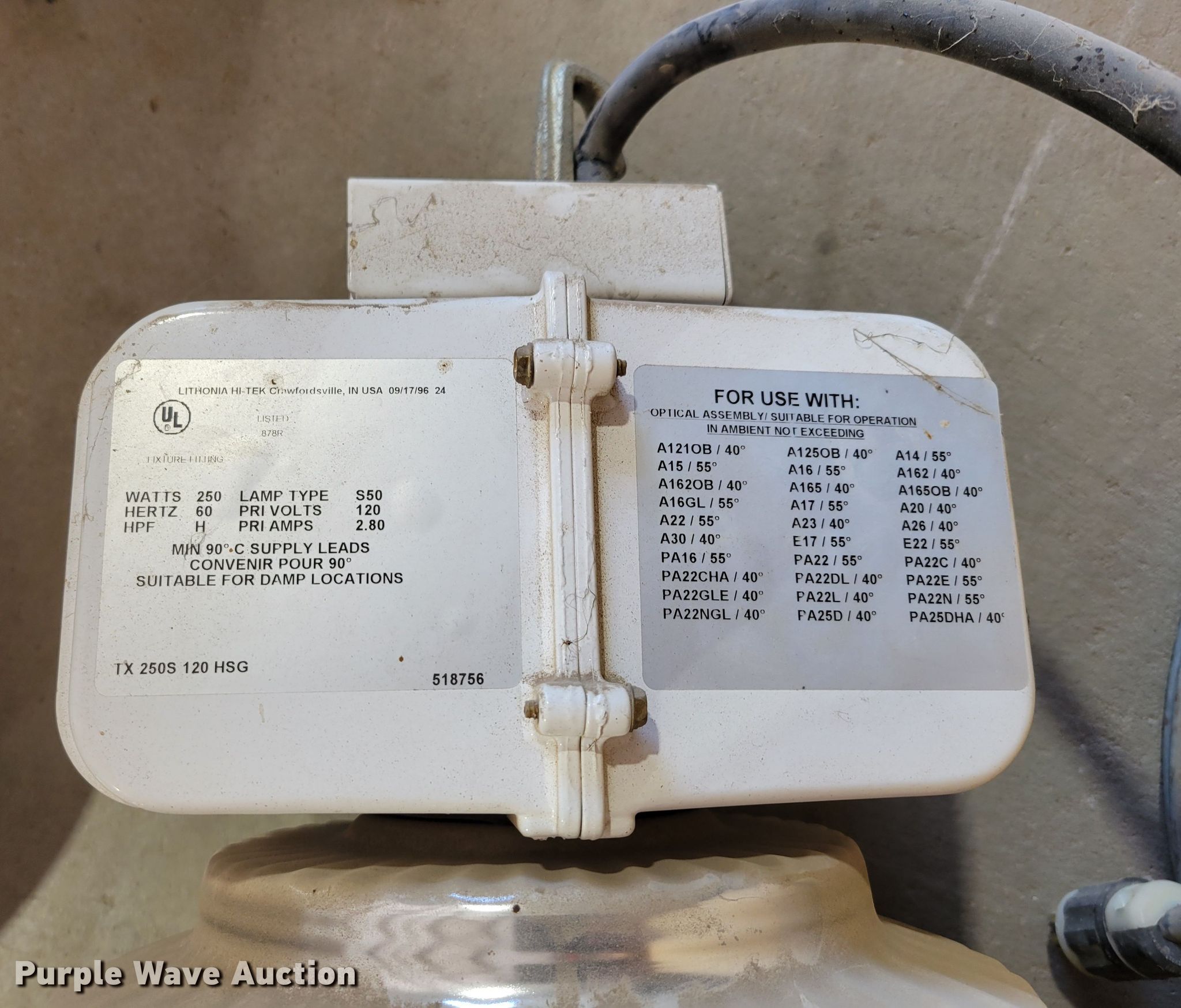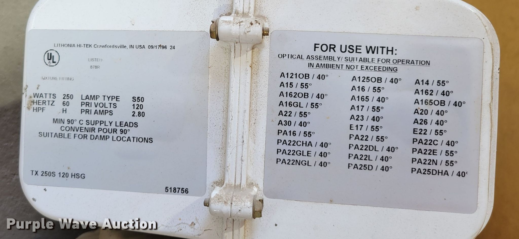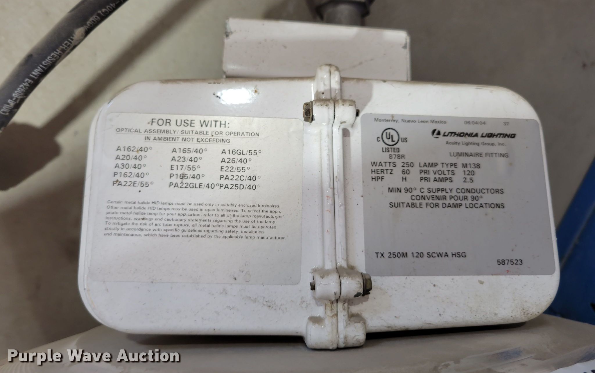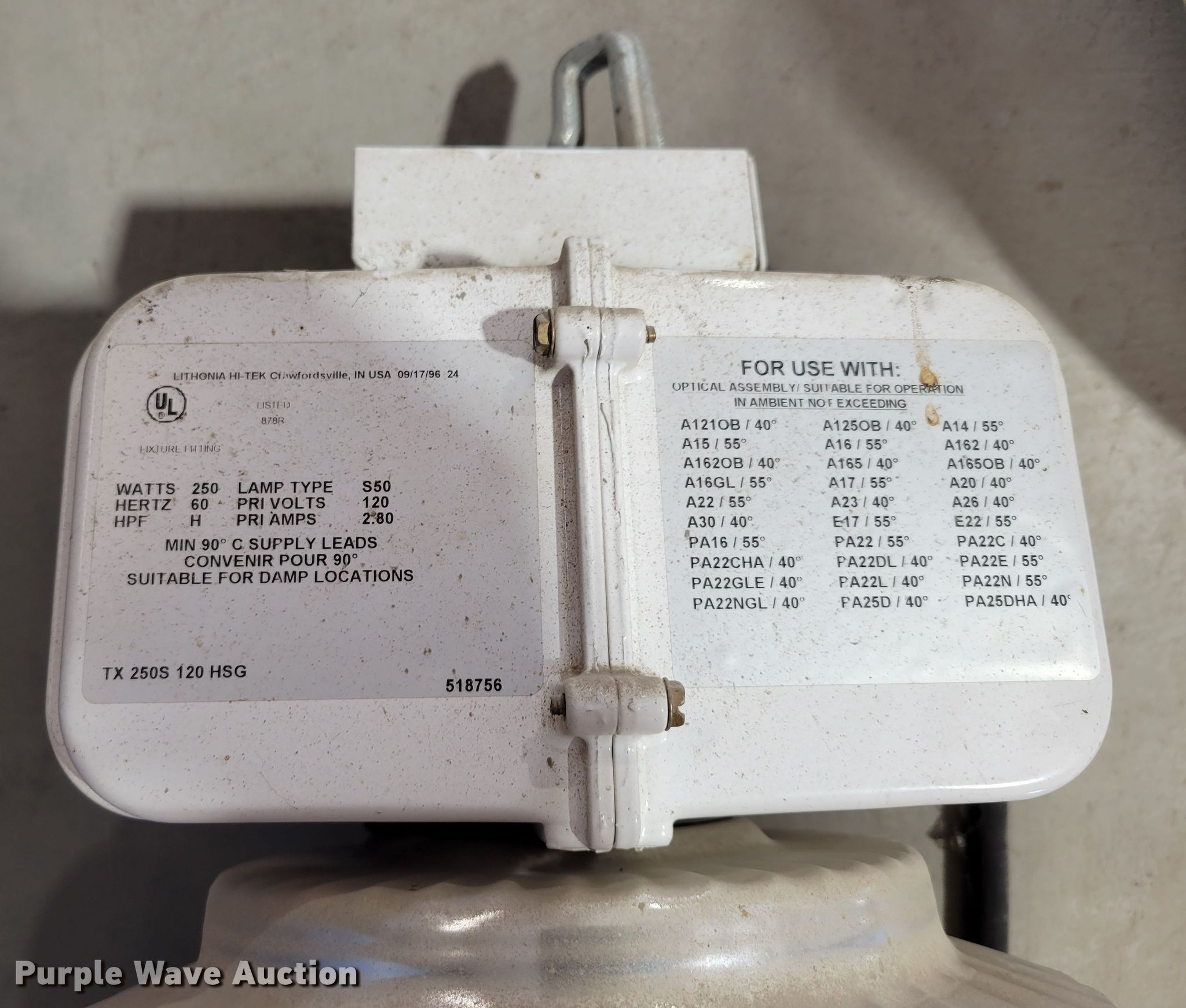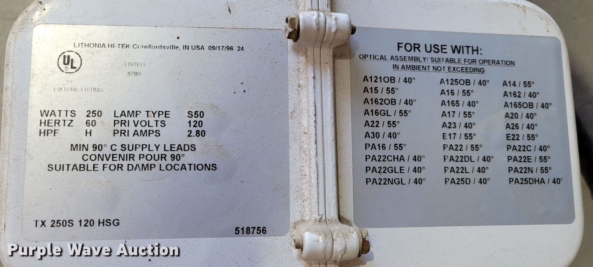Purple Wave is selling a used Building Materials in Nebraska. This item is a (5) lights with the following: (4) Lithonia Hi-Tek lights, 250 watts, 60 Hz, Lithonia Lighting light, 250 watts, 60 Hz