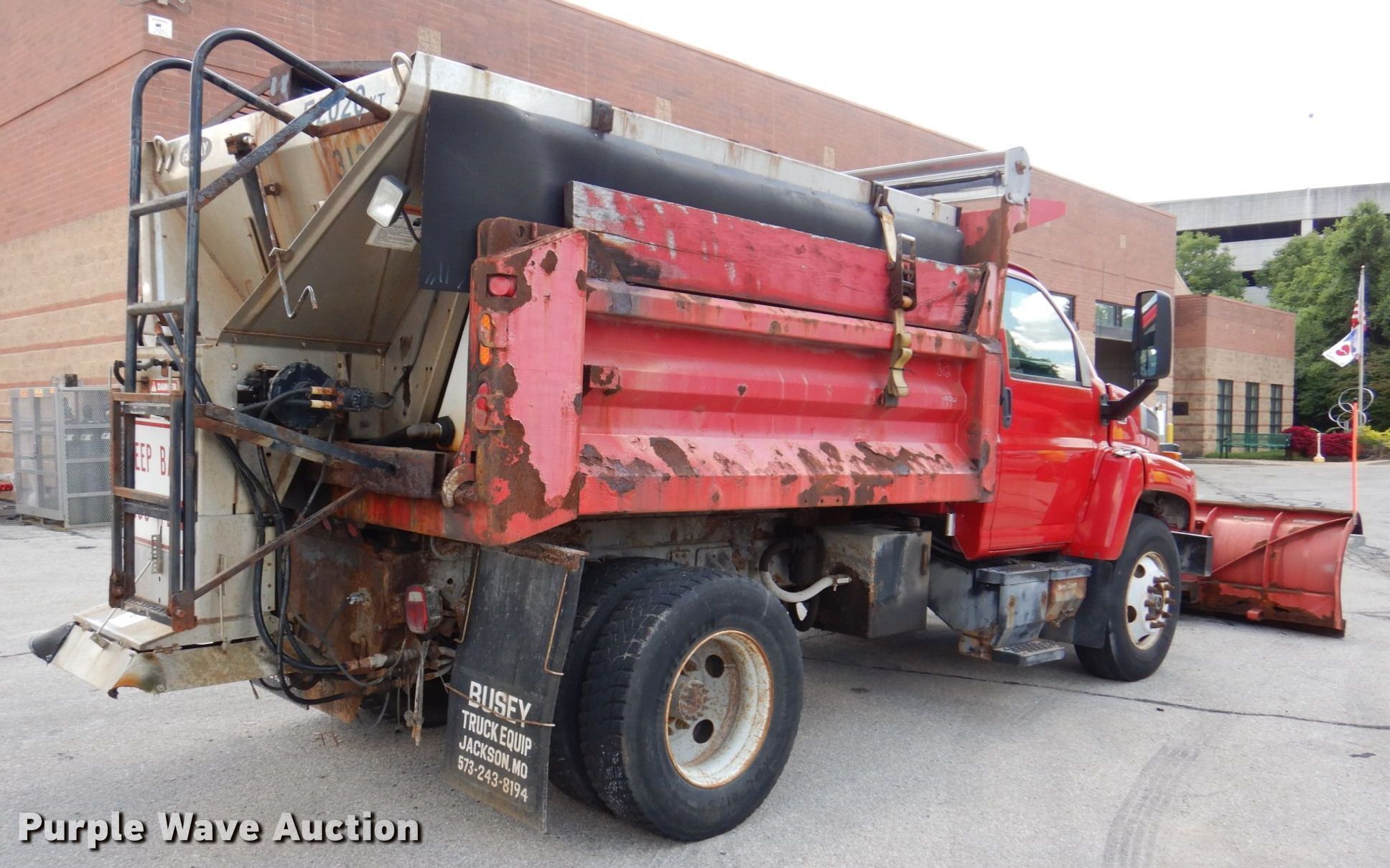 2008 GMC C7500 dump truck. Miles: 27,337 on odometer, VIN: 1GDM7C1B38F412710, Unit #: 312. Engine Isuzu 6HK1-TC, Displacement: 7.8L, Cylinders: 6, Fuel type: Diesel. Transmission Automatic. Chassis Double frame, Axles: Single, Differential lock: Full, Suspension: Spring, Brakes: Air, PTO, GVWR: 31,000 lbs FAWR: 12,000 lbs, RAWR: 19,000 lbs. Interior AC, Heat, Heated mirrors, Cruise control, Brake controller. Features Dump bed Crysteel, 10' L x 96" W, Side height: 30", Side board height: 12", Bed type: Steel, Ram: Single , End gate: Manual, Spreader Hiway E2020XT, Capacity: 5 cu.yd., Plow Boss, Width: 120". Tires Size: 11R22.5. Notes End gate unattached but included, Non-operational interior passenger door handle. Missouri title. City of Creve Coeur. Creve Coeur, MO 63141