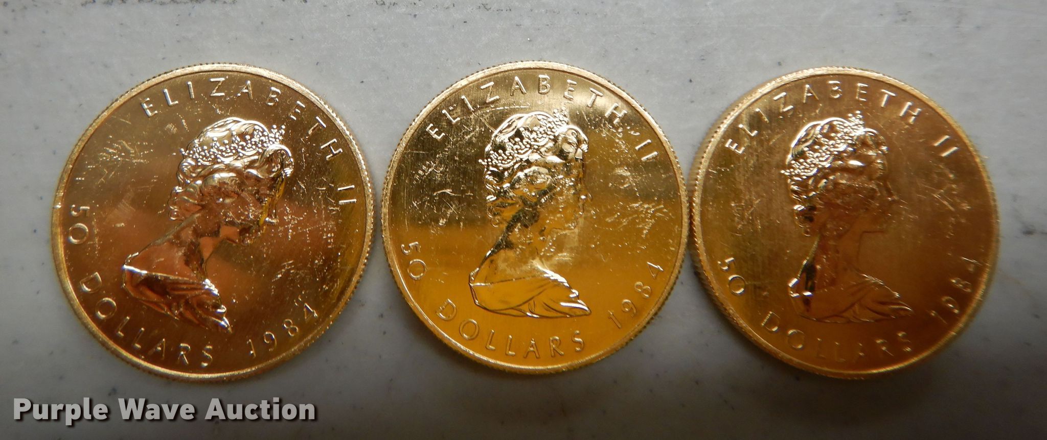 Purple Wave is selling a used All Other Household Items in Kansas. This item is a (3) 1984 Canadian $50 one ounce fine gold coins with the following: (3) 1984 Canadian $50 one ounce fine gold coins. Unable to authenticate. Purple Wave reserves the right to obtain additional buyer information prior to item removal.. Junction City, KS 66441