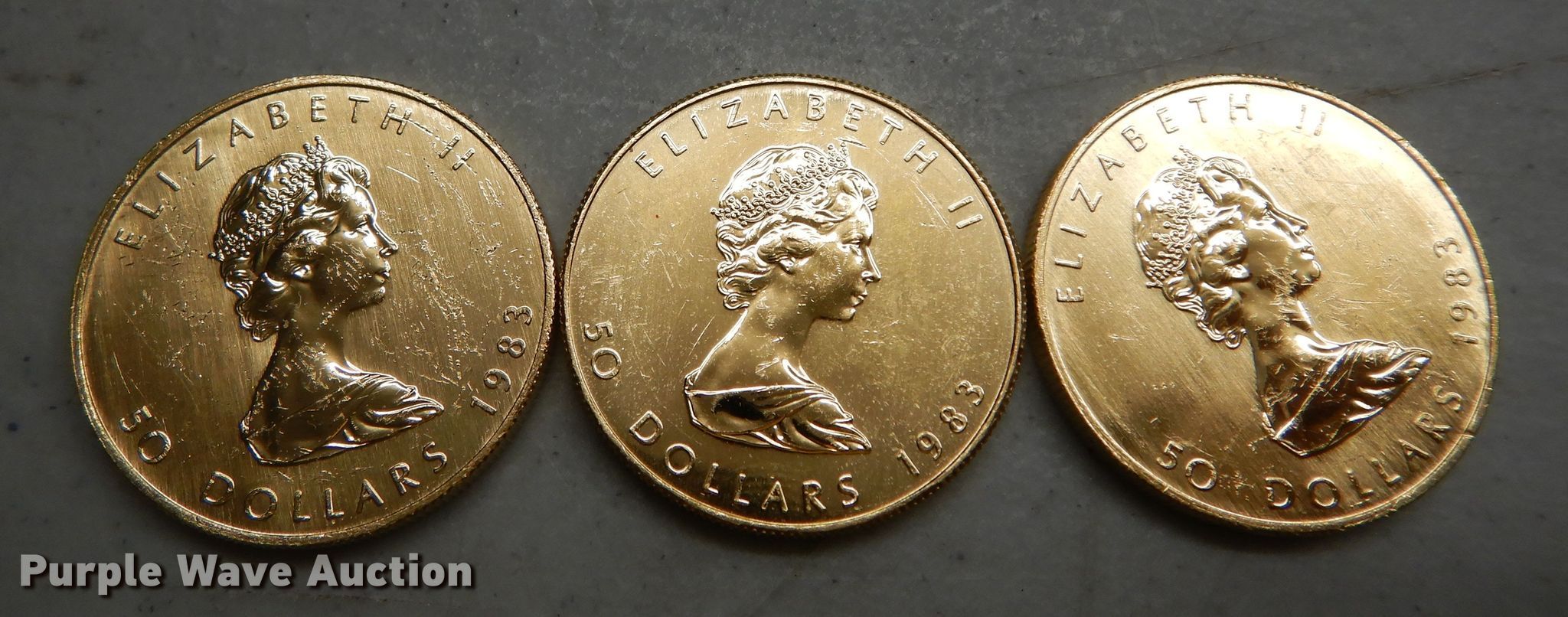 Purple Wave is selling a used All Other Household Items in Kansas. This item is a (3) 1983 Canadian $50 one ounce fine gold coins with the following: (3) 1983 Canadian $50 one ounce fine gold coins. Unable to authenticate. Purple Wave reserves the right to obtain additional buyer information prior to item removal.. Junction City, KS 66441