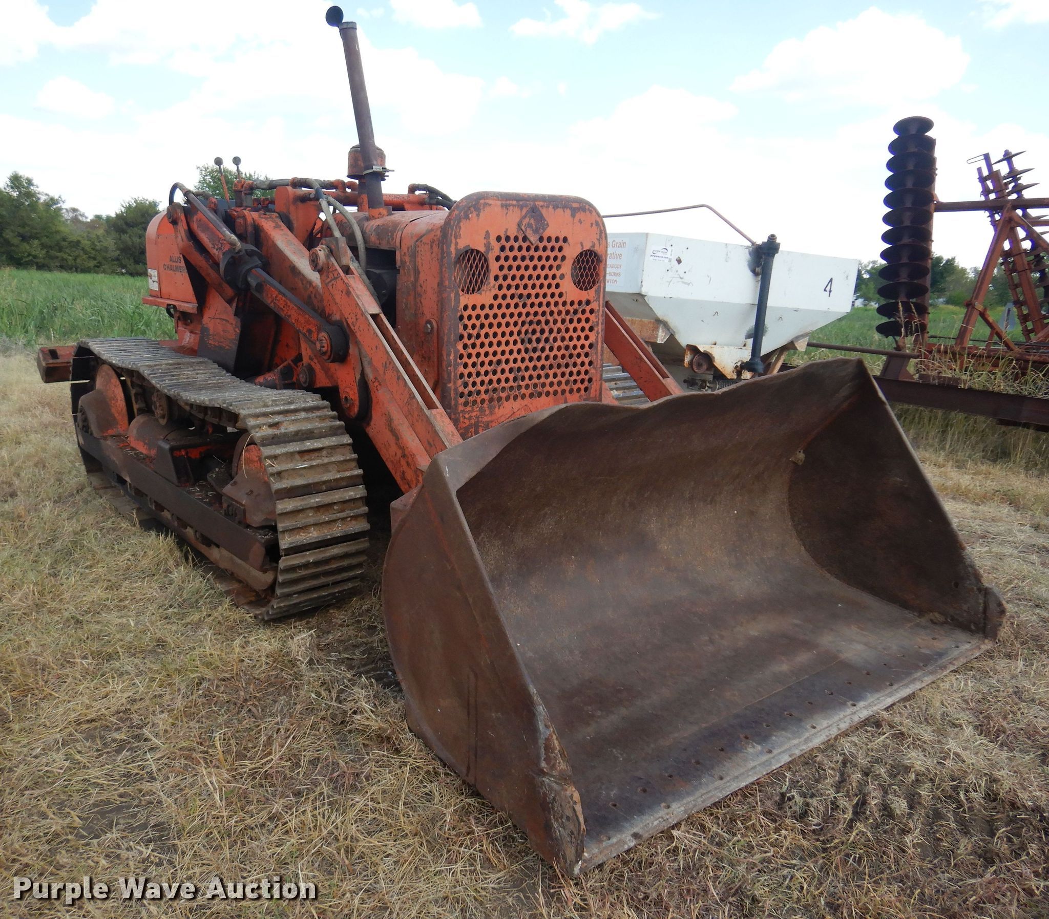 Allis Chalmers track loader. Serial: 1481. Engine Cylinders: 2, Fuel type: Diesel. Transmission Direct-drive, 4F - 1R. Operators station Bucket controls: Two-lever. Features Bucket Width: 75", Rear ripper Shanks: 1. Tracks Width: 13", Grouser pads: Triple. Udall, KS 67146