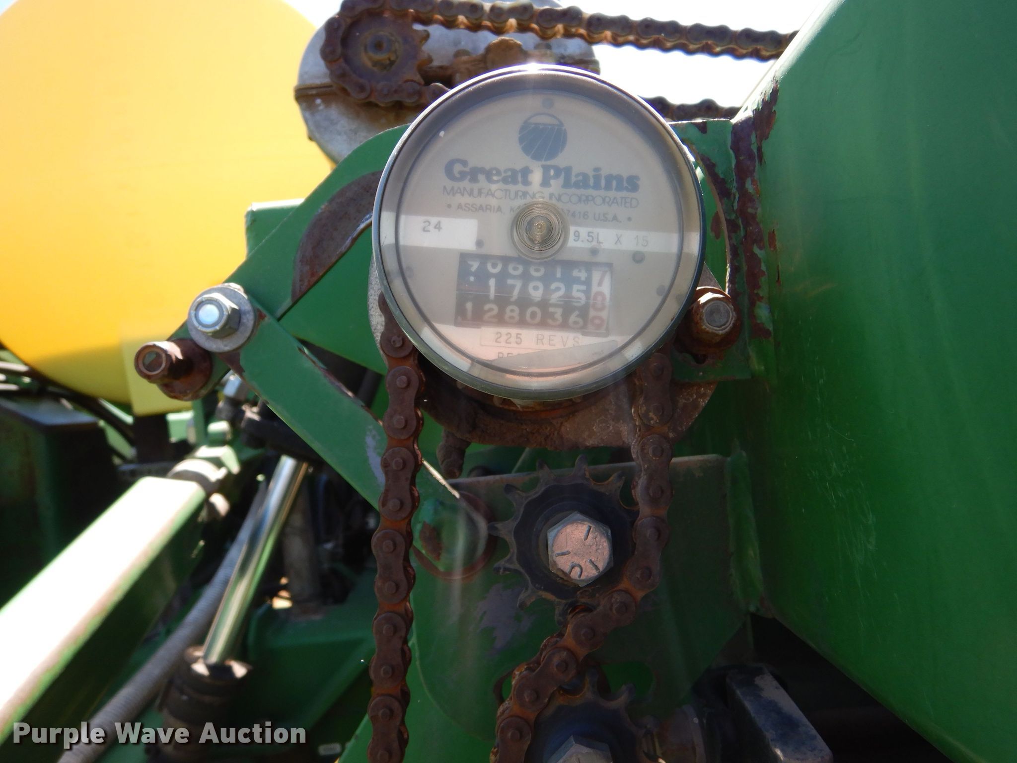Great Plains Solid Stand 24 no-till grain drill. Width: 24', Row units: 28, Row spacing: 10", Serial: P-C1166. Features Frame Front fold, Seed delivery Bulk fill system, Row units Meter drive: Ground, Down pressure: Spring, Disk openers: Double, Closing system: Single Type: Rubber, Fertilizer/ insecticide Fertilizer Liquid capacity: 300 gallons, Pump Pentair Shurflo 5059-1310-D011.. Tires Transport tire size: 9R22.5 Quantity: 4, Drive/ outside tire size: 11L-15 Quantity: 2. Assaria, KS 67416