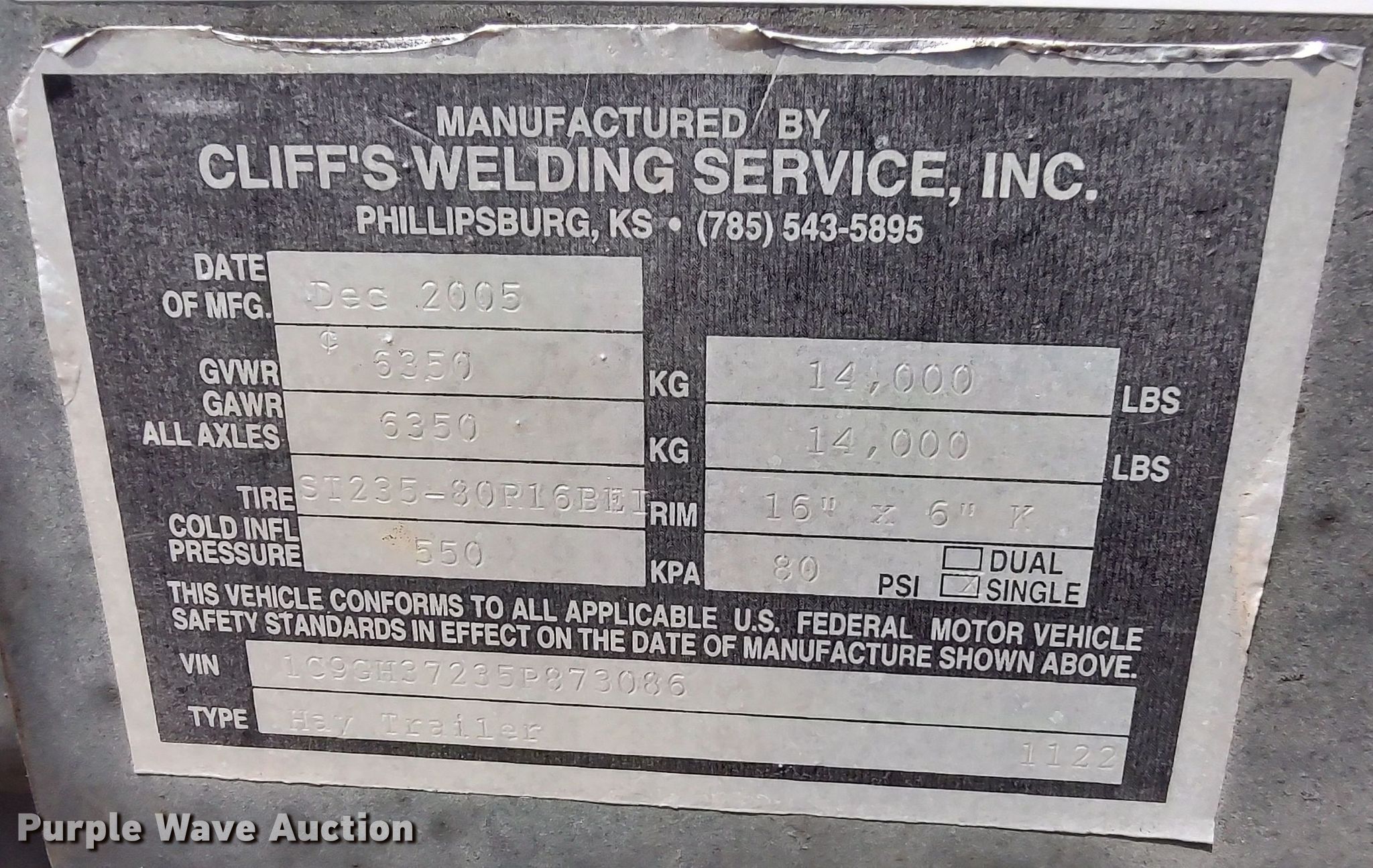 2006 Pride of the Prairie hay bale trailer. VIN: 1C9GH37235P873086, Claim #: 2-808408. Dimensions Overall: 36' L x 70" W, Body: 29' L x 70" W. Features Body type: Steel. Chassis Hitch: Gooseneck, Suspension: Spring, Axles: Tandem. Tires Size: 235/85R16. Notes Collision damage, Unknown operating condition. Oklahoma title. Oklahoma Farm Bureau Insurance. 16901 North Council Road. Edmond, OK 73012