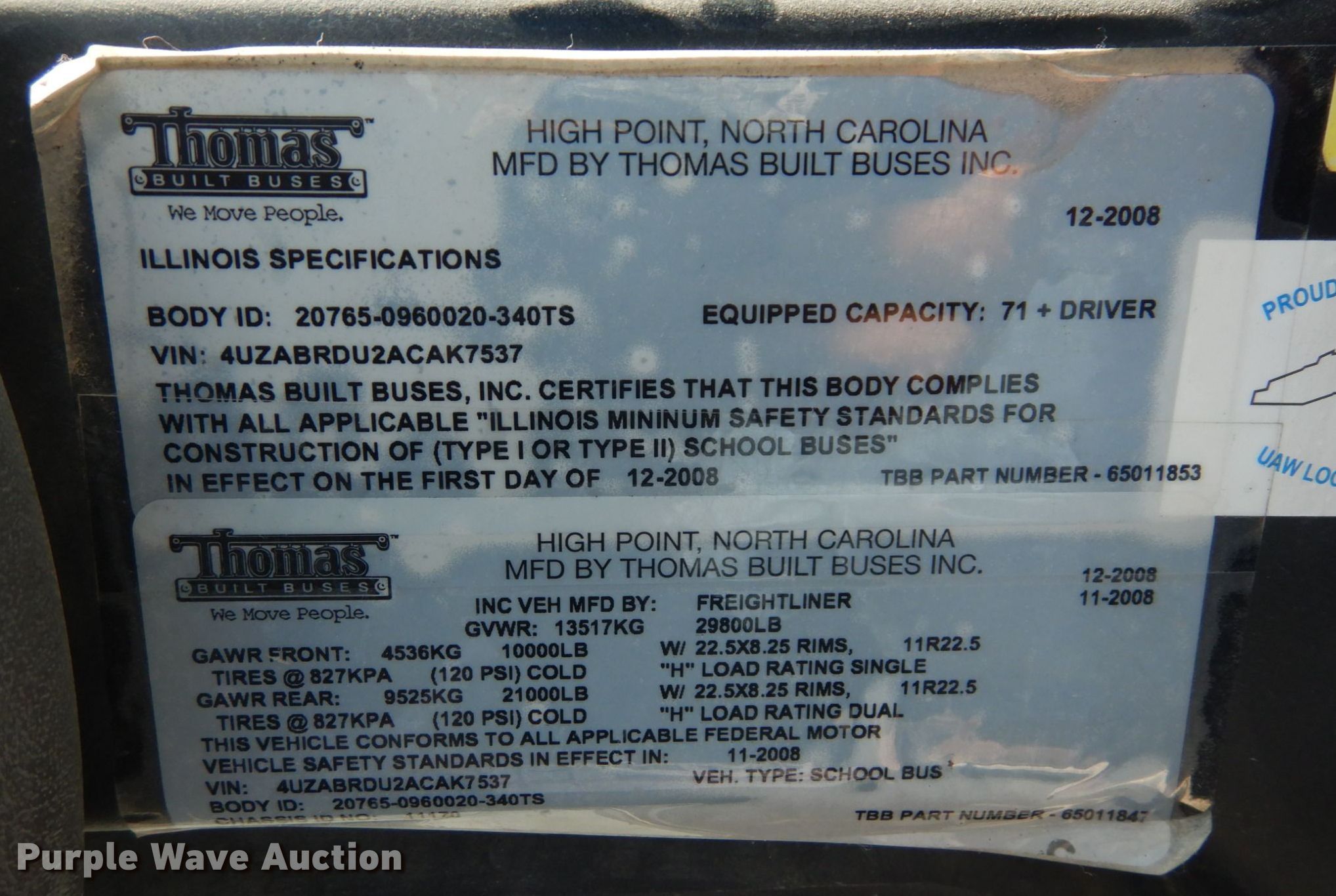 2010 Freightliner B2 school bus. Miles: 158,233 on odometer, Hours: 6,665 on meter, VIN: 4UZABRDU2ACAK7537. Engine Cummins, Displacement: 6.7L, Cylinders: 6, Fuel type: Diesel. Transmission Automatic. Chassis Axles: Single, Suspension: Spring, Brakes: Hydraulic, GVWR: 29,800 lbs. Interior Heat, Heated mirrors, Cruise control, Auxiliary controls, Passengers: 71. Tires Size: 11R22.5, Brand: Firestone. Notes Dash warning indicator: Brake, Check transmission. Kansas title. North American Central School Bus. 1705 Industrial Road. Paola, KS 66071