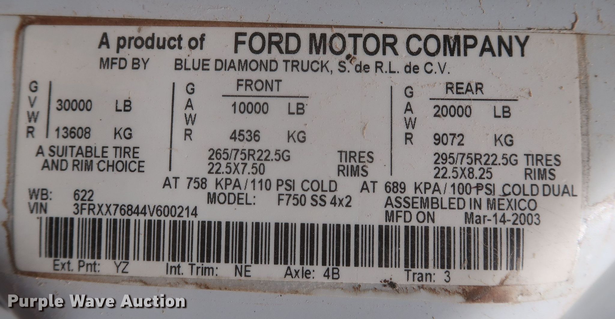 Purple Wave is selling a used Truck Chassis in Oklahoma. This item is a 2004 Ford F750 Super Duty Ext. Cab truck cab and chassis with the following: Miles: 179,301 on odometer, VIN: 3FRXX76844V600214, Unit #: 3-158