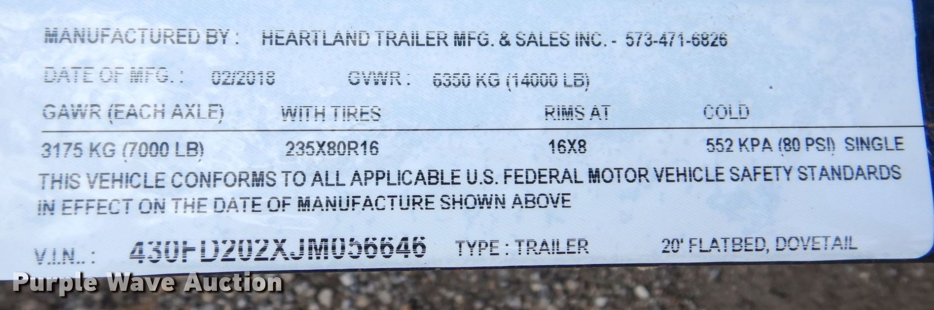 Purple Wave is selling a used Equip. Trailer in Missouri. This item is a 2018 Heartland Trailer Mfg. equipment trailer with the following: VIN: 430FD202XJM056646