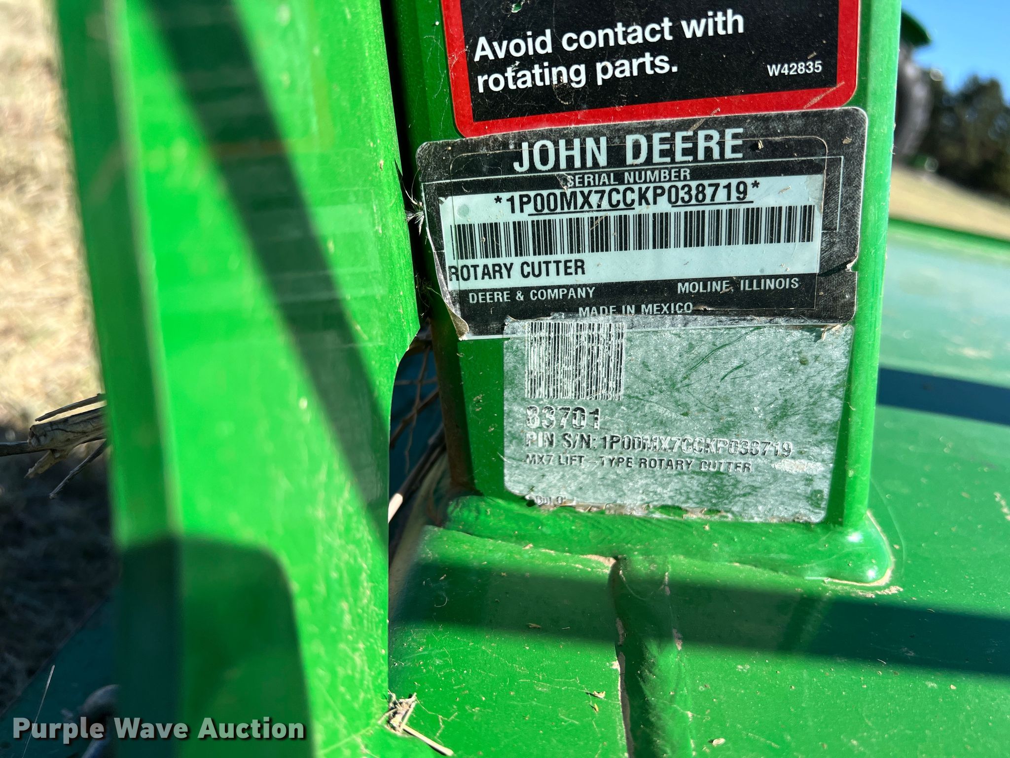 Purple Wave is selling a used Mower, Cutter, Shredder in Kansas. This item is a 2019 John Deere MX7 rotary mower with the following: Serial: 1P00MX7CCKP038719