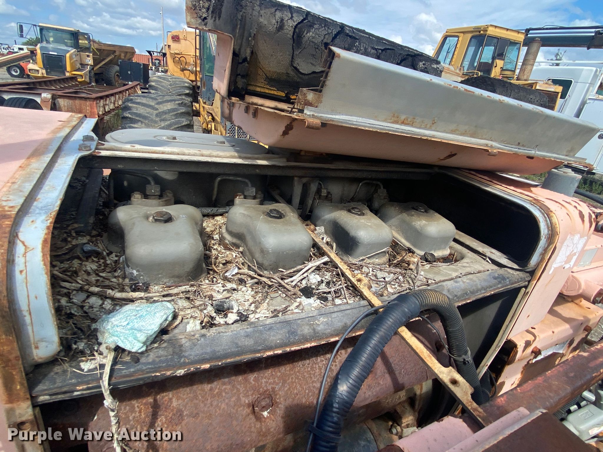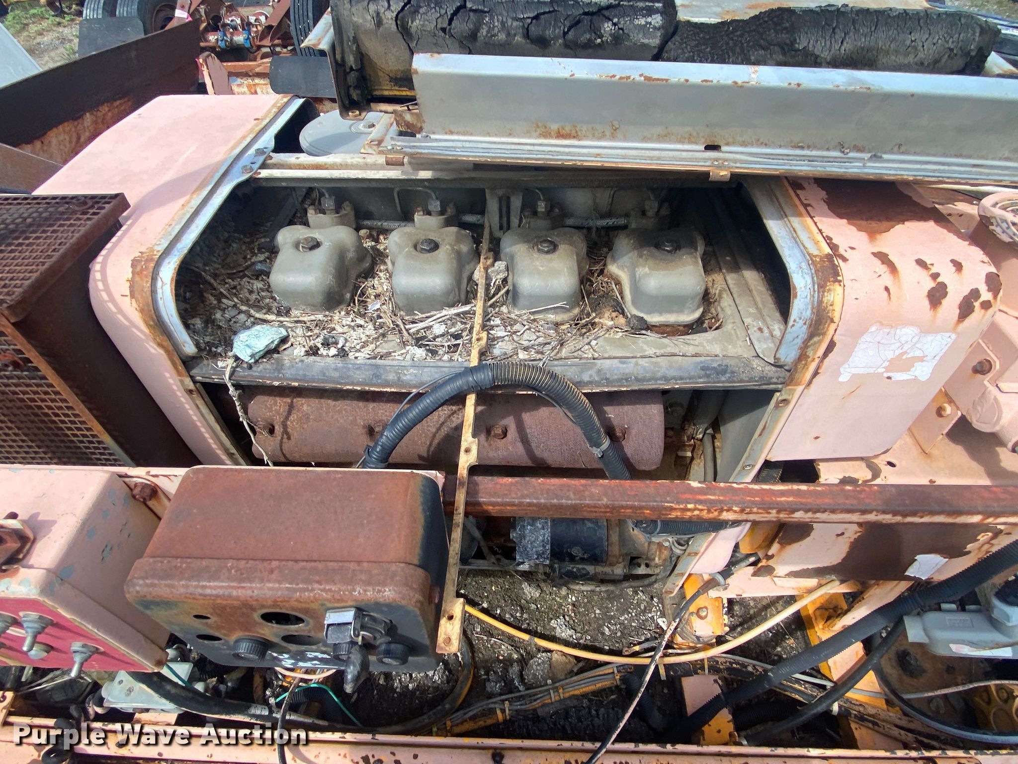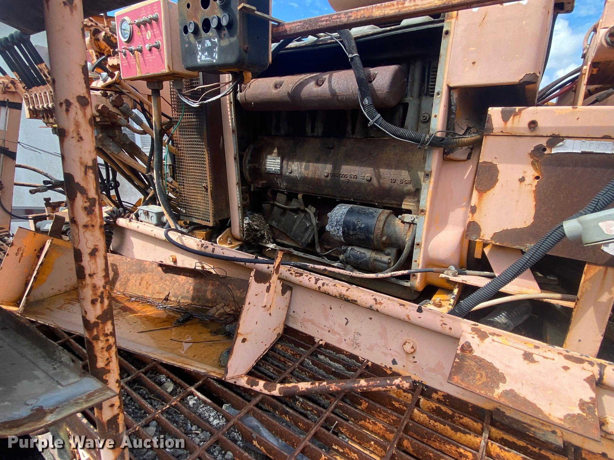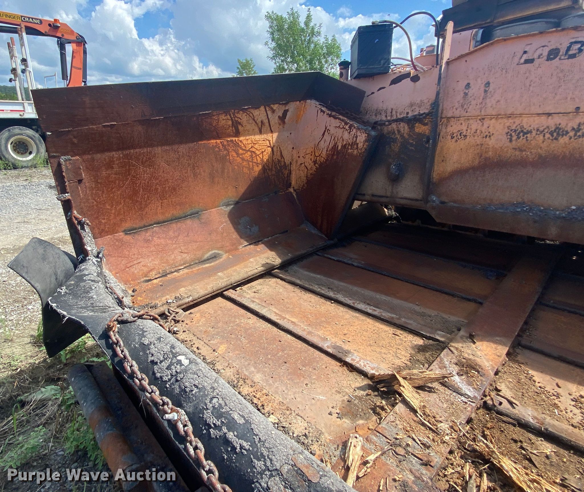 LeeBoy L8500T paver. Hours: Unknown, Serial: 1041299002171. Engine Cylinders: 4, Fuel type: Diesel. Transmission Hydrostatic. Features Screed, Paving width: 8' to 15', Screed heater: Propane, Front spread hopper width: 10', Material conveyor Width: 77". Tracks Width: 12", Steel. Notes Rodent damage Wiring harness damaged, Non-operational unit. Robinson Construction, LLC. Southwest Limestone Road. Wilburton , OK 74578