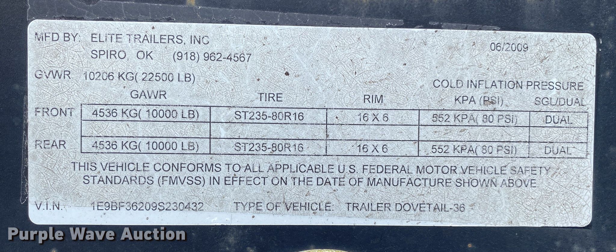 Purple Wave is selling a used Equip. Trailer in Oklahoma. This item is a 2009 Elite Trailers Dovetail-36 equipment trailer with the following: VIN: 1E9BF36209S230432