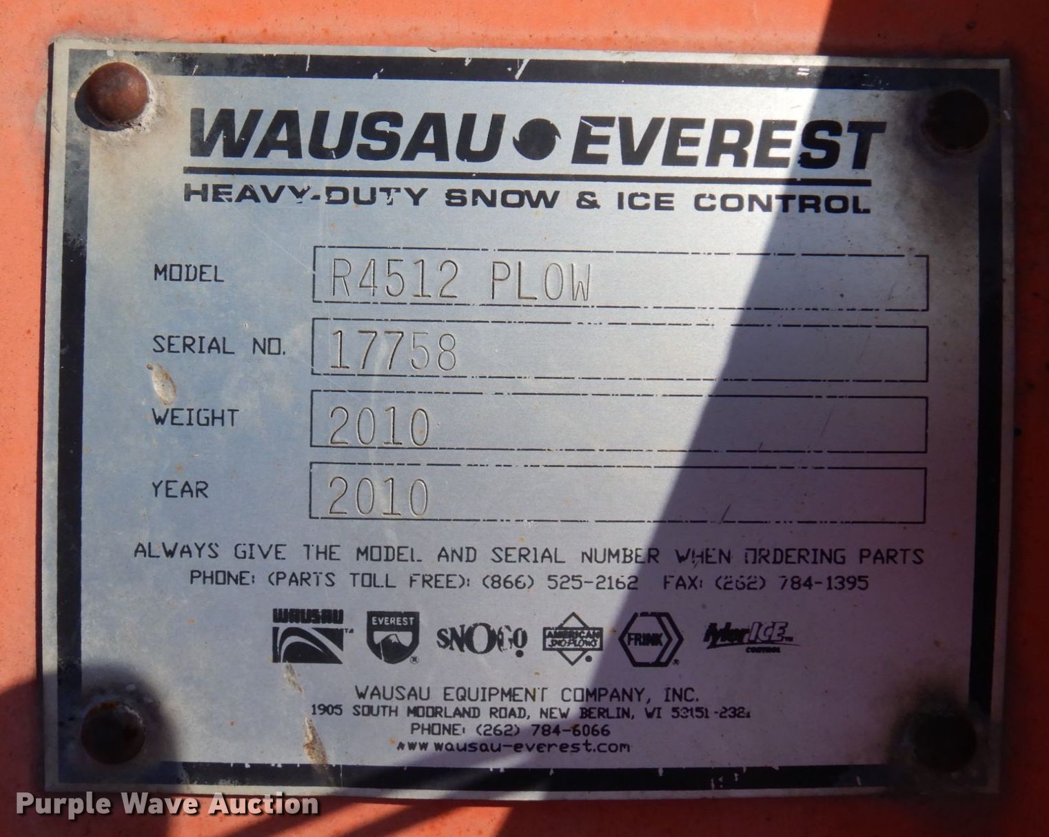 Purple Wave is selling a used Truck Part and Attach. in Minnesota. This item is a 2010 Wausau R4512 snow plow with the following: Serial: 17758