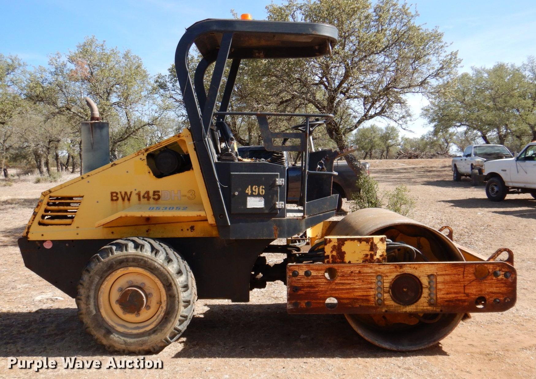 Purple Wave is selling a used Single Drum Roller Compactor in Texas. This item is a 2008 Bomag BW145DH-3 single drum vibratory roller with the following: Hours: 3,035 on meter, Serial: 901581481092