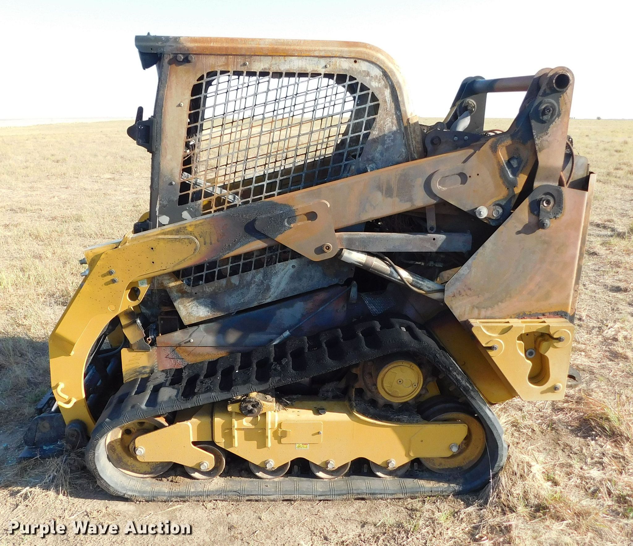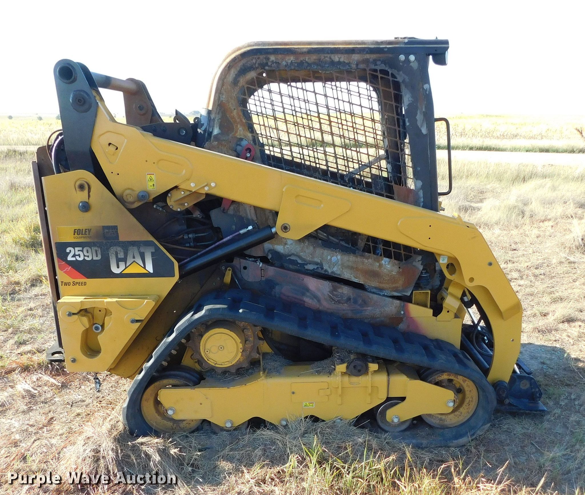 2017 Caterpillar 259D tracked skid steer loader. Hours: Unknown, Serial: FTL12658, Unit #: A85198F00. Engine Caterpillar, Cylinders: 4, Fuel type: Diesel. Transmission Hydrostatic, Two speed travel. Operators station Enclosed cab, Bucket control: Hand. Features Auxiliary hydraulics, Quick coupler: Hydraulic, Counter weights. Tracks Width: 16". Notes Fire damage, Non-operational unit. Farm Bureau Financial Services. Bazine, KS 67516