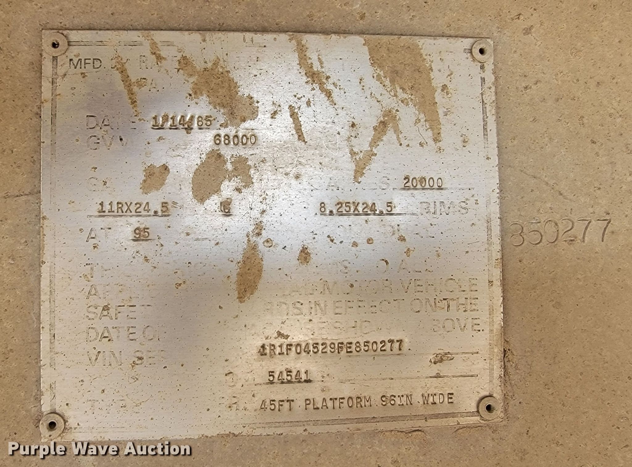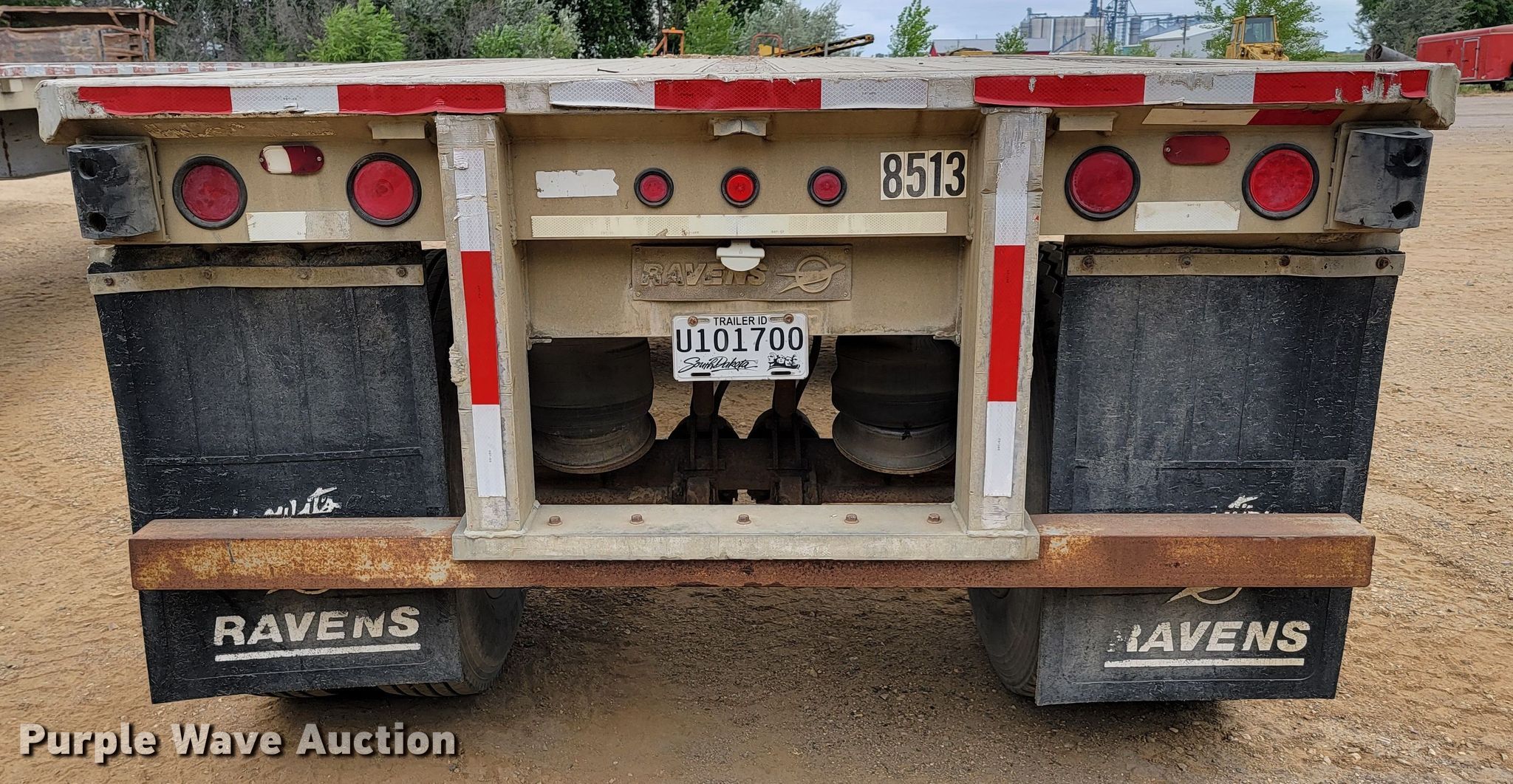 1985 Ravens flatbed trailer. VIN: 1R1F04529FE850277. Dimensions Overall: 45' L x 96" W, Deck height: 5'. Features Deck type: Aluminum. Chassis Landing gear: Dual, Suspension: Air, Brakes: Air, Axles: Spread, GVWR: 68,000 lbs, GAWR: 20,000 lbs. Tires Steel wheels, Size: 11R24.5. Notes King pin issues, bent. South Dakota title. B & B Contracting Inc... 711 392nd Ave S. Aberdeen, SD 57401